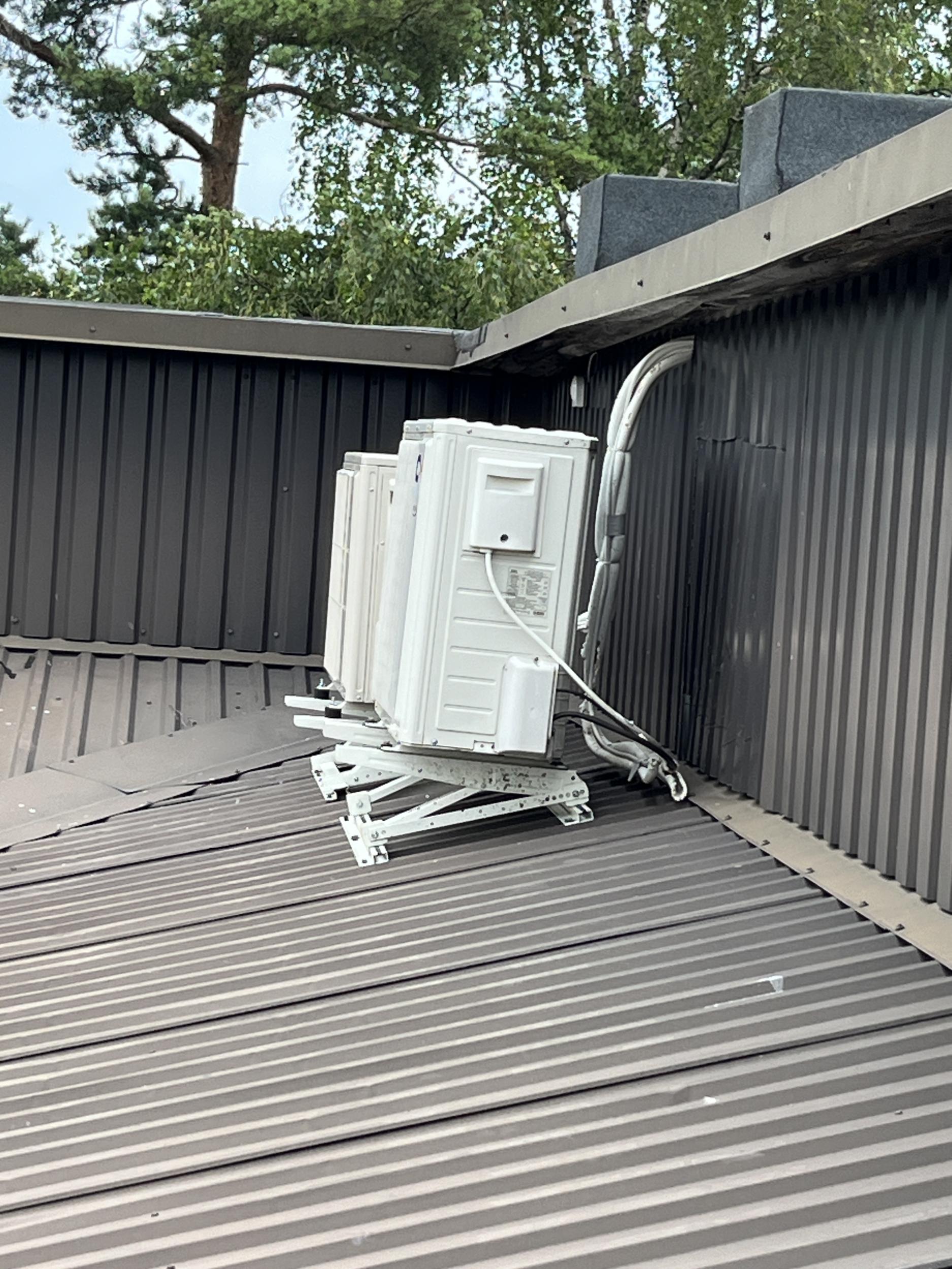 Tööle on lisatud kaks pilti, üks on õhksoojuspumba välisosa mõõtudest ja teine on töö sisuks oleva soojuspumba välisosast maja tagant. Tähtis osa on, et soojuspump ei ole paigaldatud seina peale vaid katuseraamiga.