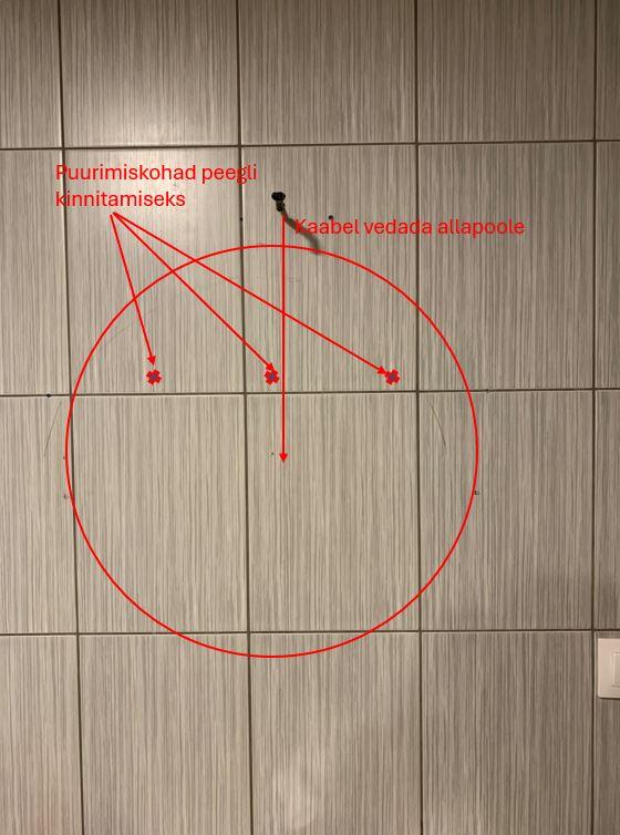 Soovin kinnitada valgustusega peegli vannitoa seinale. Peegli paigaldamiseks tuleb puurida kolm auku vannitoa plaatidesse (nagu on märgitud fotol) ja seejärel paigaldada riputusalus. Elektriühenduse jaoks on ülal kaabel, mis tuleks suunata allapoole, peegli taha.