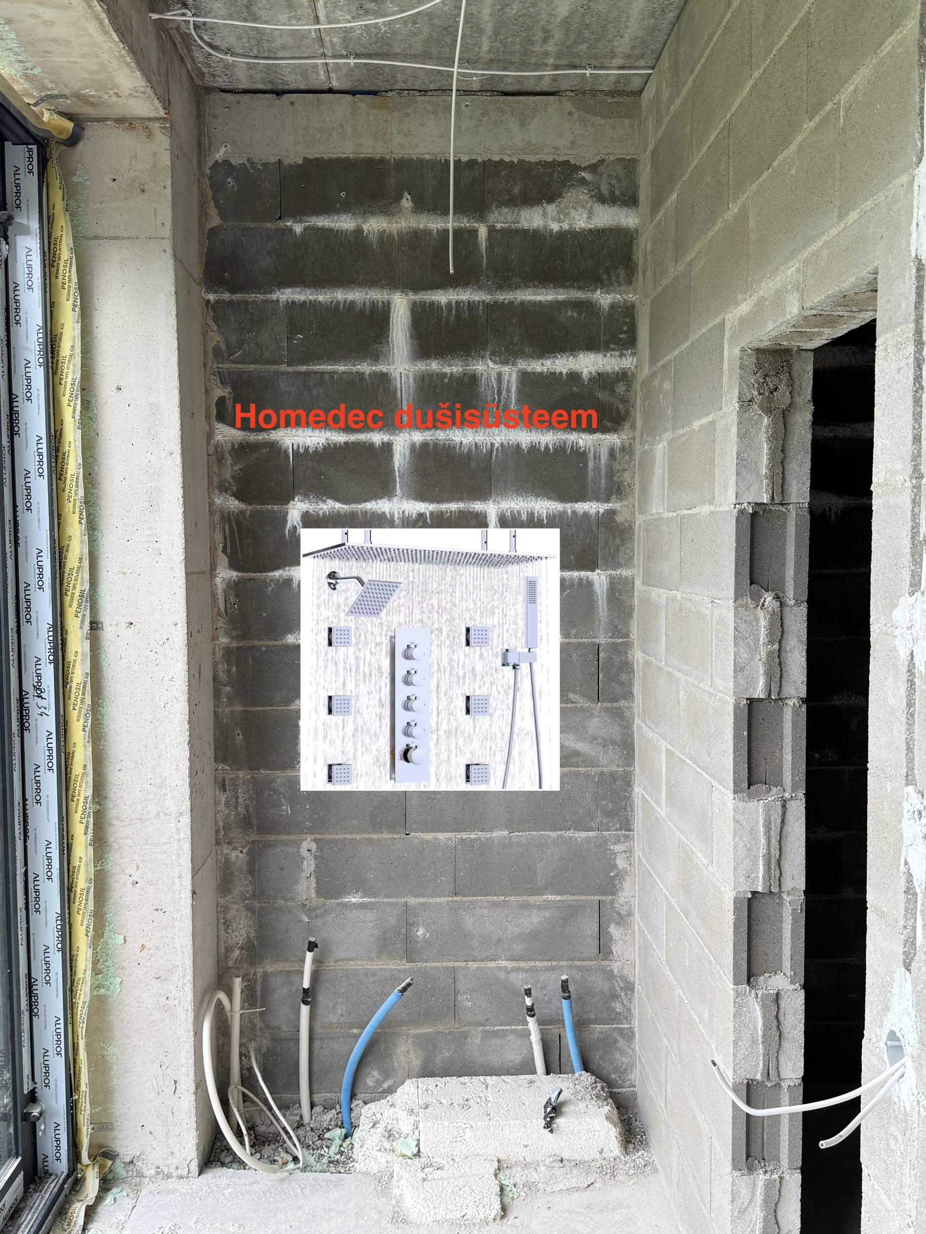 On vaja paigaldada seina sisse tulevase dušisüsteemi torustik. Süsteem koosneb viiest osast: laedušš, seinadušš, käsidušš, seinadüüsid ja segisti. Sein on ehitatud Framm 240 plokist (sarnane Columbia plokile). Tuleb teha vajalikud sooned ja paigaldada torud ja nende otsikud nii, et pärast viimistlust oleks võimalik dušisüsteem paigaldada.