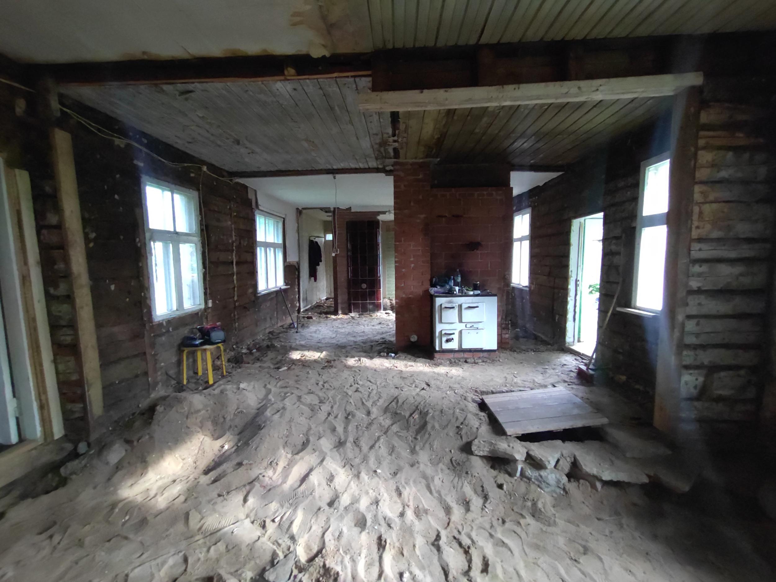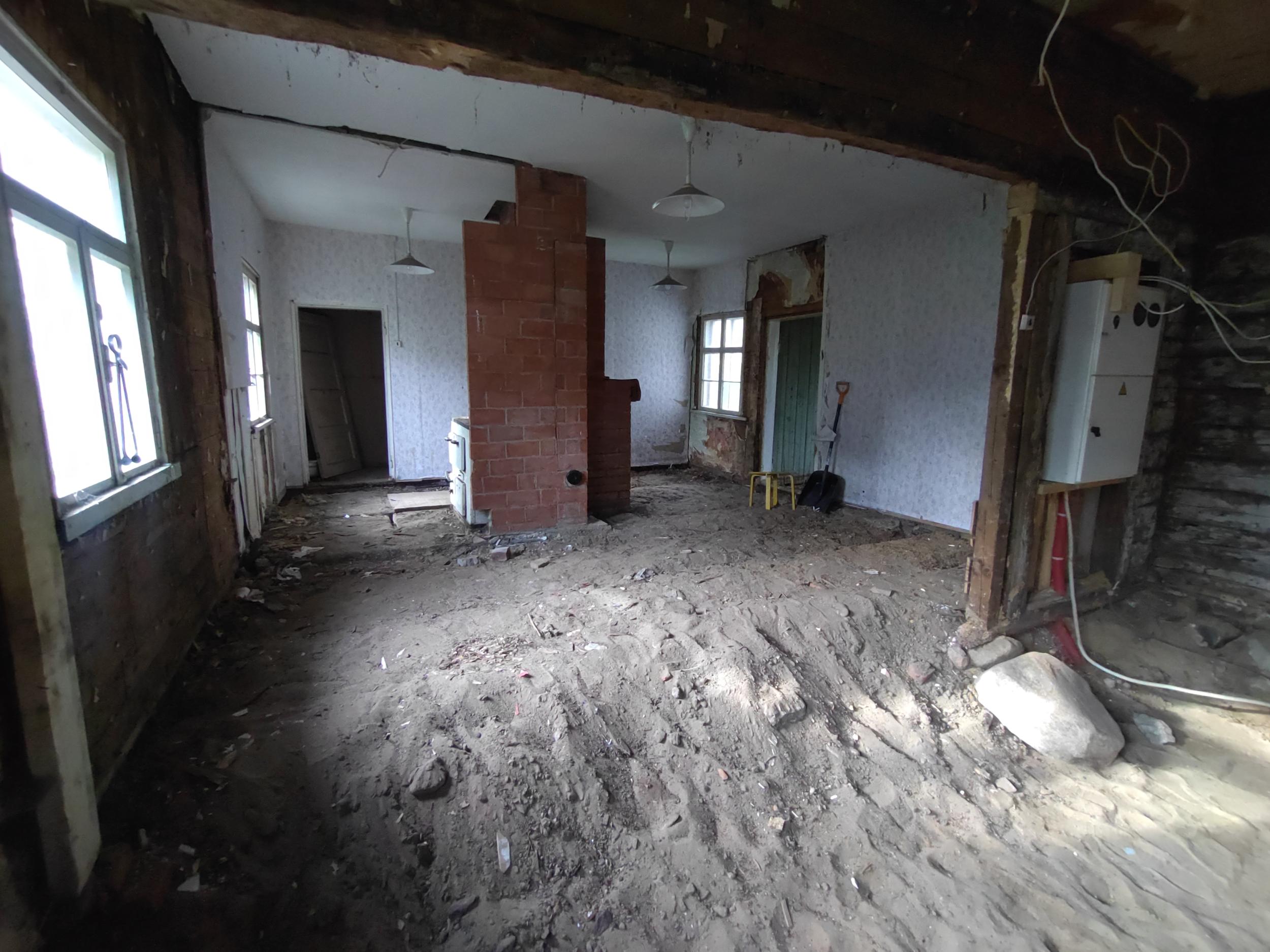 Madalvundmendiga majale vaja uus põrand teha ( ca 105 m2) Vanad põrandad ja pinnas on eemaldatud ca 30 cm sügavusele. Vaja on "londiga" seguautot - masin ei saa tulla päris maja kõrvale, vaid ca 10-15 m kaugusele. Pildil nähtavad vaheseinad on enamalt jaolt eemaldatud.