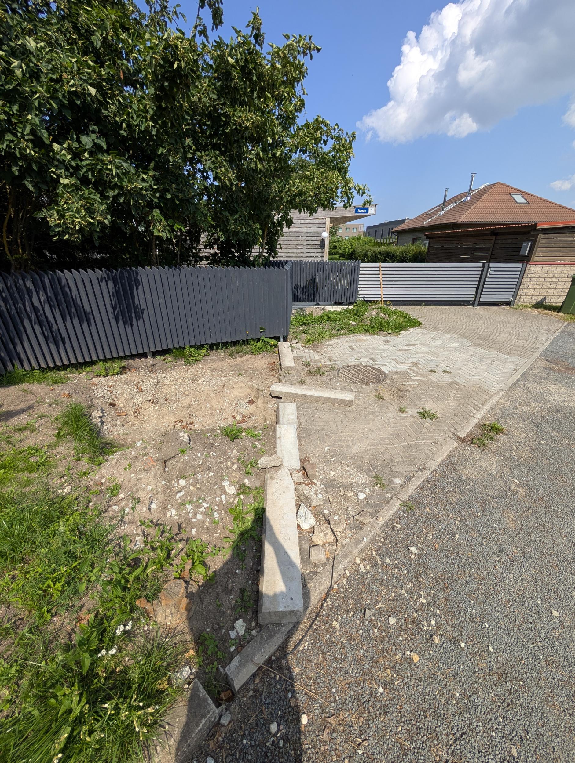 Soovin aiaesise sillutise parandust ja suurendamist nagu näha piltidel ja joonisel. Kasutaks ära võimalikult palju olemasolevat materjali. Vaja on luua / korrastada ka aluspind. Ebavajalik pinnas ja materjalid utiliseerida. Töö ja materjali hinna võib tuua eraldi. Sillutiskivide ja äärekivide hinna võib jätta hinnaguliseks, kuna raske hinnata palju saab kasutada olemasolevat ja palju on vaja juurde.