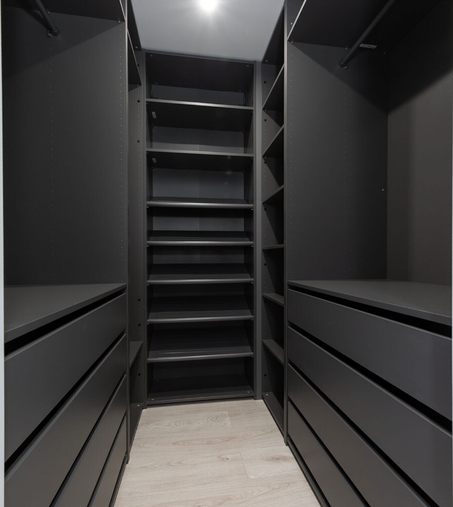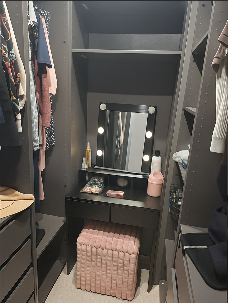 Oleks soovi muuta walk-in garderoobi jalanõu riiul hoopis meigilauaks. Visuaalina lisatud milline jalanõu riiul enne välja nägi. Milline see vahemik nüüd praegu on (peegliga) ja mis ma AI lahendusena visuaaliks välja tõin. Võimalusel võiks olla built-in lahendus, samas toonis (anthracite gray).