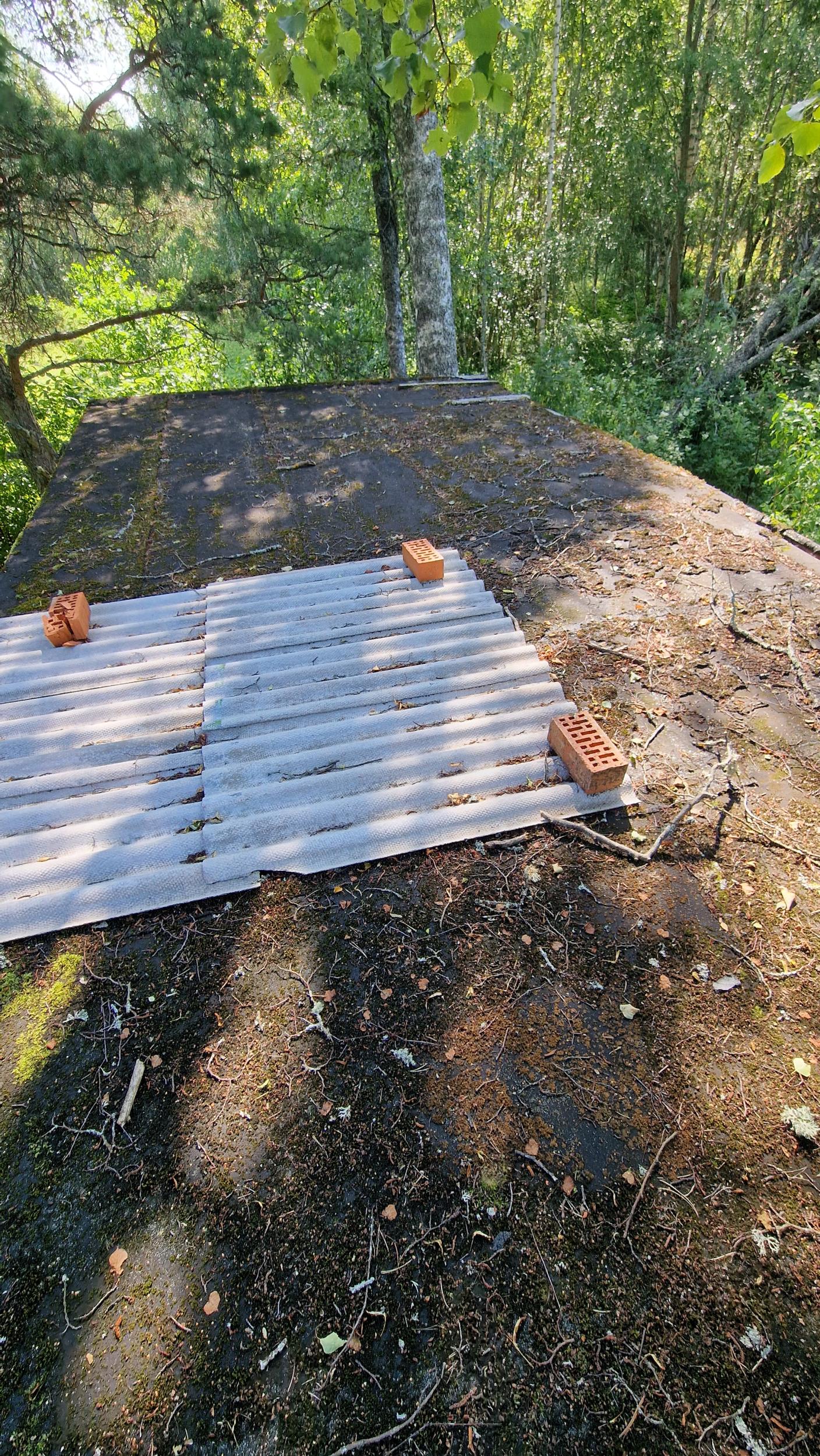 Tere. Pakkumine uue kvaliteetse Soome 5.0 sbs rullmaterjali paigaldusele töö ja materjal koos pruunide servaplekkidega. Kui on huvi paigaldame ka pvc materjali, aga seda ei soovita kuna teie katus asub vanade puude all ja pvc pole