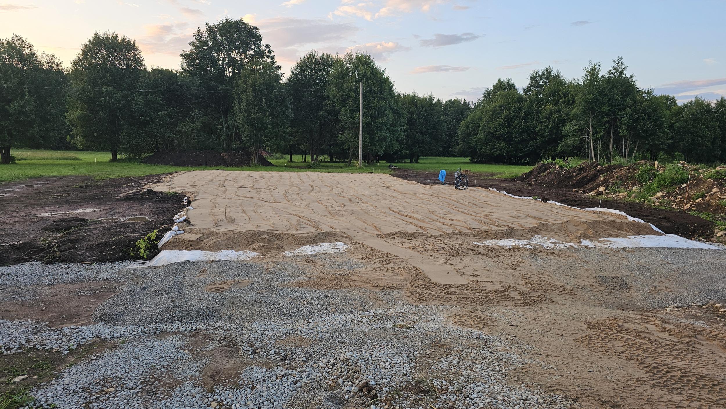 Muld eemaldatud, patsutatud killustiku põhi all, kangas peal, kanga peale peaks tulema 20 cm paksune liivakiht, hetkel on puusalt öeldes ca 90% liiva platsile ära veetud ja patsutatud.