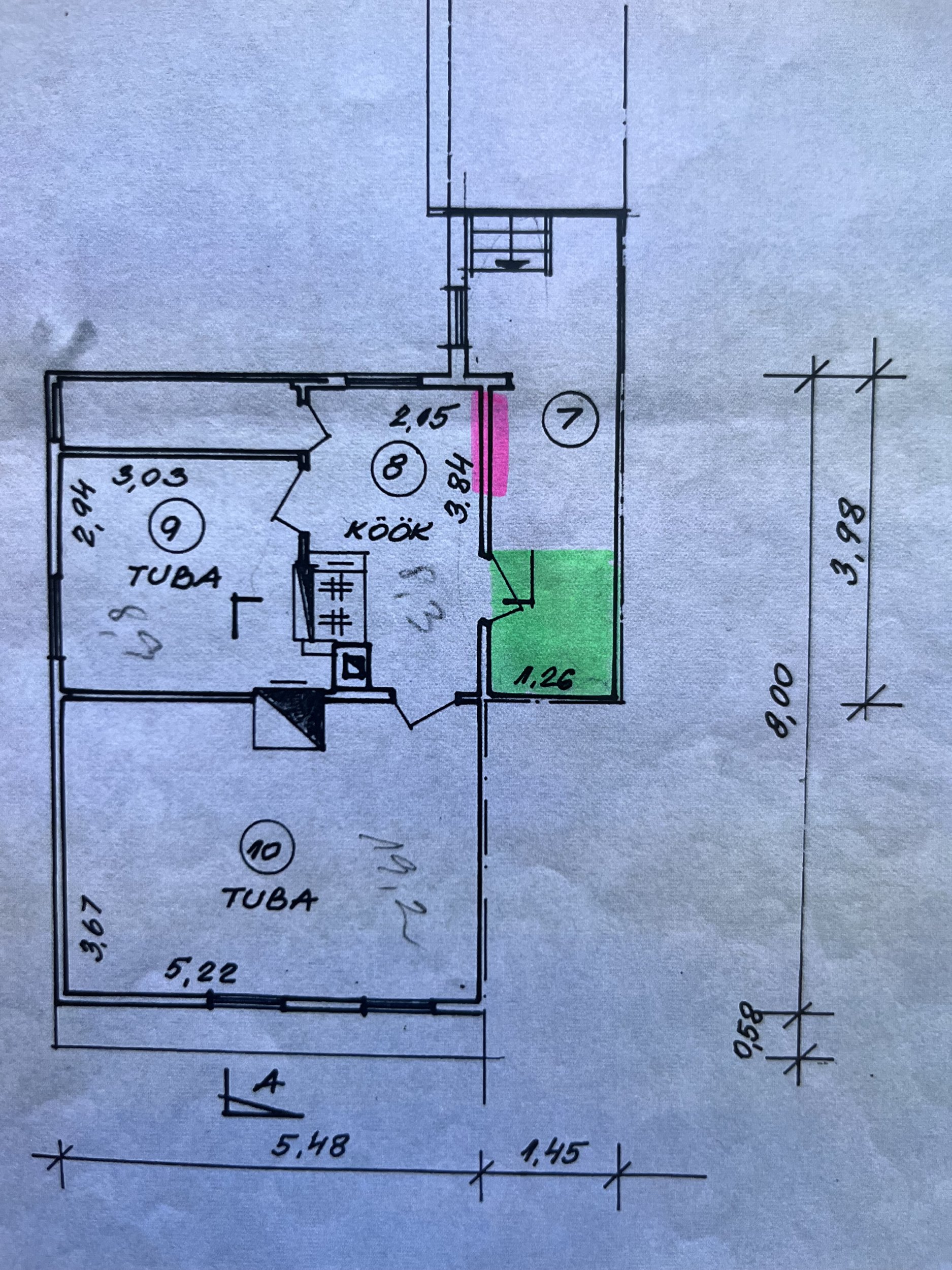 2. vannitoa väljaehitamine (pildil roheline osa) - hetkel korteris puudub pesemisvõimalus, kuid vesi/kanalisatsioon on köögis olemas