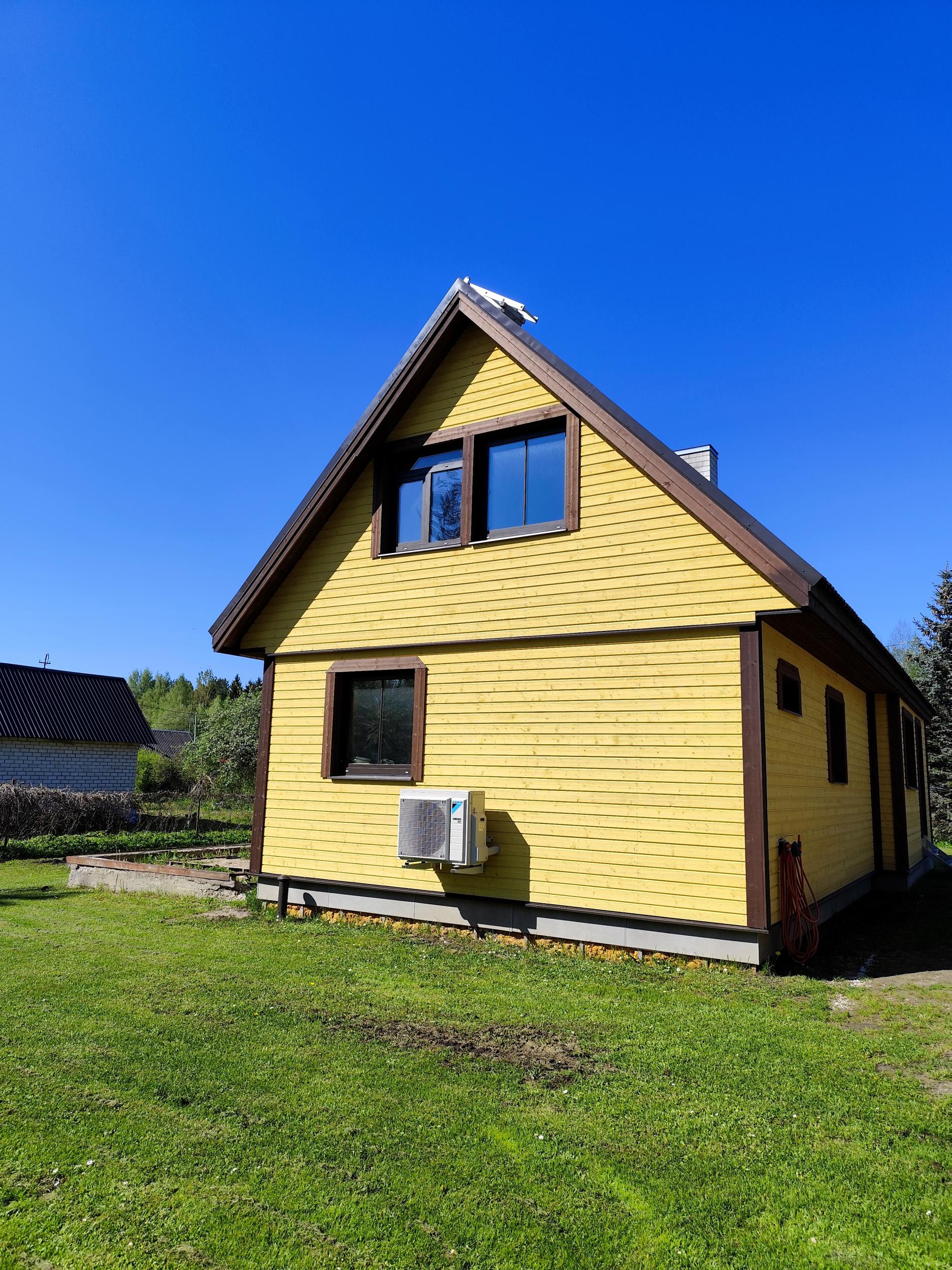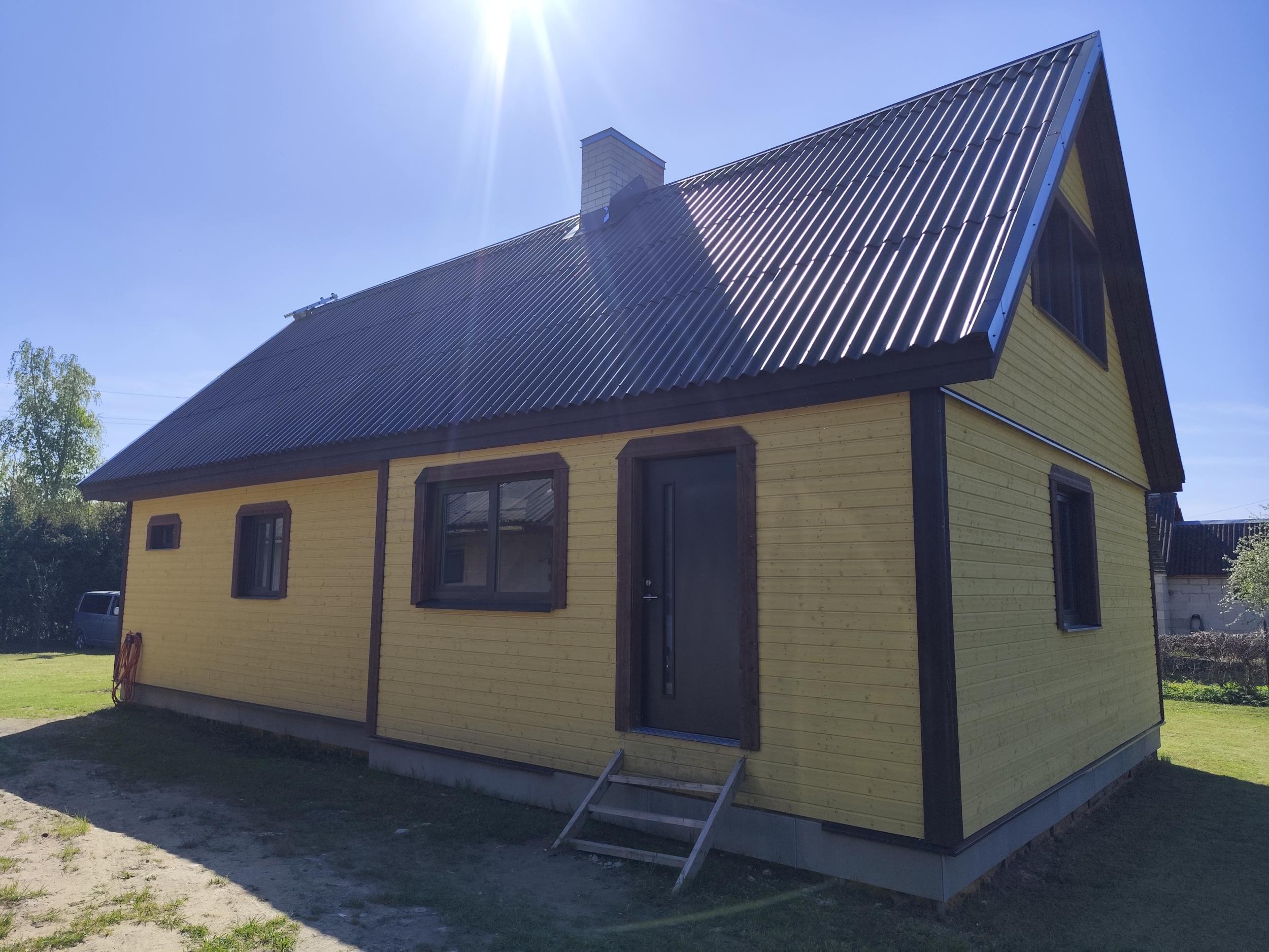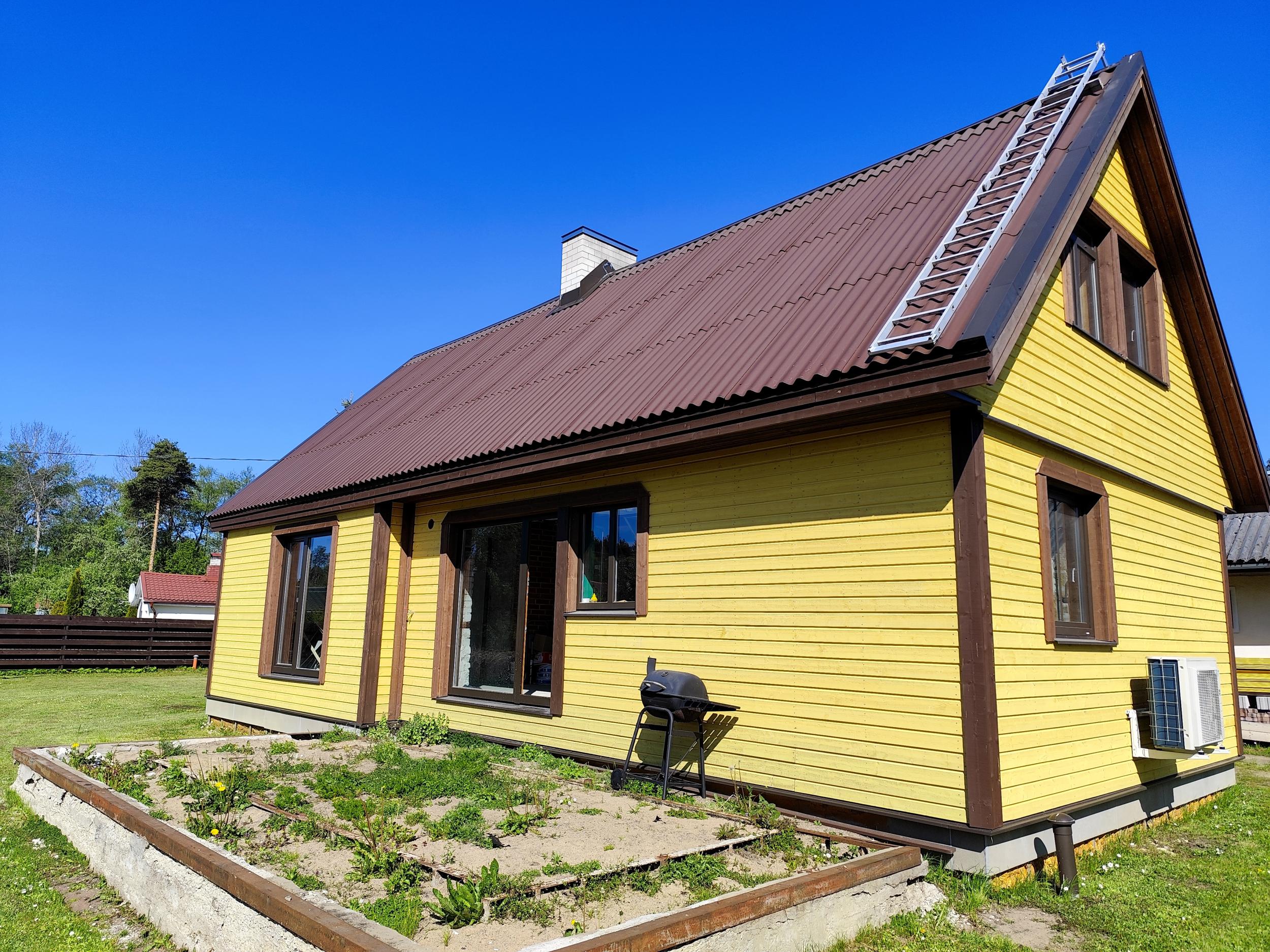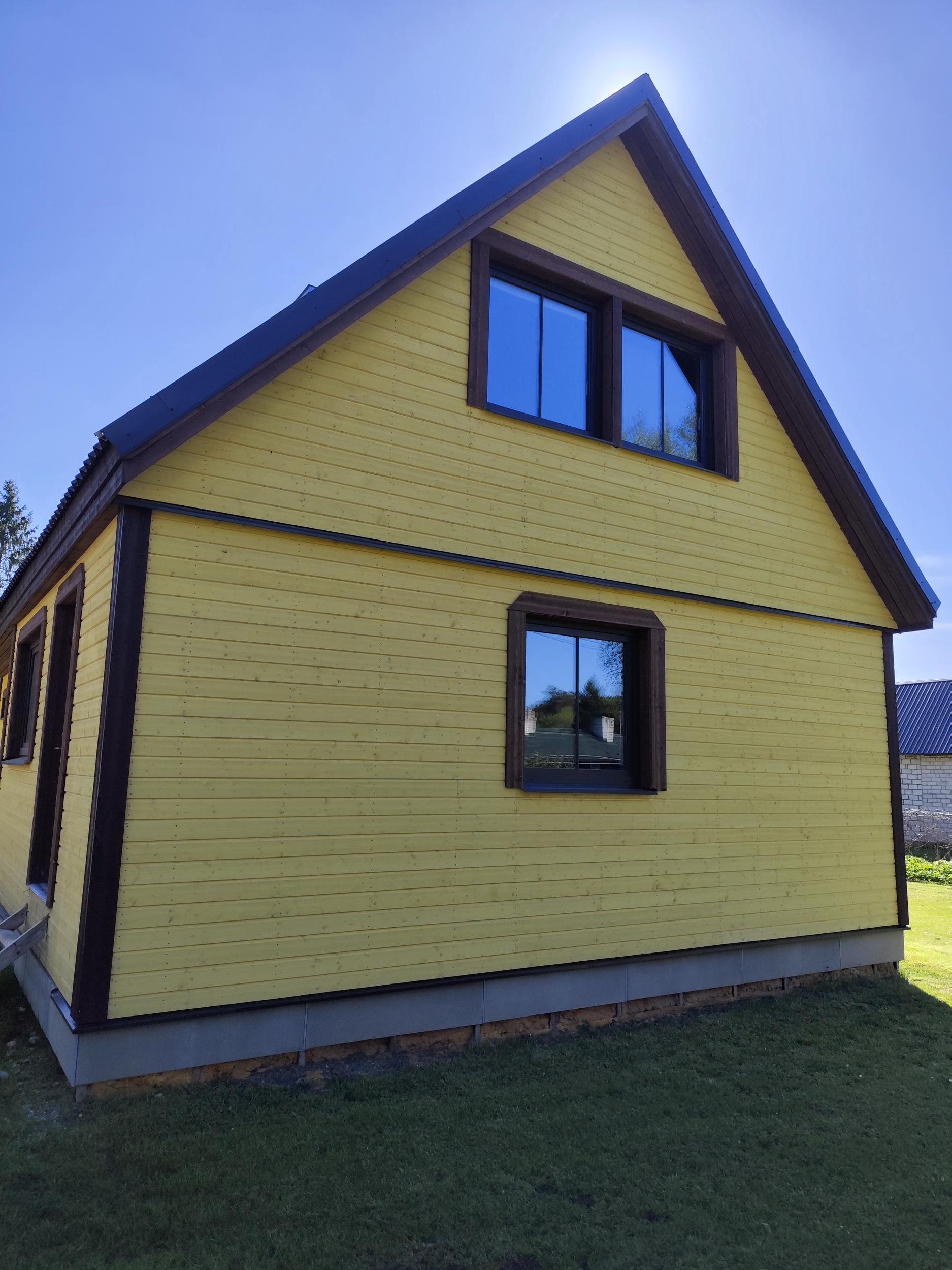 Maja teise kihi värvimine, nii pruun kui kollane osa ning peale seda vihmaveerennide paigaldus.