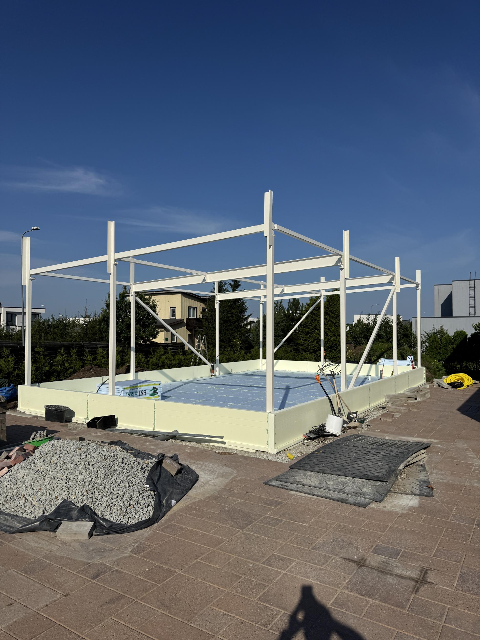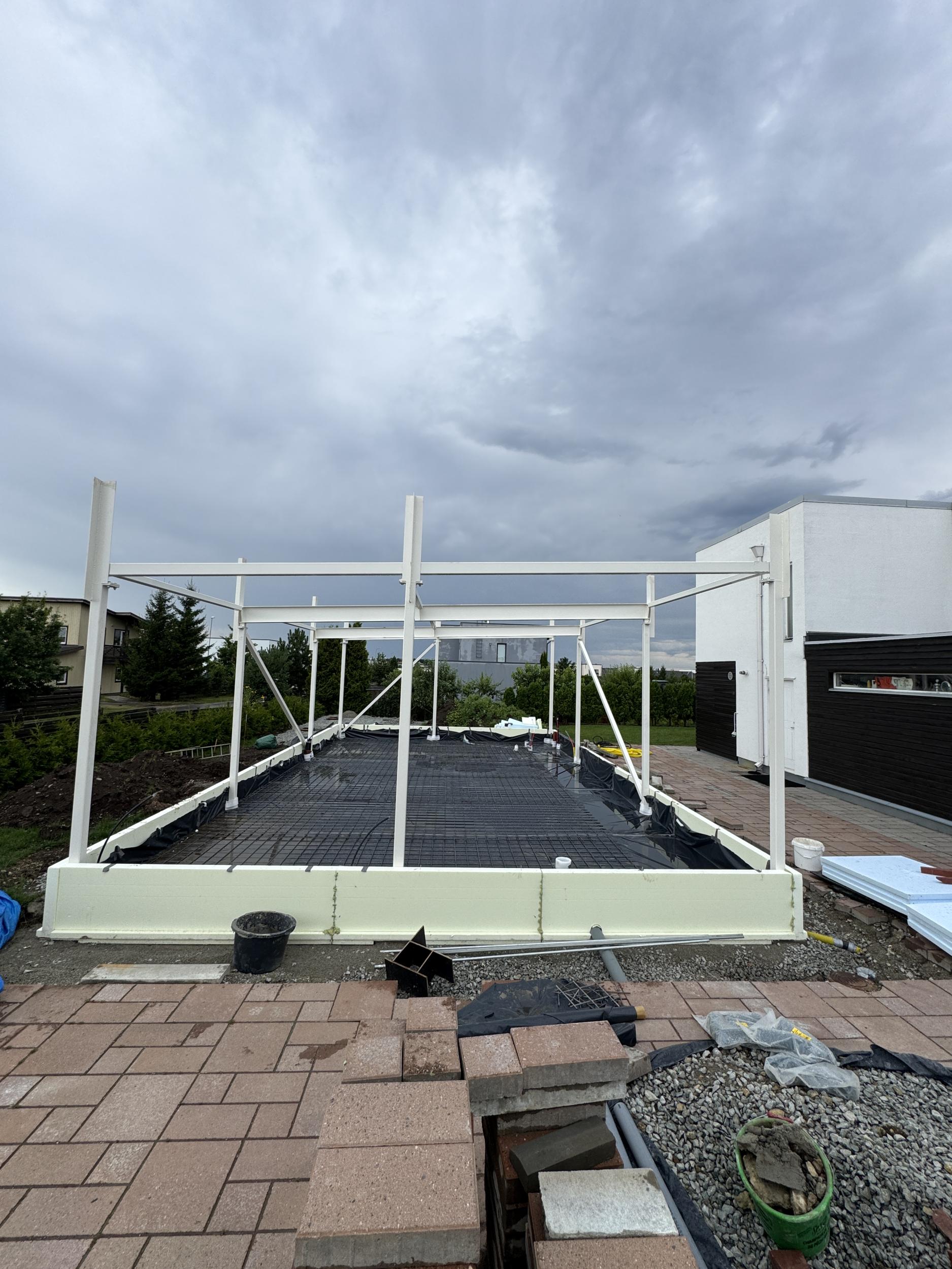 Lamekatuse ehitus. Parapetiplekkide paigaldus, vihmaveetoru paigaldus. Kandev profiil on katuse ehituse ajaks paigaldatud.
