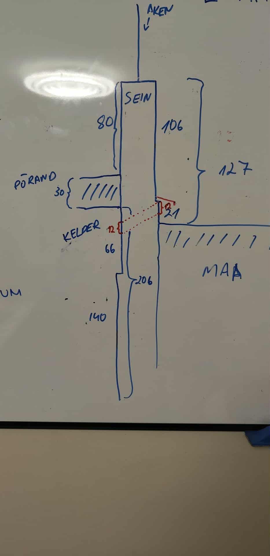 Raskus on selles, et keldri kõrgus on napilt üle maapinna (vt skeem), mistõttu tavalise otse augu puurimisel võib välisseina poolne ots olla liiga lähedal maapinnale. Minu pakutud lahendus (skeemil) on puurida nurgaga. Olen avatud ka muudele mõtetele.