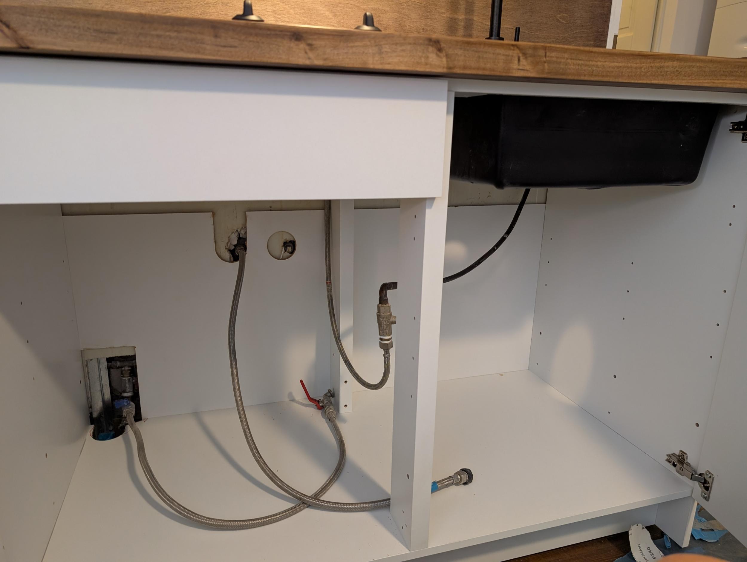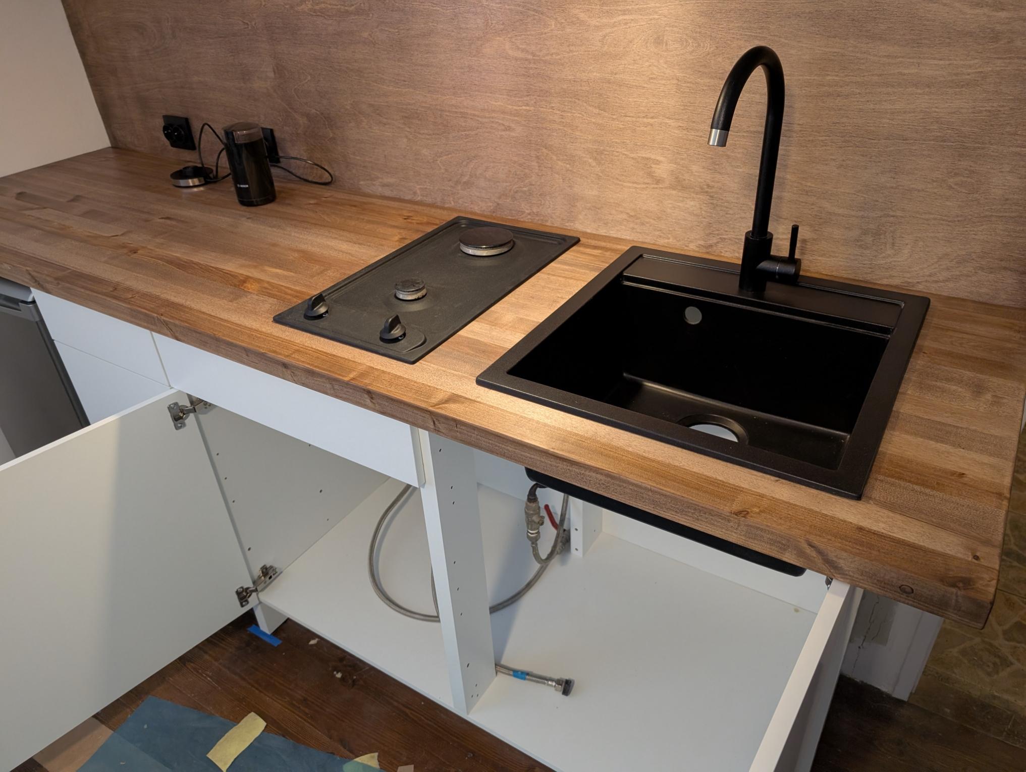 Tuleb valida välja ja osta sobivad torud, äravoolutoru peab jooksma diagonaalis suhteliselt kaugele kraanikausist endast. Kapi ruumi võiksid need torud minimaalselt ära võtta. Kraanikausi serva ja gaasipliidi serva alla tuleb panna silikooni.