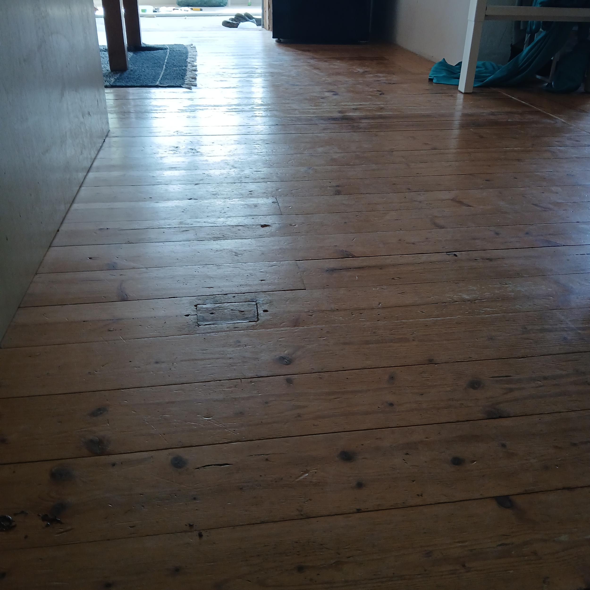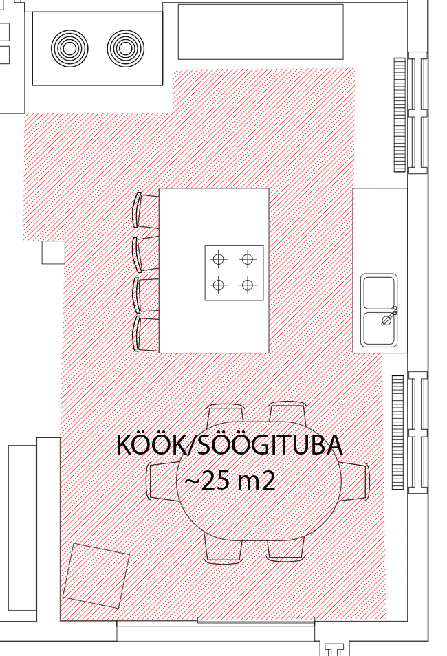 Küsimus on, et kas sellise (u.20m2 suuruse) põrandapinna uuesti lihvimiseks ja õlitamiseks on tarvis liigutada kogu mööblit või võib statsionaarsem mööbel (põranda küljes kinni olev valamukapp ja köögisaar) paigale jääda? Küsimust illustreerib toaplaanil punasega viirutatud ala, mis tähistab taastamist vajavat põrandapinda - kas sellisel kujul osaline põranda taastamine tuleb kõne alla? (St. sooviksime lahti saada sellest halliks kulunud põrandaosast, aga ei soovi põrandatöödeks kogu mööblit lahti võtta ja eemaldada). Kitsaim koht köögisaare ja valamukapi vahel on u. 80cm laiune.
