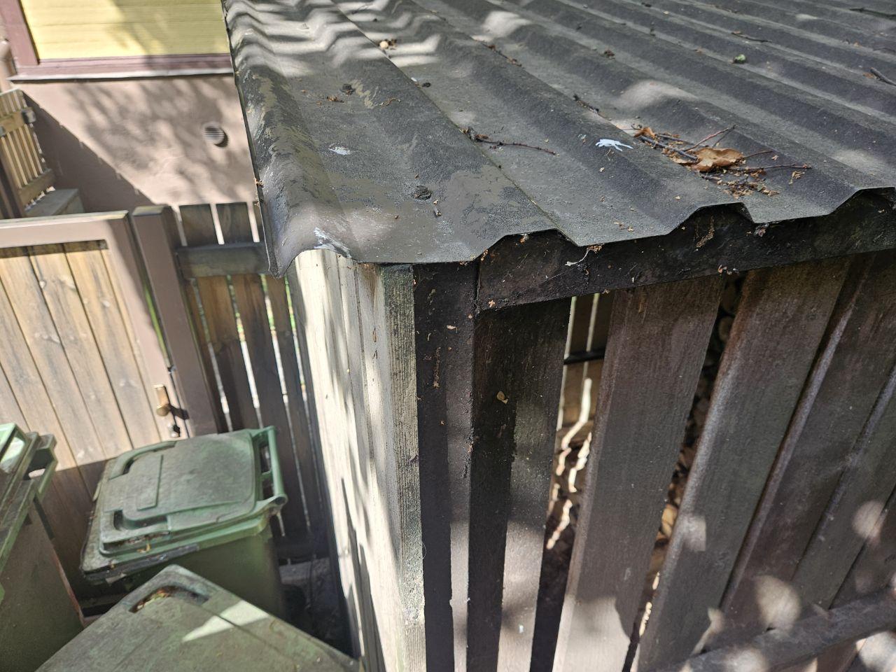 Krundil paiknevale puukuurile (koosneb 2 boksist kogulaius 5m, kõrgus 2.15m , foto1) on tarvis tagakülje välimisele poolele ehitada puitkarkass (immutatud prussidest paksusega vähemalt 50x75, karkassi saab toetada kuuriboksi metallkonstruktsiooni külge (foto2). Karkassi külge tuleb naelutada 22x95 pruuni puiduimmutusvahendiga süvaimmutatud hööveldatud laudadest laudis. Lisaks on trapetsikujulisest katuseplaadist vaja teha pikendustükid olemasolevale katusele räästa pikendamiseks (foto3).