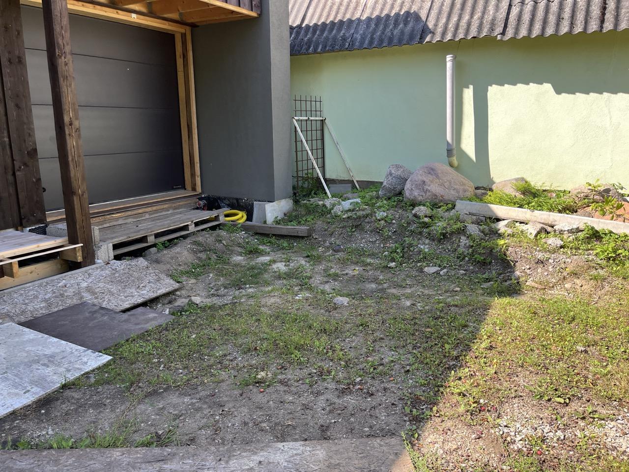 Garaazi väravate juures langus värava poole. Tänavakivid algavad varikatuse alt.