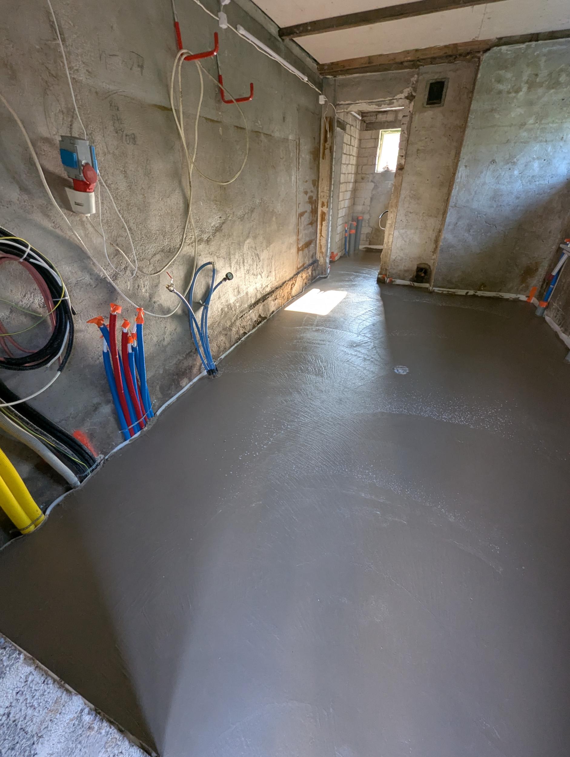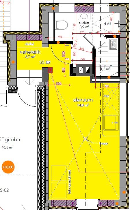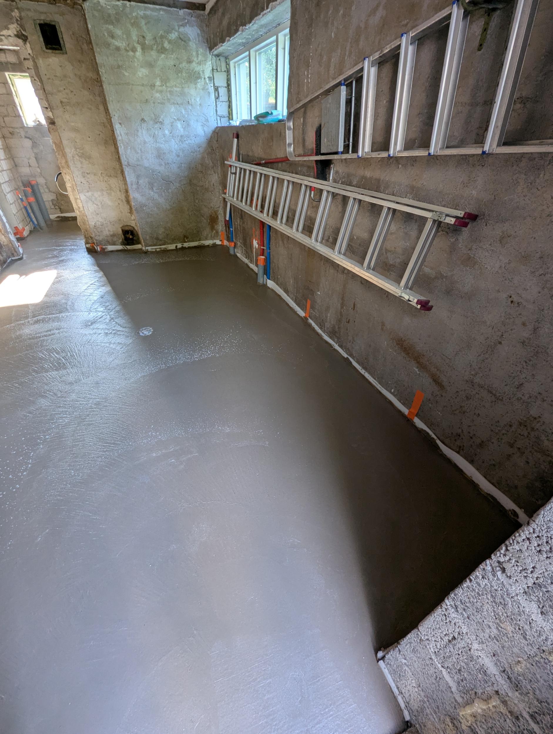 Põrand on valatud kuu aega tagasi. Plaaditav pindala ca 17 m2 - tehnoruum ja eeskoda (pildil kollane). Plaat 30x60x0,9 (olemas). Seinte ääres torud ja kaablite läbiviigud (vt pilte). Põrandal 1 trapp.