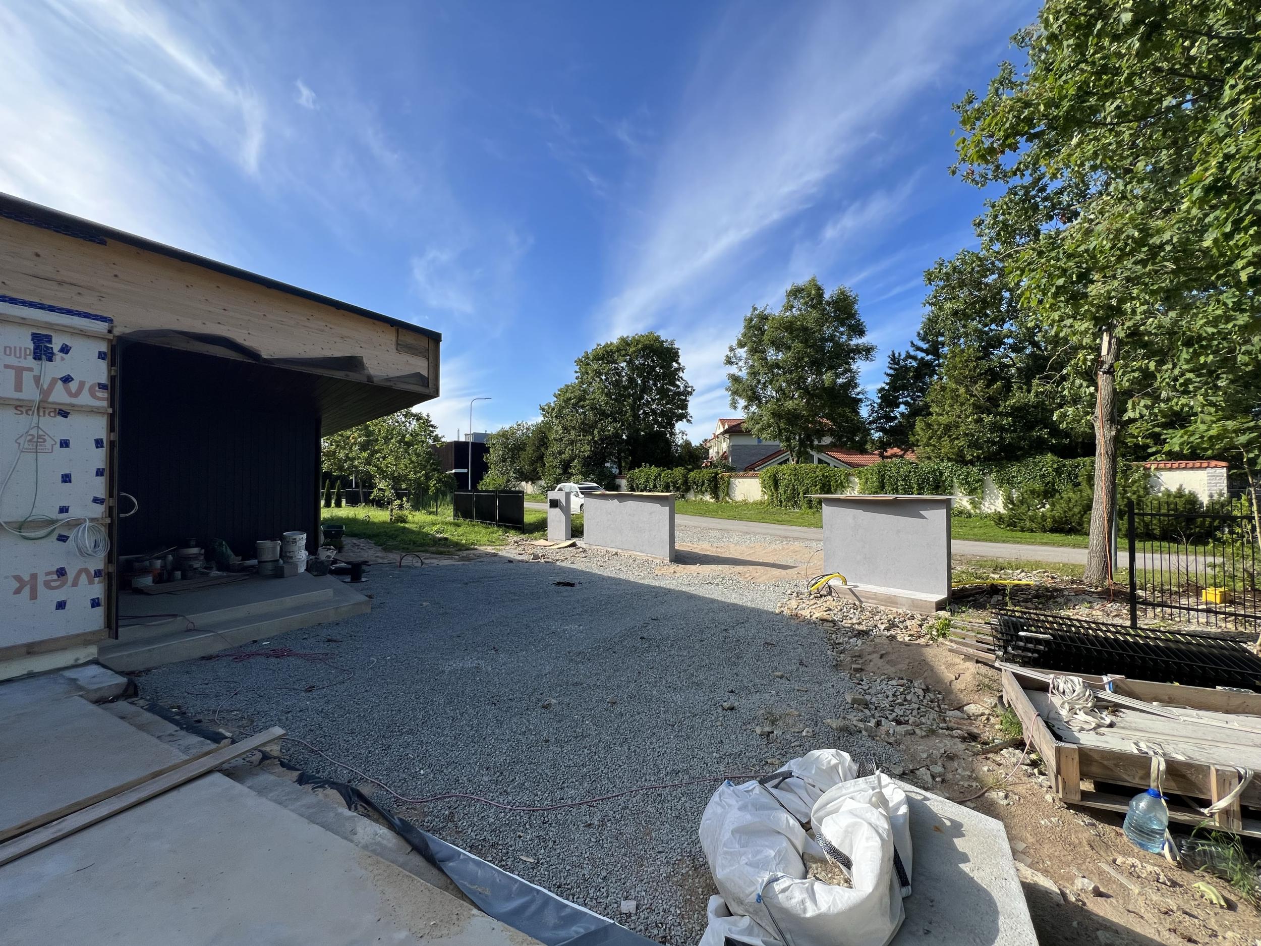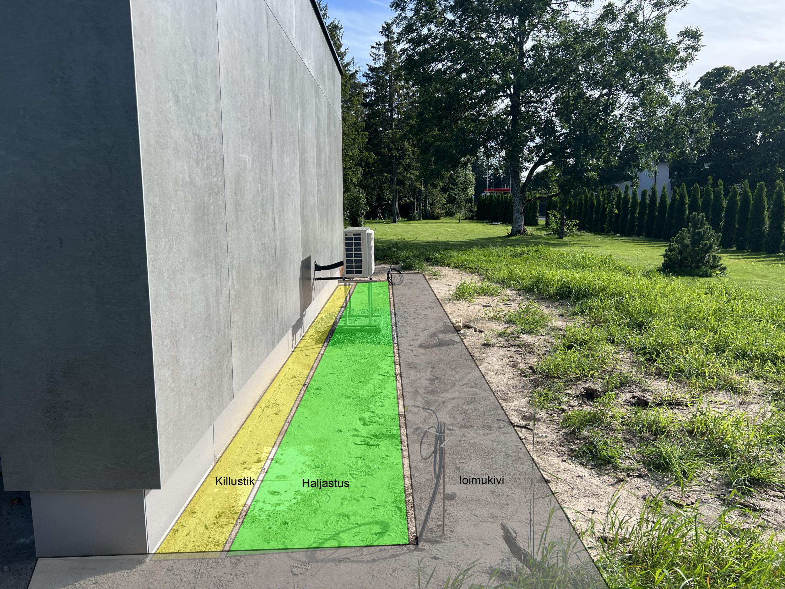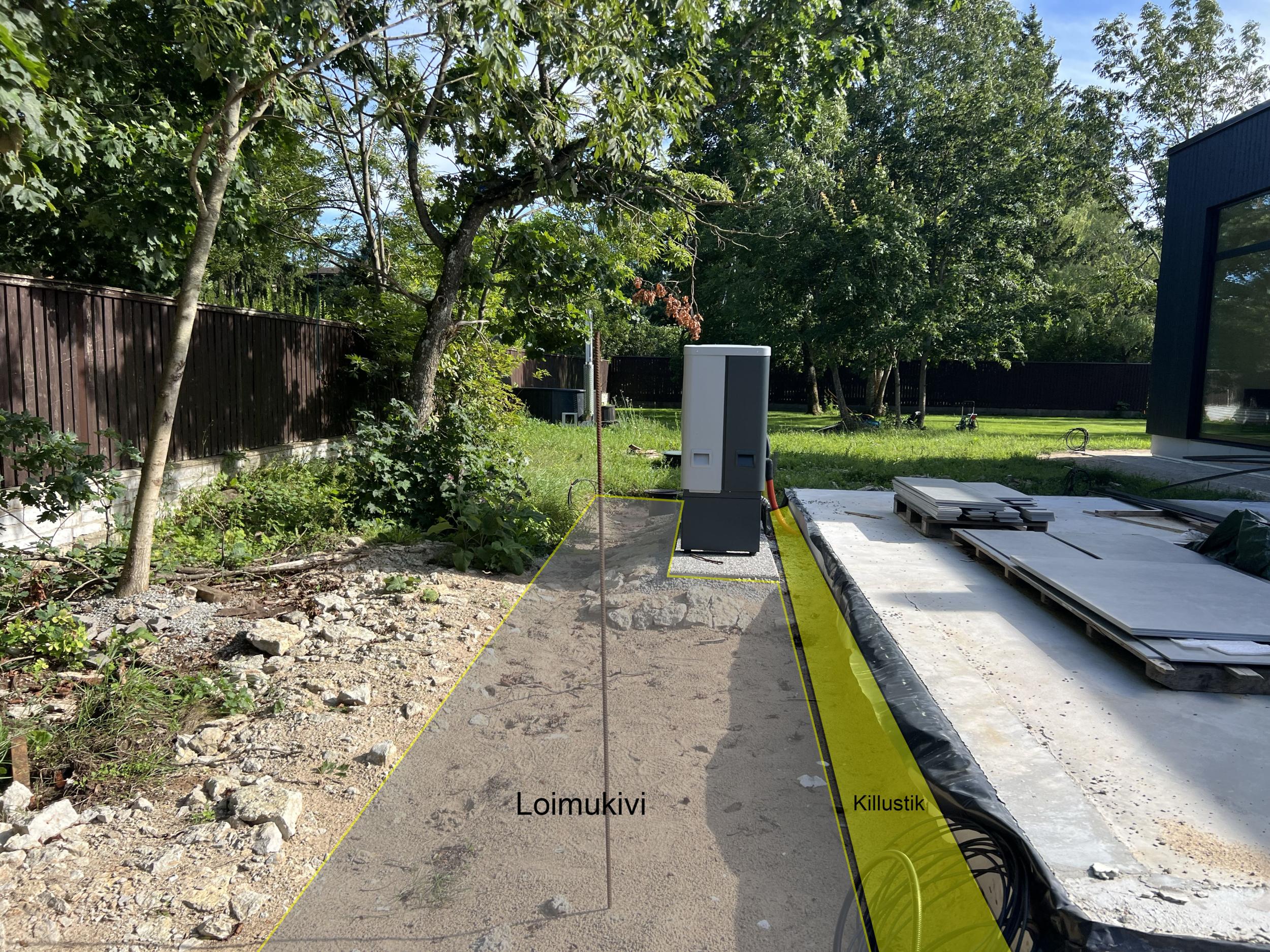 Tänavakivi Loimukivi 60, äärekivid, vuugiliiv ja killustik tuleb tellija poolt. Projektis märgitud erinevad kivid, kuid kasutame ühte Loimukivi 60(pildil näidatud ka ala, mis läheb tegemisele). Ülejäänud materjal/täide tuleb tegija poolt. Tänavakivi kokku on 240 m2 ja äärekivi 138 jm. Projektis näidatud ka killustiku asukohad maja äärtes. Killustiku äärtesse, kus ei ole tänavakivi vastas tuleb kas immutatud laudis või metallääris(kokku 42 jm).