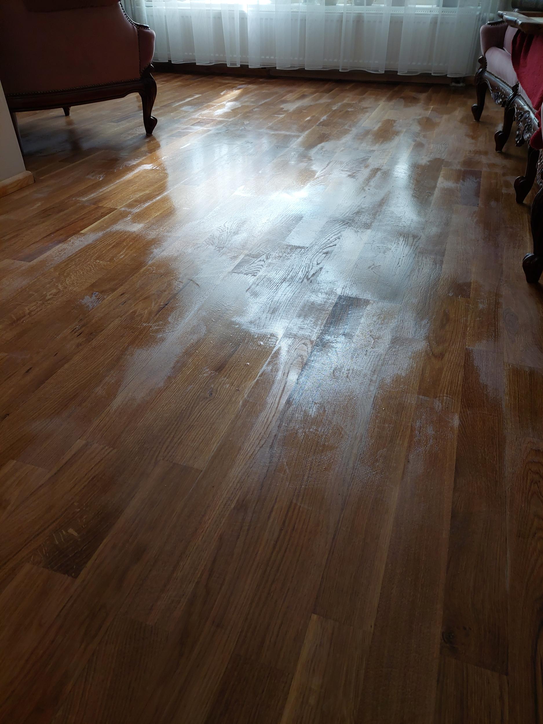 Kilpparkettpõrand on lihvitud ja oskamatu "meistrimehe" poolt õlitatud põrandaõliga. Tulemus on kohutav, kuna õli on pandud ebaühtlaselt, paksemad kihid naksuvad, õli koorub maha.
