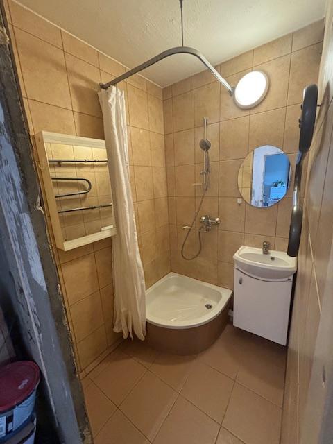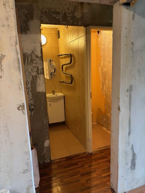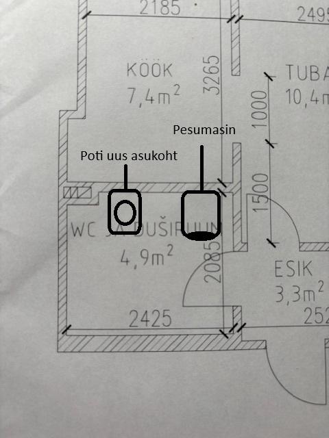 Dušinurga ja kraanikausi asukoht ei muutu, wc poti asukoht muutub (vt joonis, eelistatavalt seinapealne). Pesumasinale luua ühendus. Põrandad ja seinad plaatida, ripplagi.