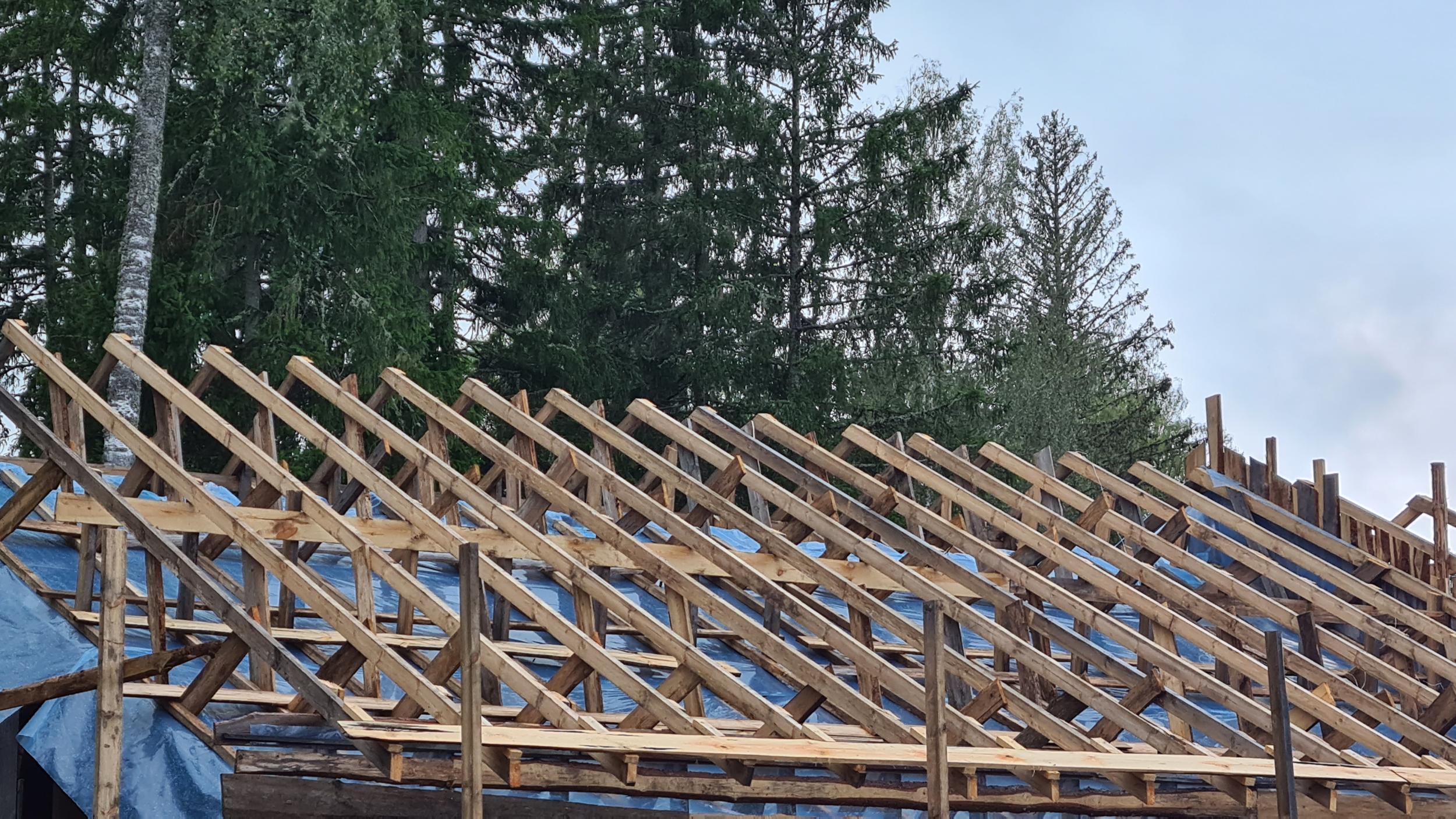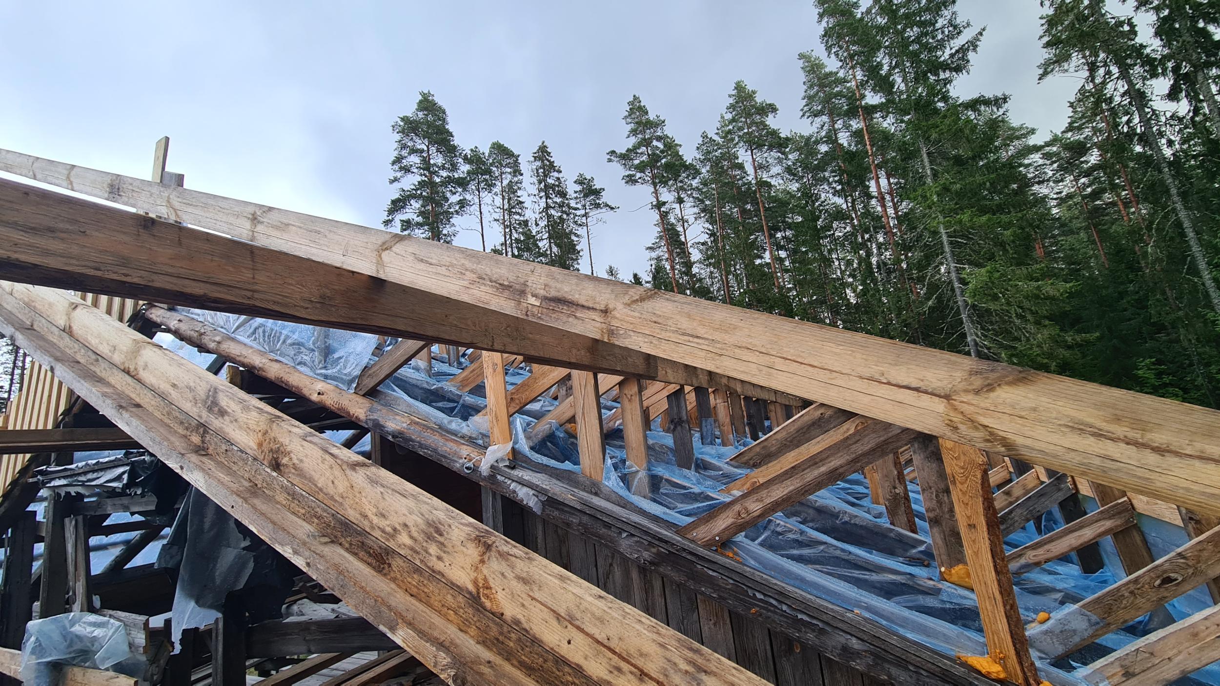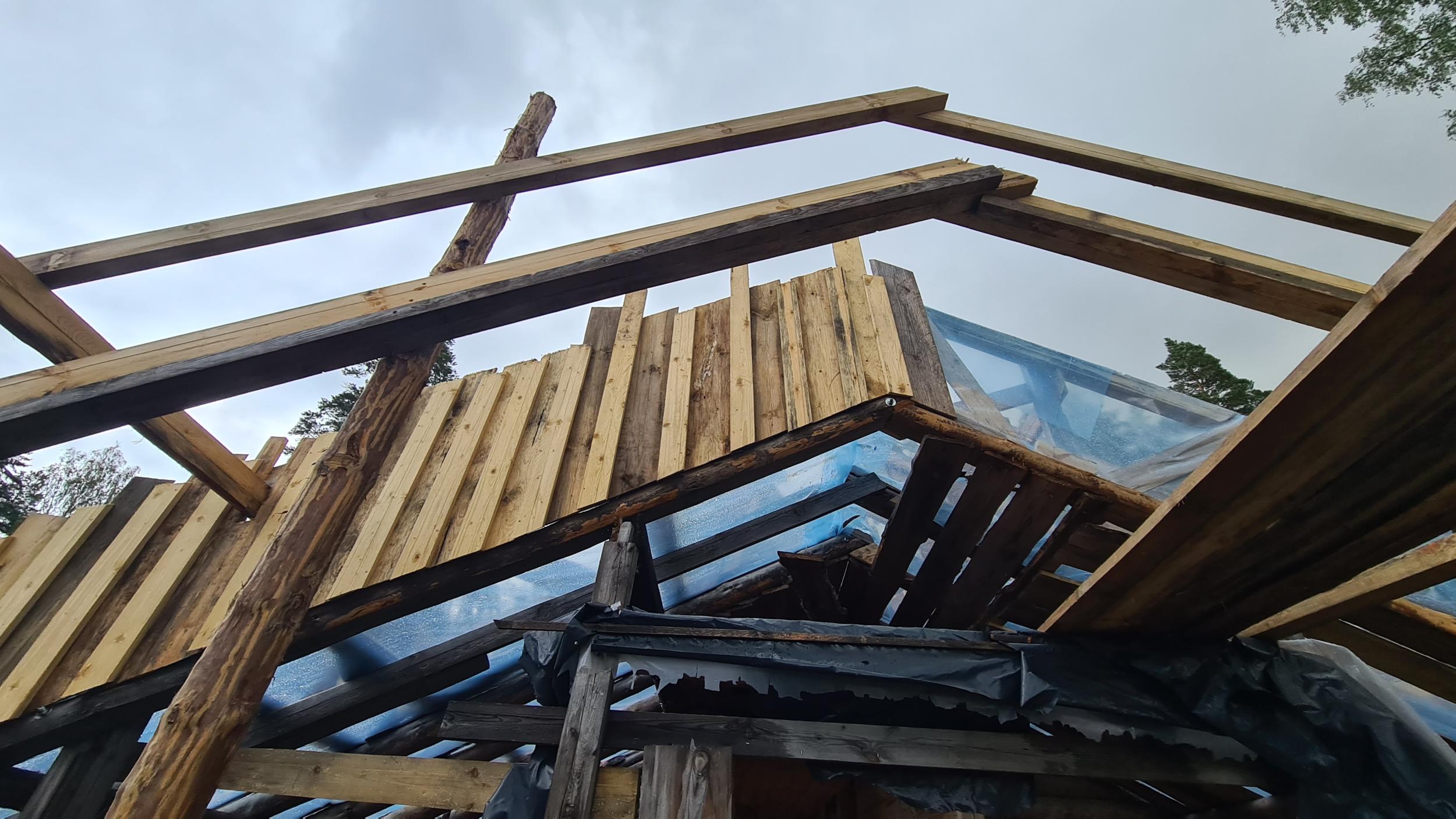 Katus on väikse kaldega, harja pikkus 10m ja kõrgus 6m. Katusepind kokk 120m2. Soovitav villa paksus 40cm