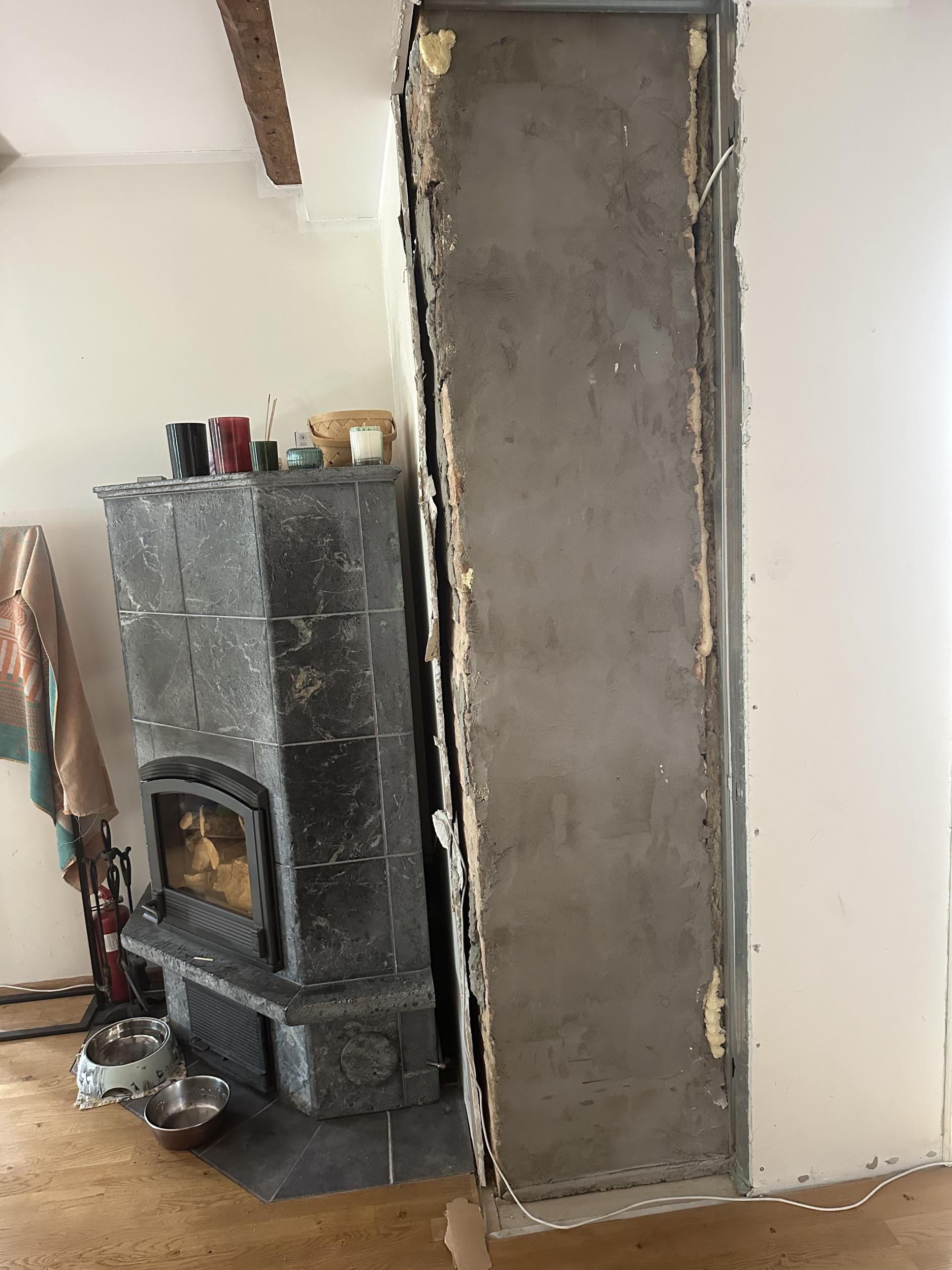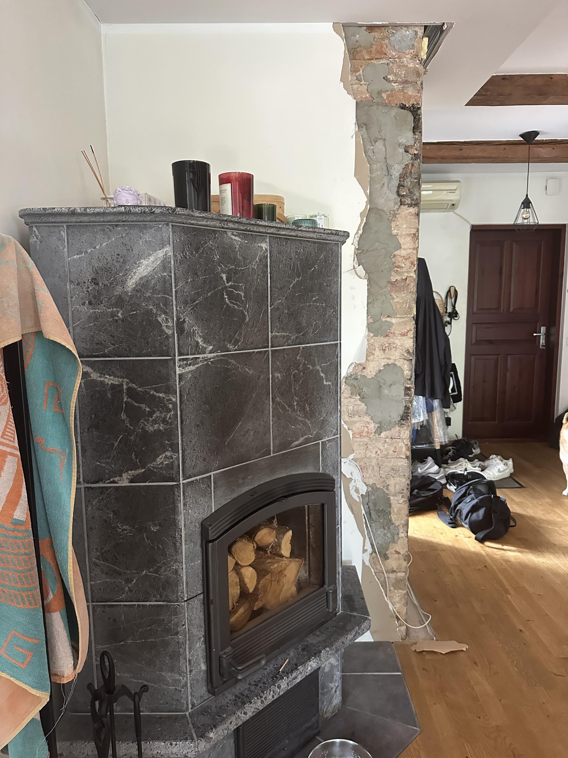 Varasemalt oli kogu korsten pandud kipsseina taha. (Uus) korstnapühkija leidis, et see pole tuleohutusnõuetele vastav. Kuna ainult ühe külje pidi kipsi alt vabastama, siis võtsin ise nurga pealt kipsi maha. Kipsi all olev korsten on suhteliselt kehva väljanägemisega. Tahan, et korsten oleks kahest küljest kipsi alt täielikult väljas ja viimistlus oleks kena.