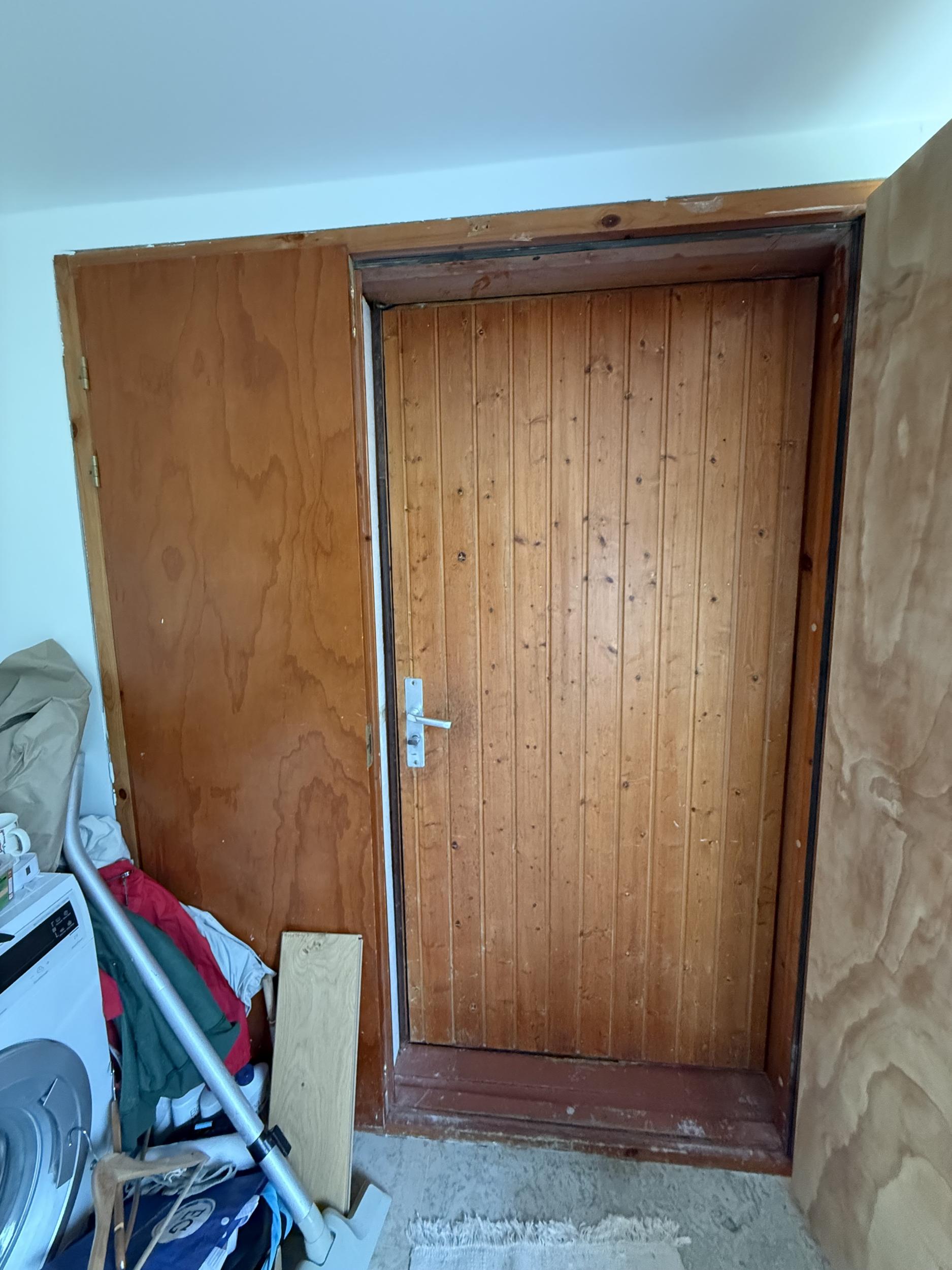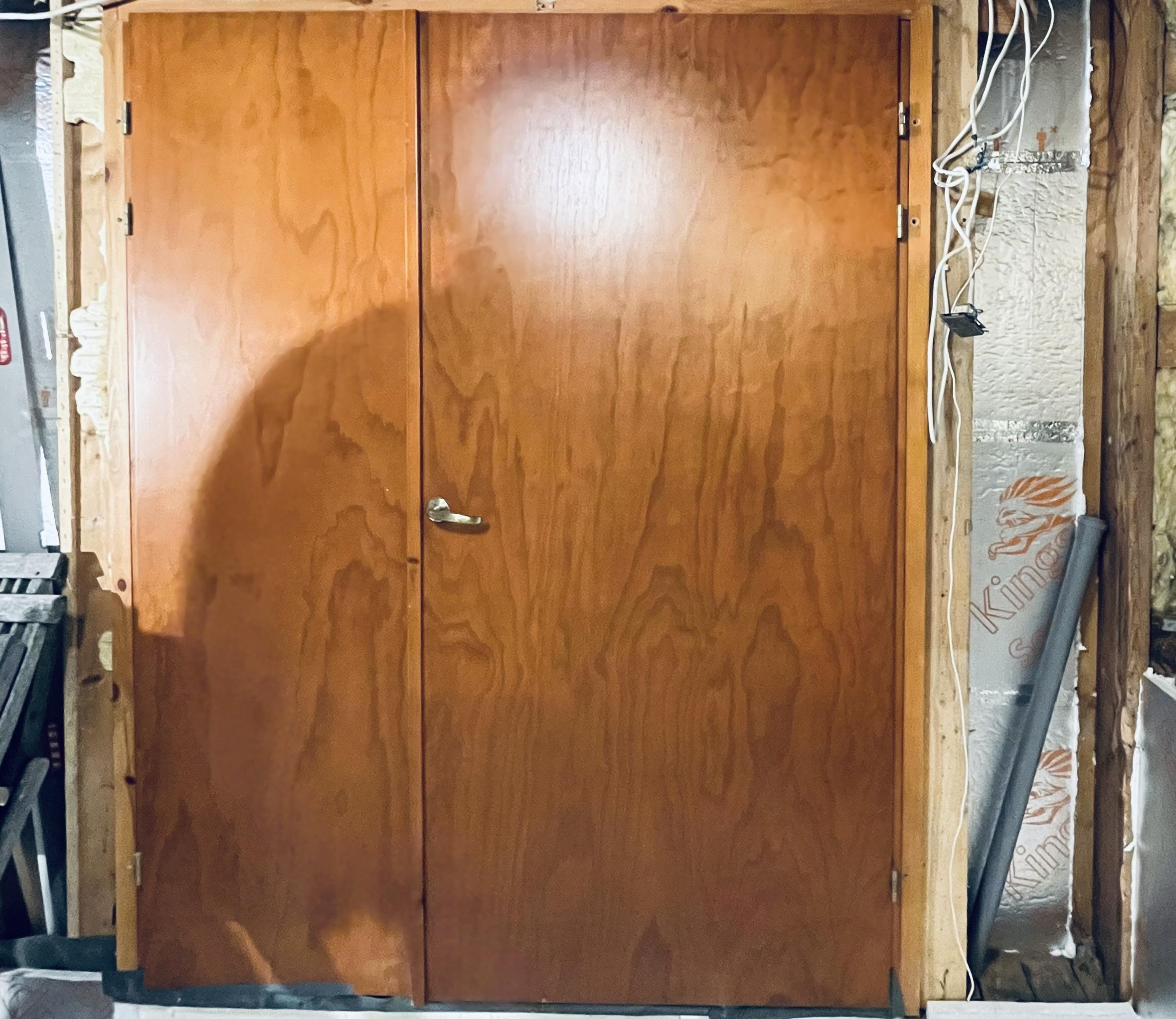 Kahe ukselehega sissepääsu uks. Vaja vana värv maha võtta, siledaks lihvida (ukselehed + ukselengid) ja uus lasuur (toon:lumi) peale kanda, nii et tulemus jääb ühtlase tooniga. Välisukse välimine külg laudis kas lihvida ja taasviimistleda või paigaldada peale uus külgneva seinaga sobiv laudis.
