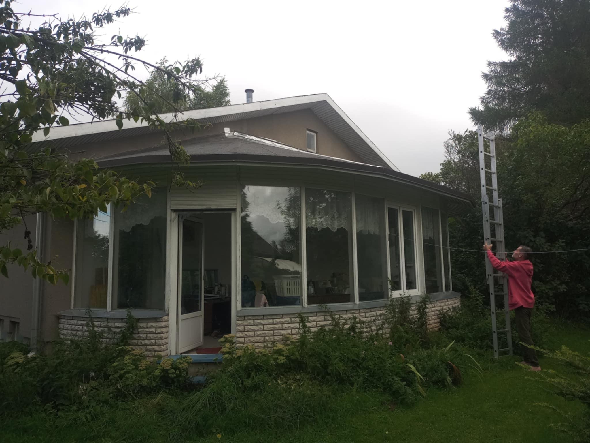 Tegemist siis Veranda katrusegva, kus praegu on tõrvapapp peal, ag se hakas läbi laskma ja tulek sindlitega üle teha. Töö muudab probleemsemaks see, et katus on pool 26-nurgast e peaaegu ümmargune (poolkoonus). Katuse mõõdud on visandil näha. Hea kui lähema kuu jooksul valmis saaks.