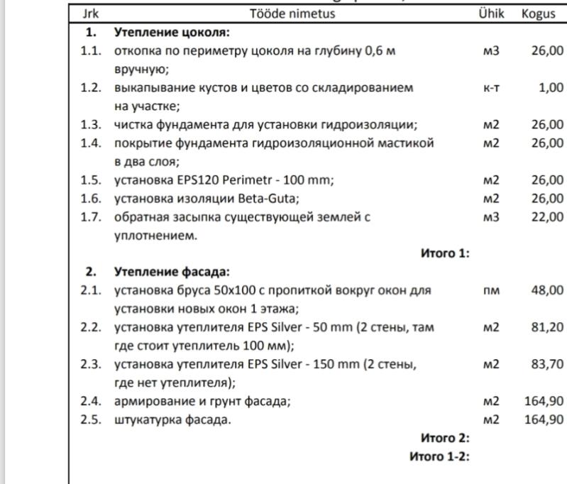 1. Sokli soojustus 1.1. Sokli perimeetri käsikaevetööd sügavuseni 0,6 m – 910 € 1.2. Põõsaste ja lillede väljakaevamine ning ladustamine krundil – 120 € 1.3. Vundamendi puhastamine hüdroisolatsiooni paigalduseks – 156 € 1.4. Vundamendi katmine hüdroisolatsioonmastiksiga kahes kihis – 364 € 1.5. EPS120 Perimetr 100 mm paigaldus – 520 € 1.6. Beta-Guta drenaažimembraani paigaldus – 390 € 1.7. Tagasitäide olemasoleva pinnasega koos tihendamisega – 396 € Sokli soojustus kokku: 2 856 € 2. Fassaadi soojustus 2.1. Immutatud 50×100 prussi paigaldus aknaümbruses (I korruse uute akende jaoks) – 576 € 2.2. Soojustus EPS Silver 50 mm (2 seina, kus on juba 100 mm) – 1 056 € 2.3. Soojustus EPS Silver 150 mm (2 seina, kus soojustus puudub) – 2 344 € 2.4. Fassaadi armeerimine ja kruntimine – 2 803 € 2.5. Fassaadi krohvimine (välisviimistlus) – 2 474 € Fassaadi soojustus kokku: 9 253 € 3. Lisatööd 3.1. Tellingute paigaldus ja rent töö perioodiks (ca 2–3 nädalat) – 1 200 € 3.2. Kaevetööde ülejäägi ja ehitusprügi äravedu objektilt – 650 € Reserv ettenägematuteks kuludeks (8%) – 1 117 € Kokku ilma: 15 076 € Märkused Kõik hinnad sisaldavad tööd ja materjale (EPS, liimid, tüüblid, armeerimisvõrk, nurgad, mastiks, prussid, krunt, krohv jms). Tagasitäiteks kasutatakse olemasolevat pinnast. Pakkumine ei sisalda haljastuse taastamist (muru, põõsad). Tööde teostuse aeg lepitakse kokku eraldi, eeldatav kestus ca 3–4 nädalat. 40% ettemaks, Garantiiaeg töödele 3 aastat. |