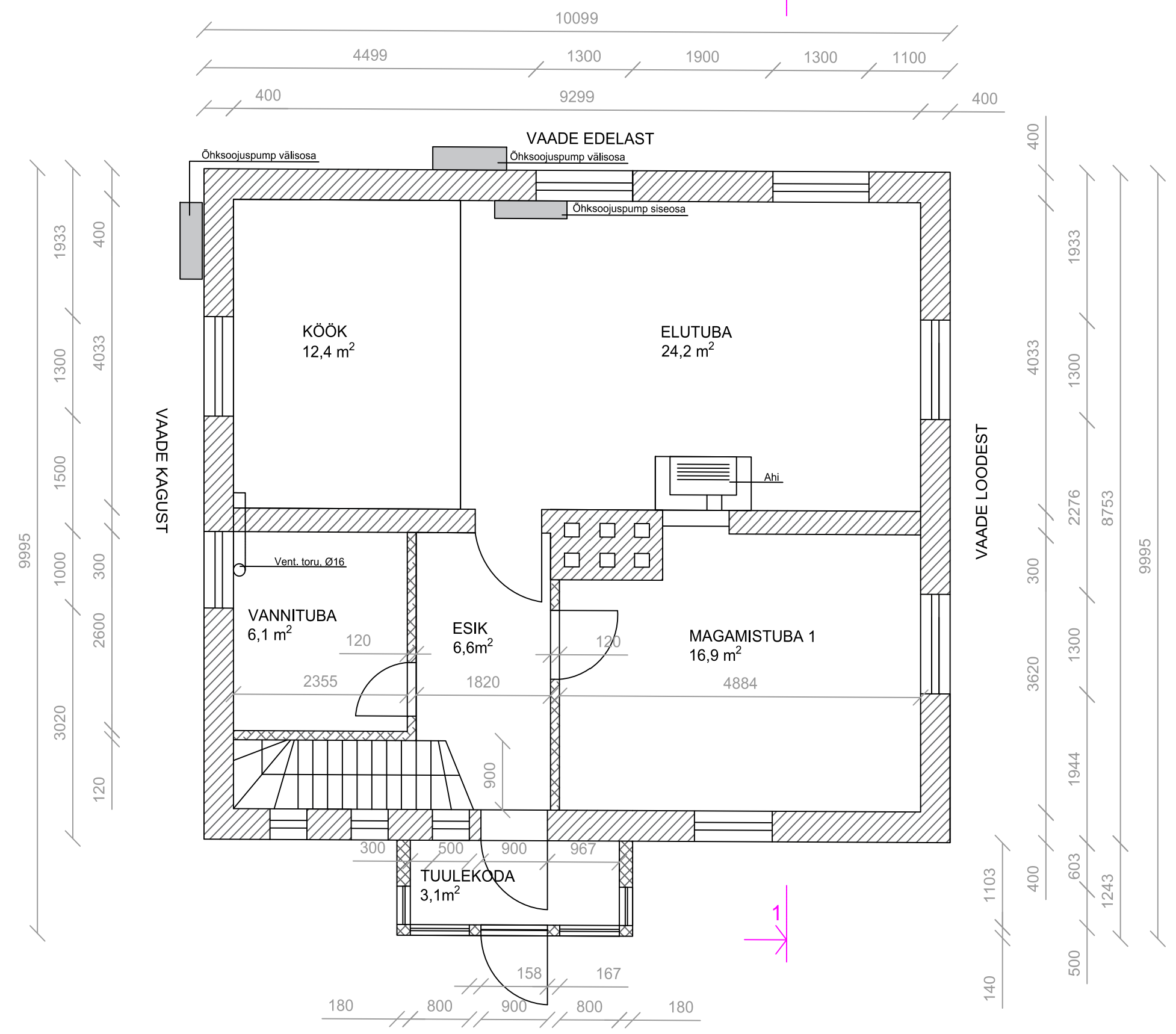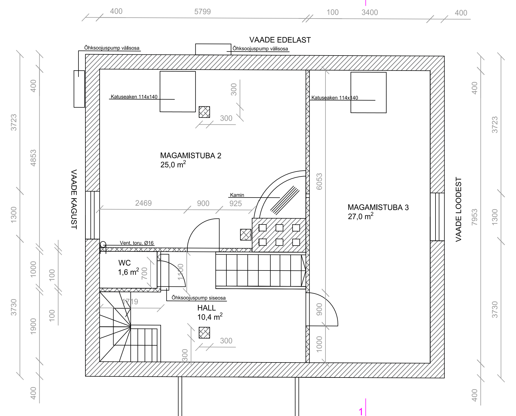 Eramajas Tallinnas, N]mmel on soov kaasajastada kütte ja ventilatsioonisüsteem. Plaan on paigaldada õhk-vesi soojuspump + tarbevee boiler, esimesele korrusele on täismahus soov paigaldada vesi põrandaküte, teisele korrusele radiaatoritel põhinev küte. Lisaks soov paigaldada soojustagastusega ventilatsioon ning majasisene ventilatsioonitorustik. Esimese korruse põrand tuleb täismahus eemaldada ja soojustada. Tehnoõlm tuleks esimese korruse magamistuppa (joonisel Magamistuba 1), mis muutuks tehnoruumiks/panipaigaks.