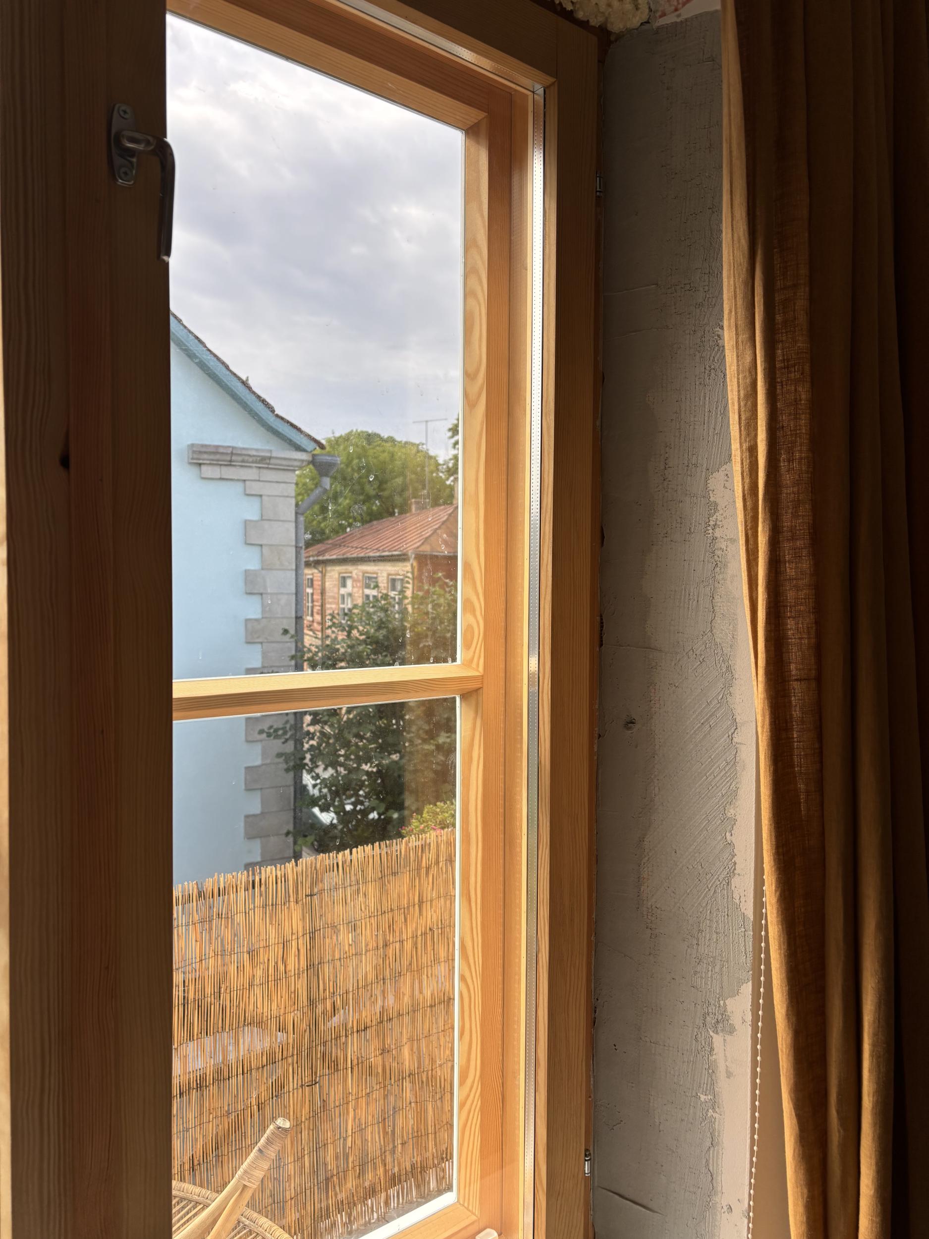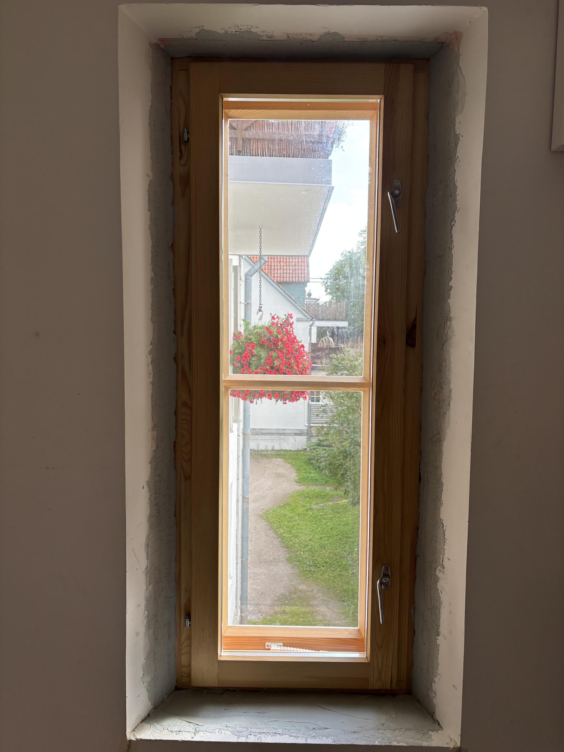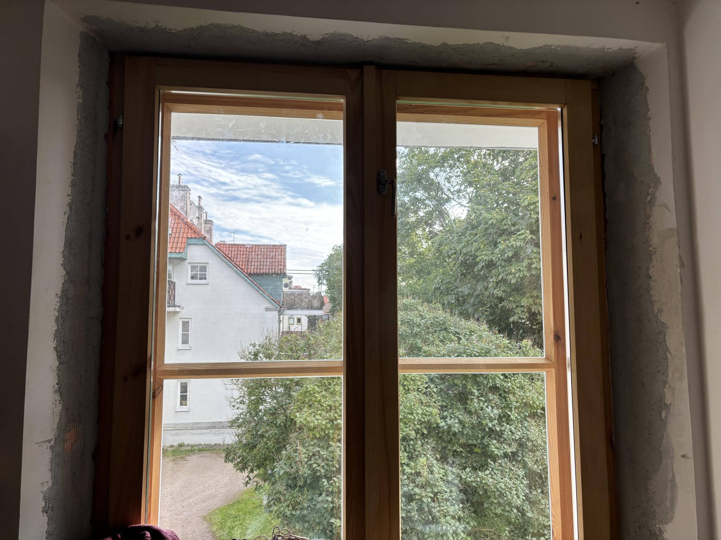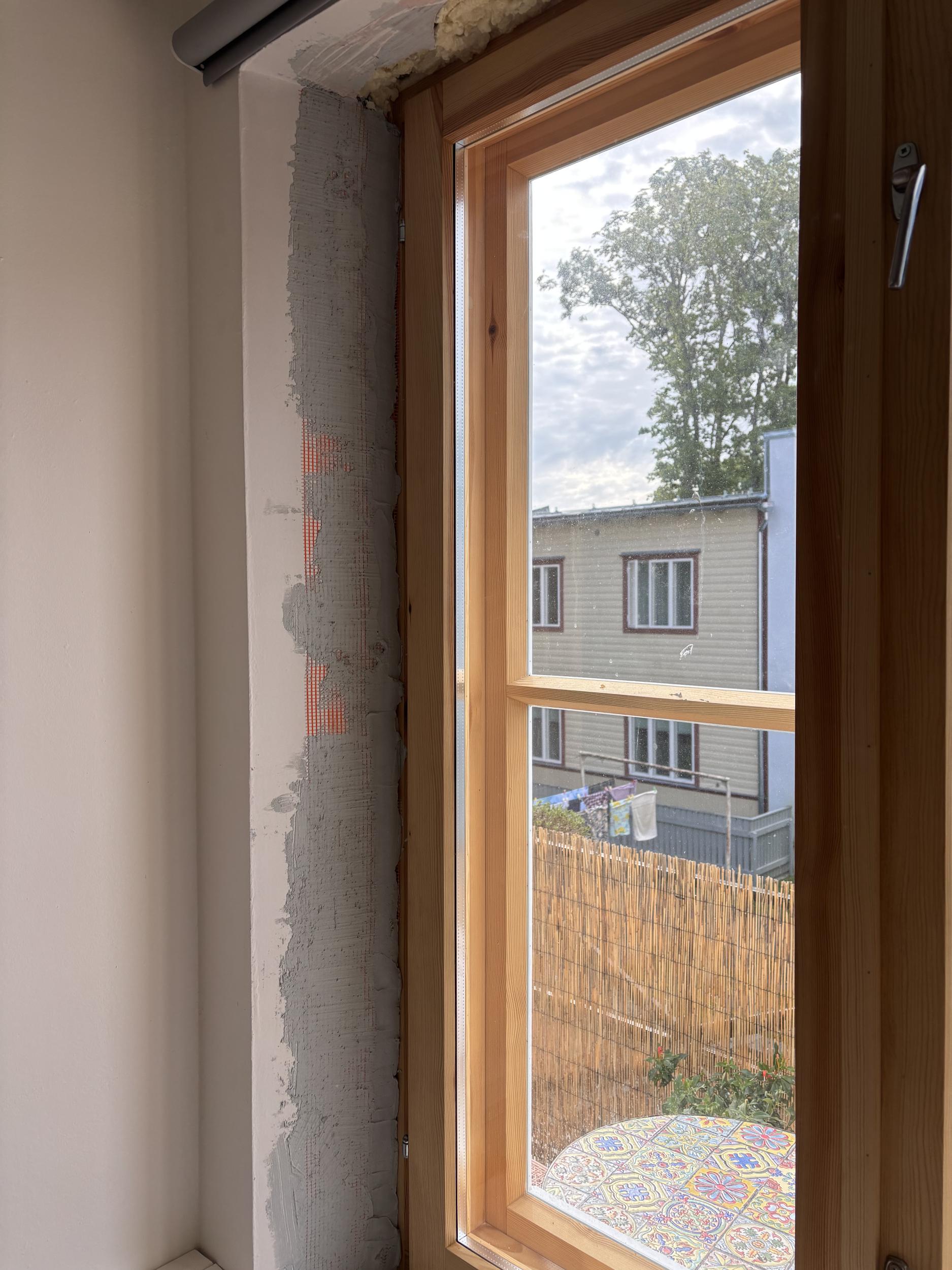 4 akent kokku. Väikesel aknal täisring, kolmel suurel aknal ainult küljed ja ülevalt. 2-l suurel võimalik, et tarvis natuke vana krohvi veel ära toksida kuna vahe akna lahti käimisega u 0,5cm. Aknapõskedele tehtud armeering ja üks kiht krohvi.