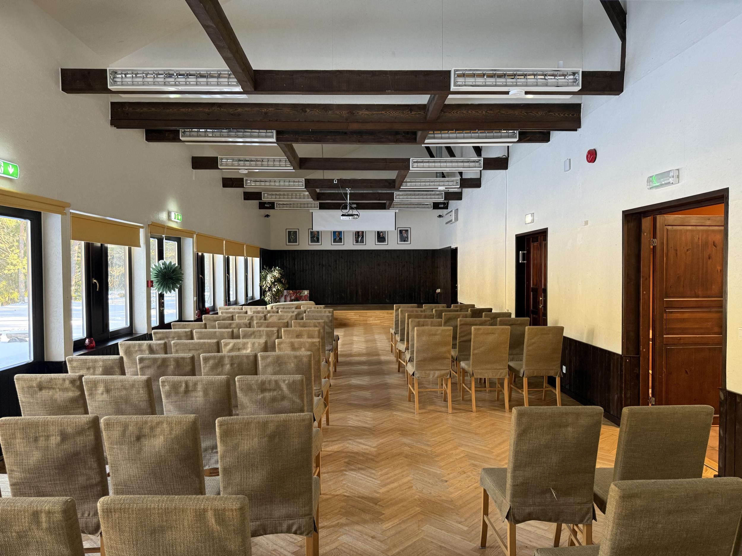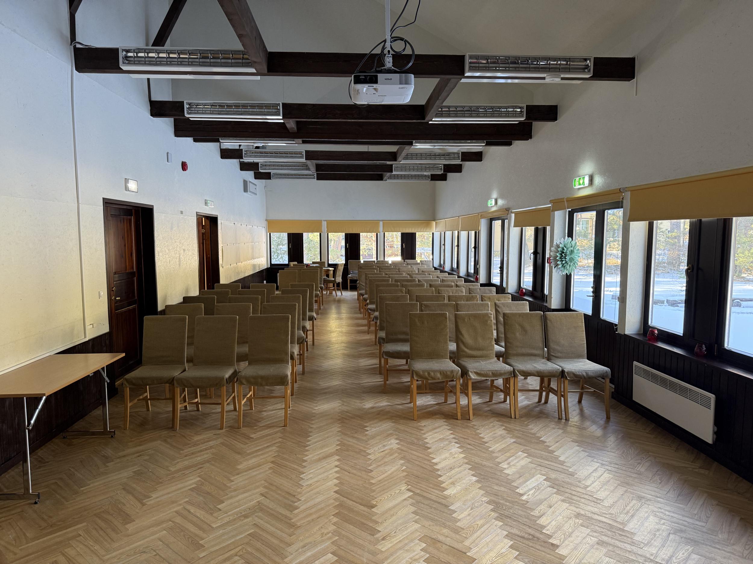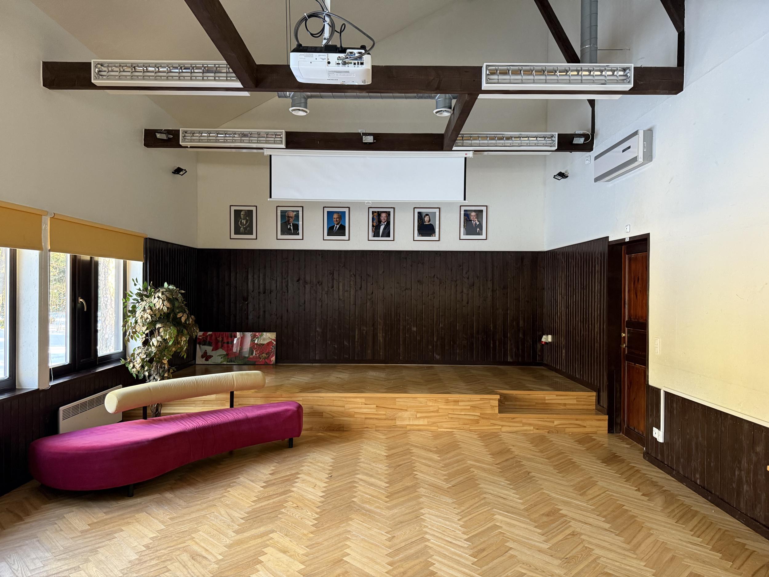 Saali suurus on 102,4 m2. Maas on puidust kalasaba parkett. Saalis on ka väike lava.