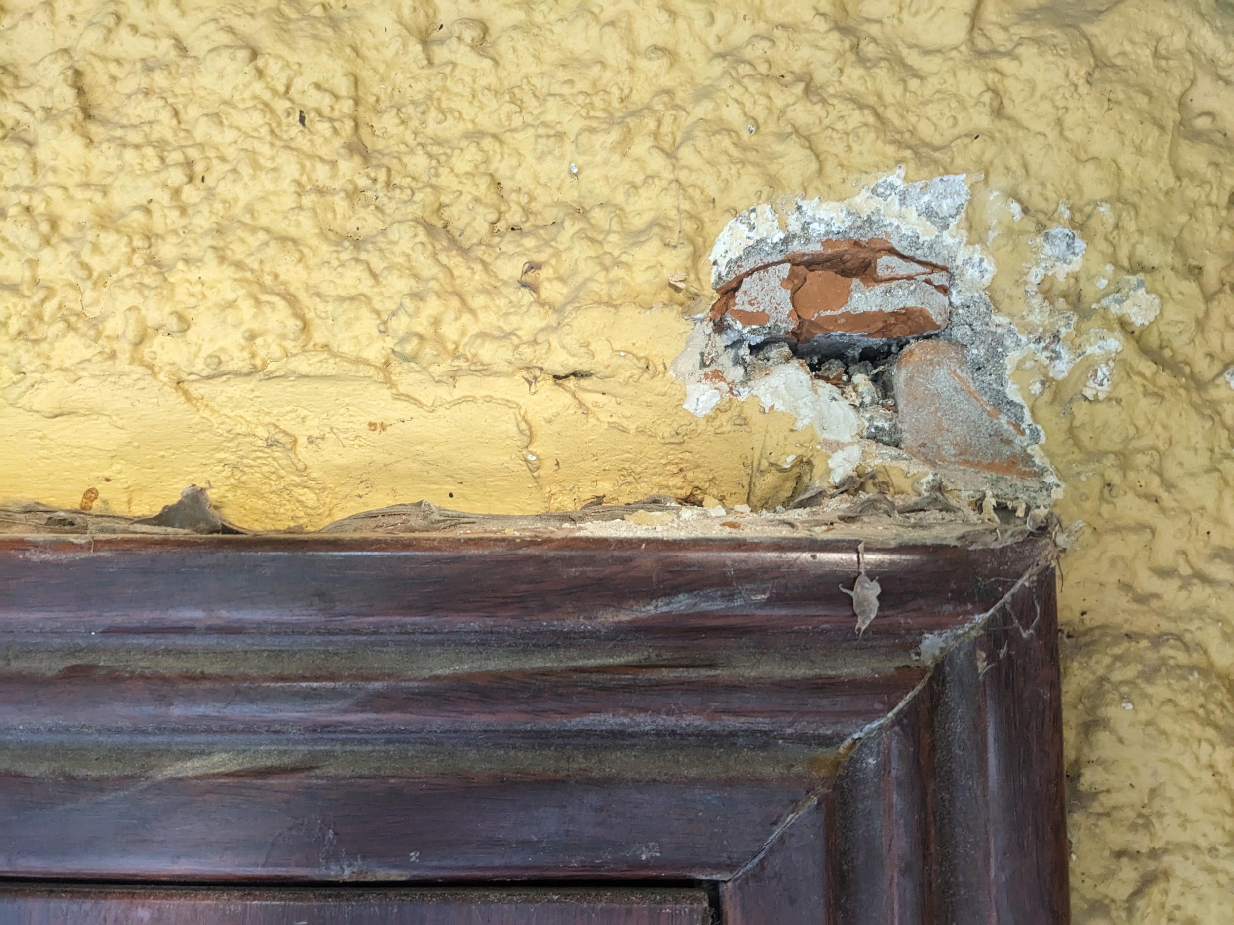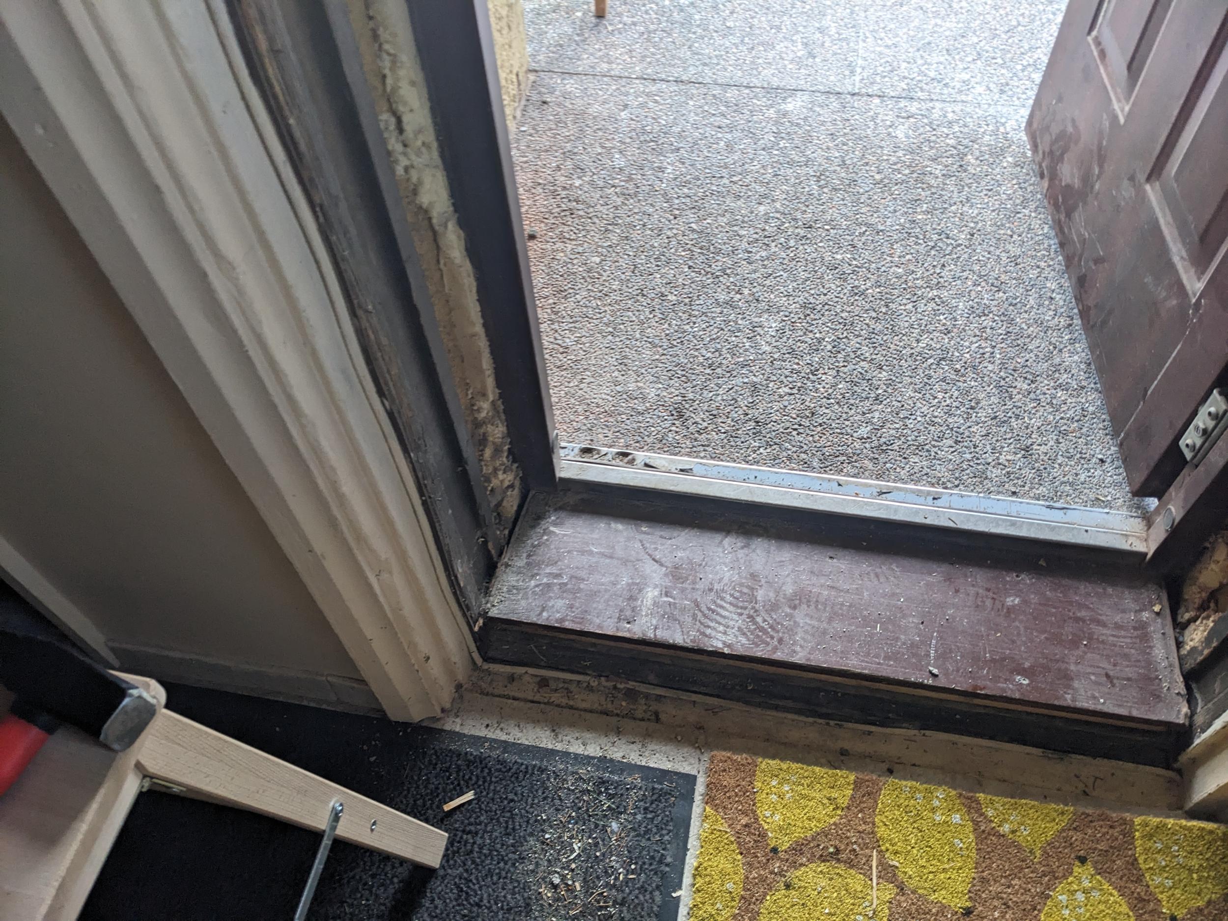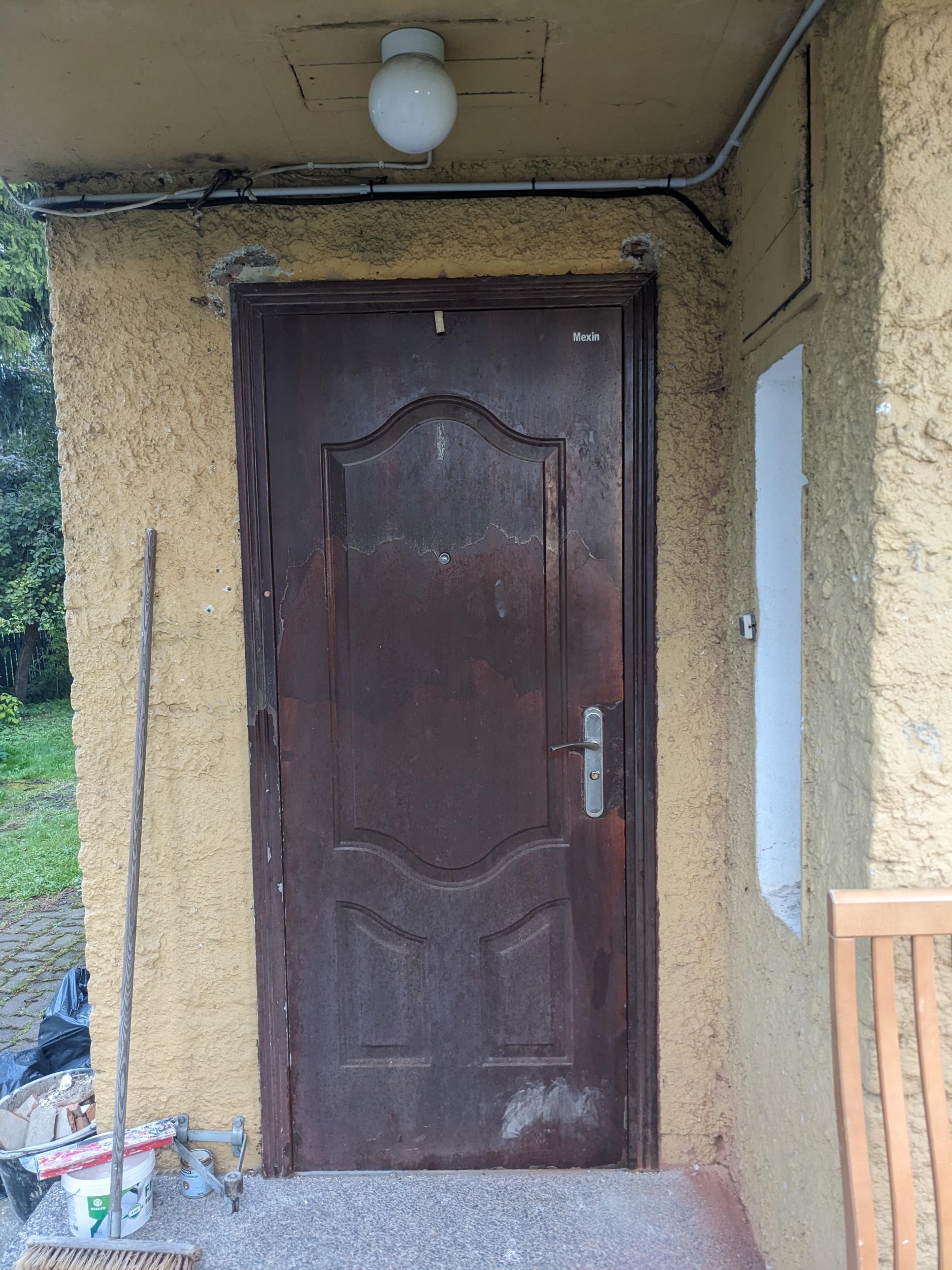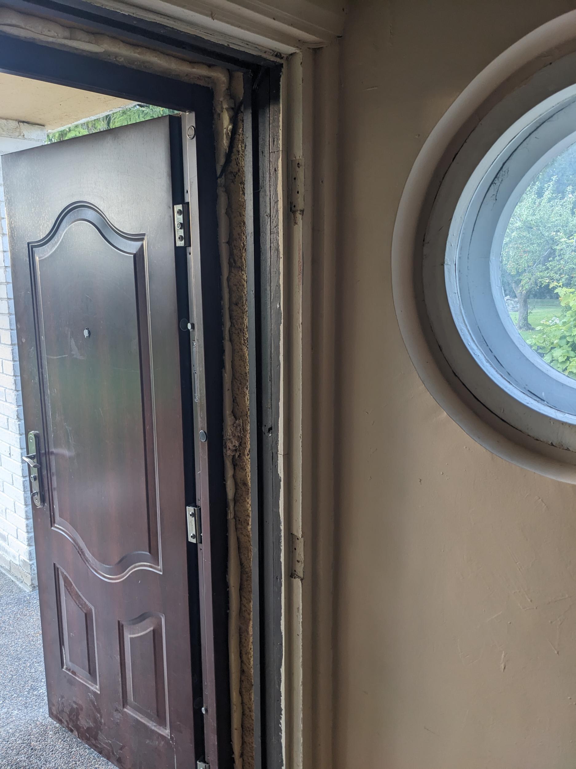 Olemasolev välisuks on vaja eest ära võtta ja ukseava vaja lõigata 970x2170mm suuruseks. Kuna ülemine lõige on pealpool sillust, siis on vaja ka toestada vinkli vms. Esik on väljast krohv, punane tellis, puitsõrestik, seespool krohv. Seina paksus antud kohas ~370mm