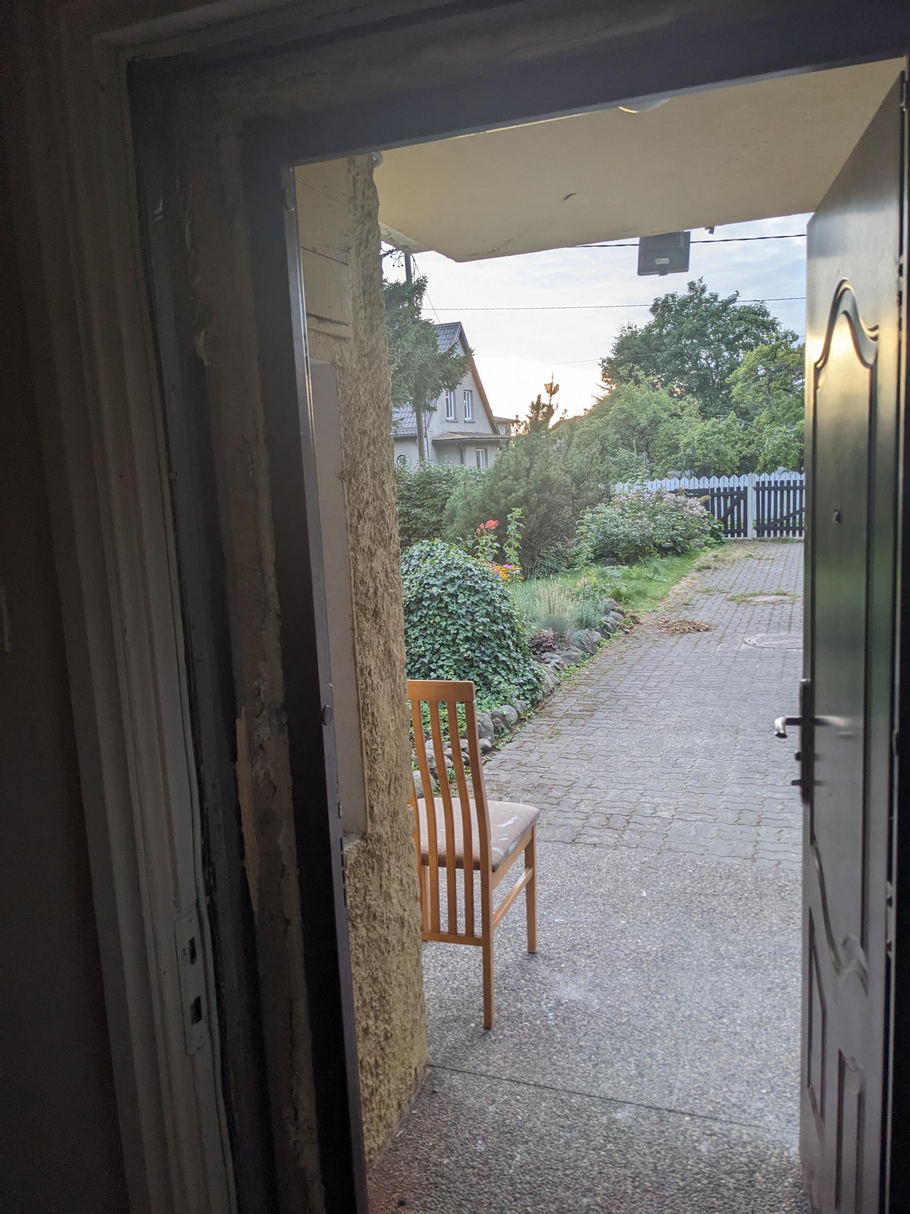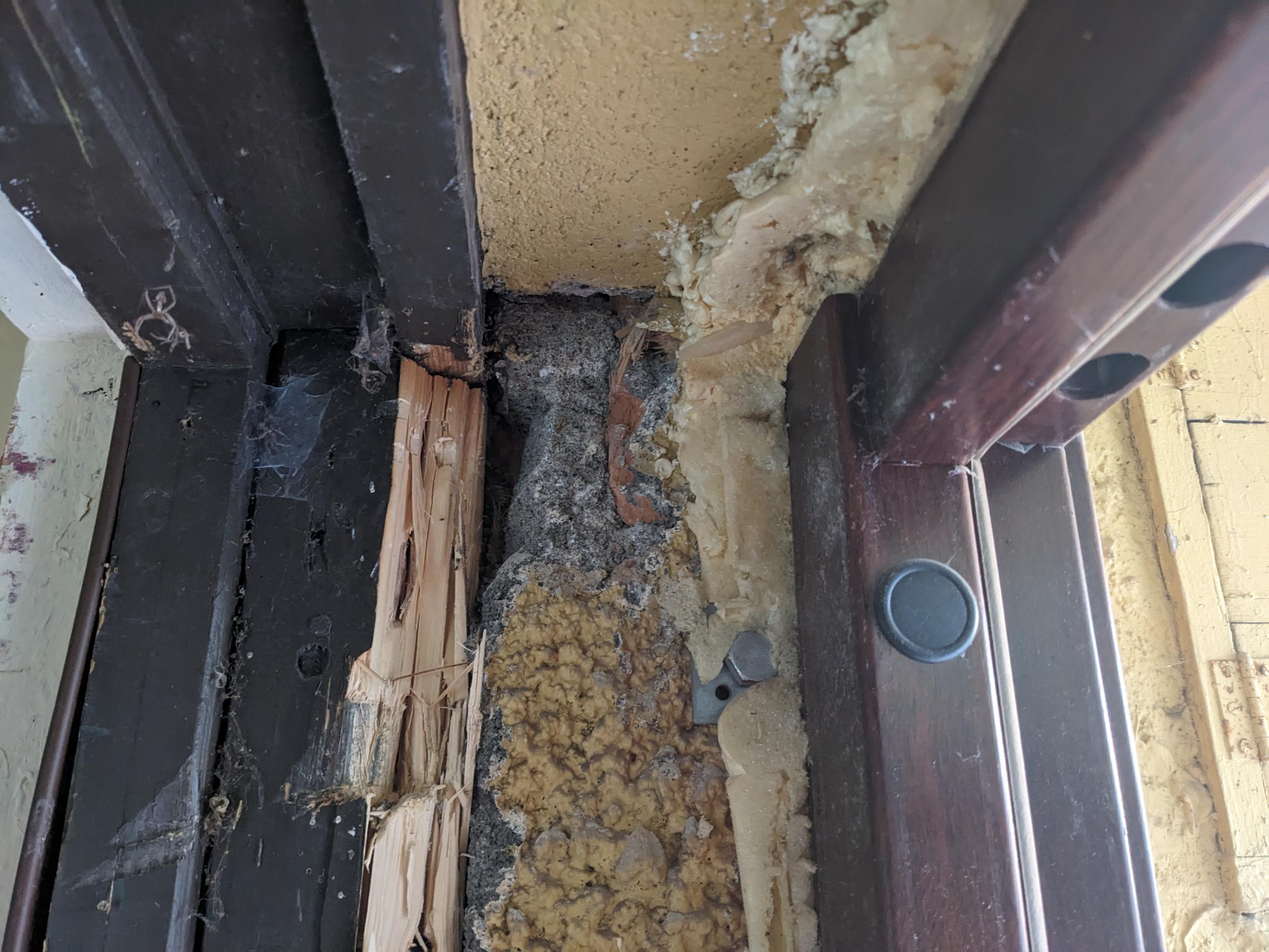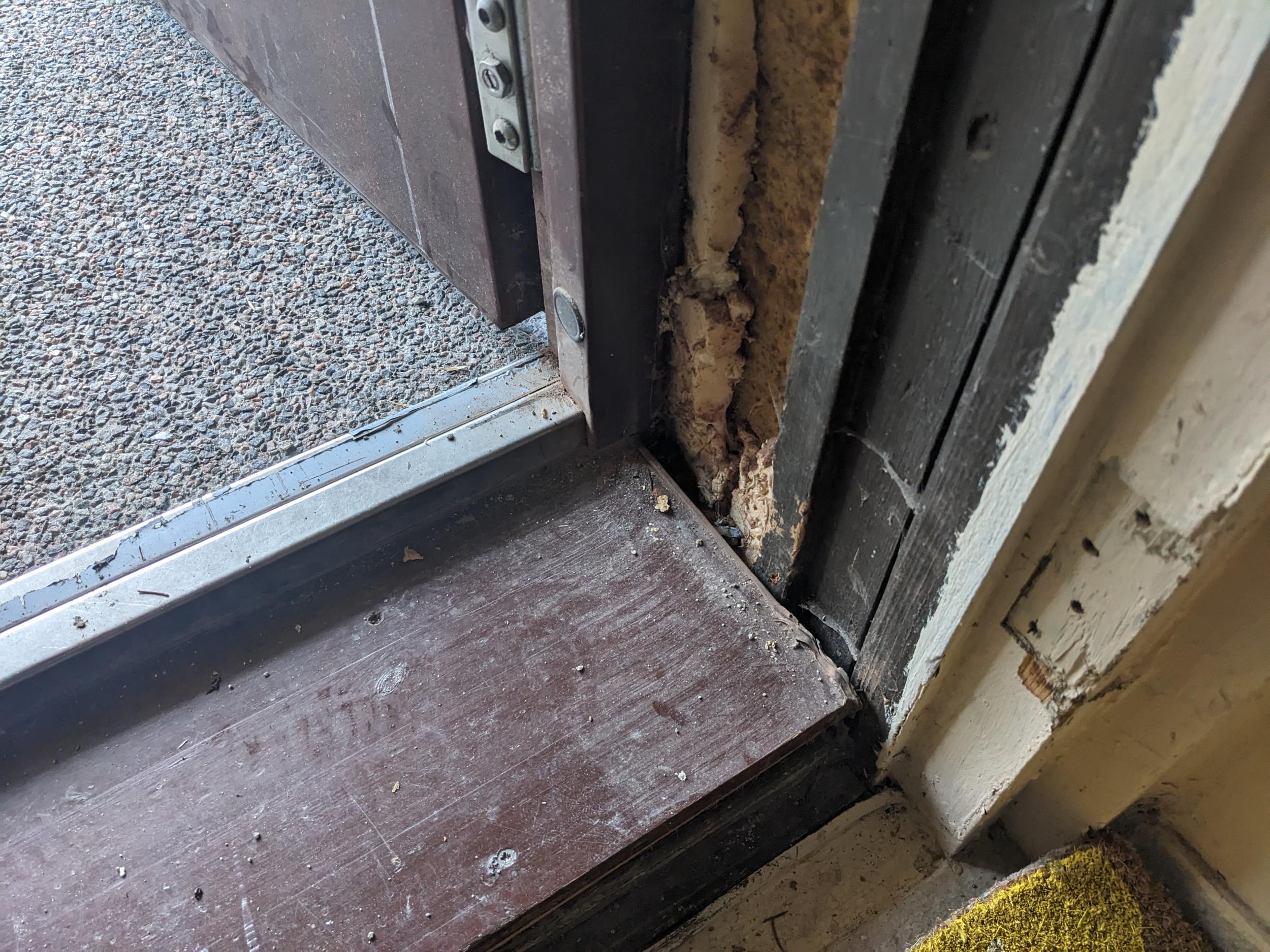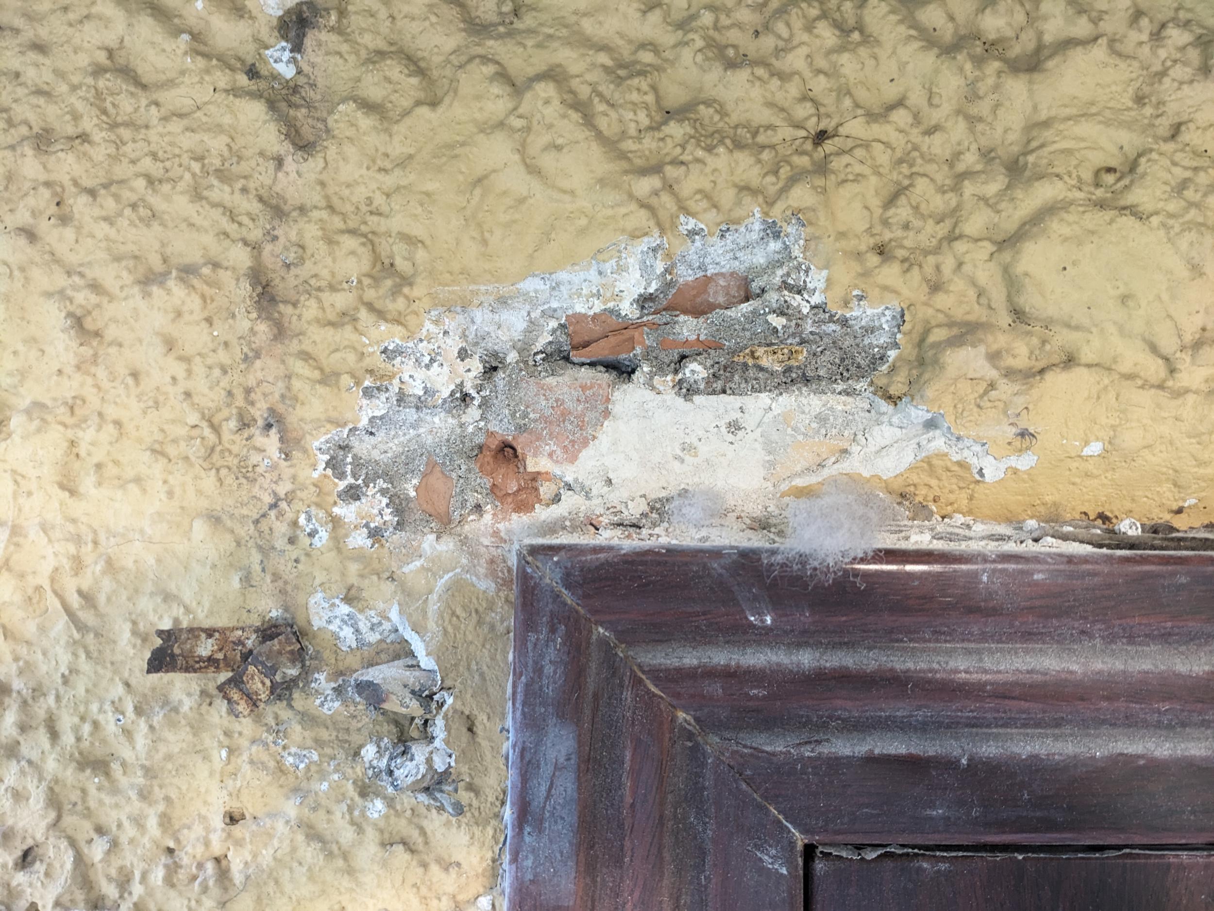 Olemasolev välisuks on vaja eest ära võtta ja ukseava vaja lõigata 970x2170mm suuruseks. Kuna ülemine lõige on pealpool sillust, siis on vaja ka toestada vinkli vms. Esik on väljast krohv, punane tellis, puitsõrestik, seespool krohv. Seina paksus antud kohas ~370mm