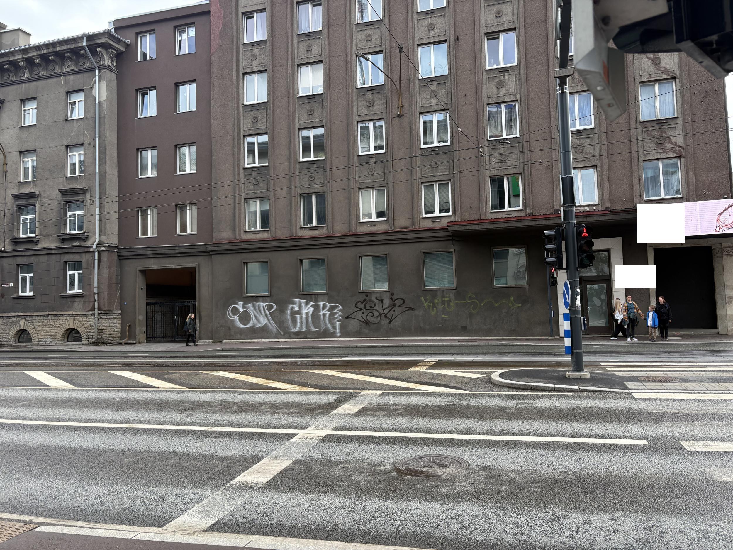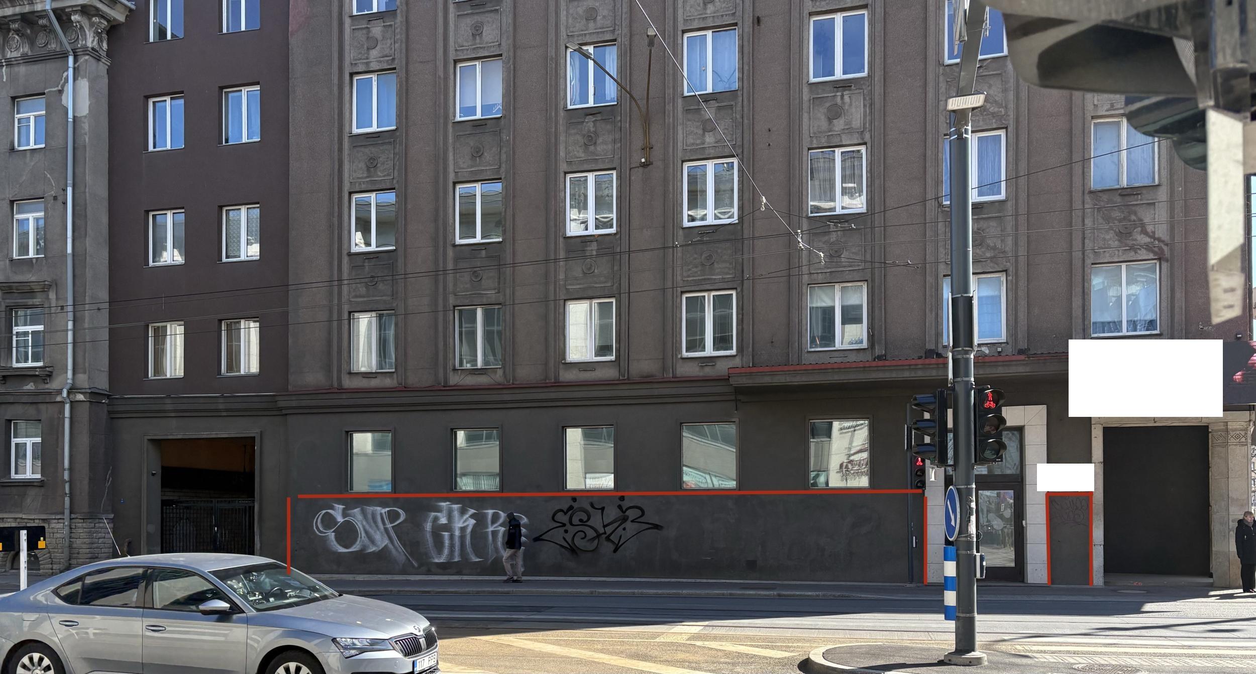 Värvitava seinaosa suurus on näha fotol. Kõrgus akende alla ca 2,2 m, Värvitava osa pindala ca 40 m2. Sisaldab ka uksest paremal olevat väikest grafitiga seinaosa.