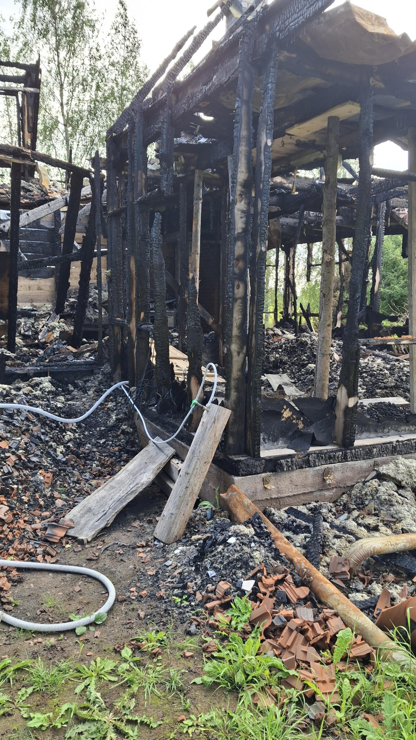 Põlenud puitkarkass hoone, ehitisealune pindala 84 m2, kivikatus.