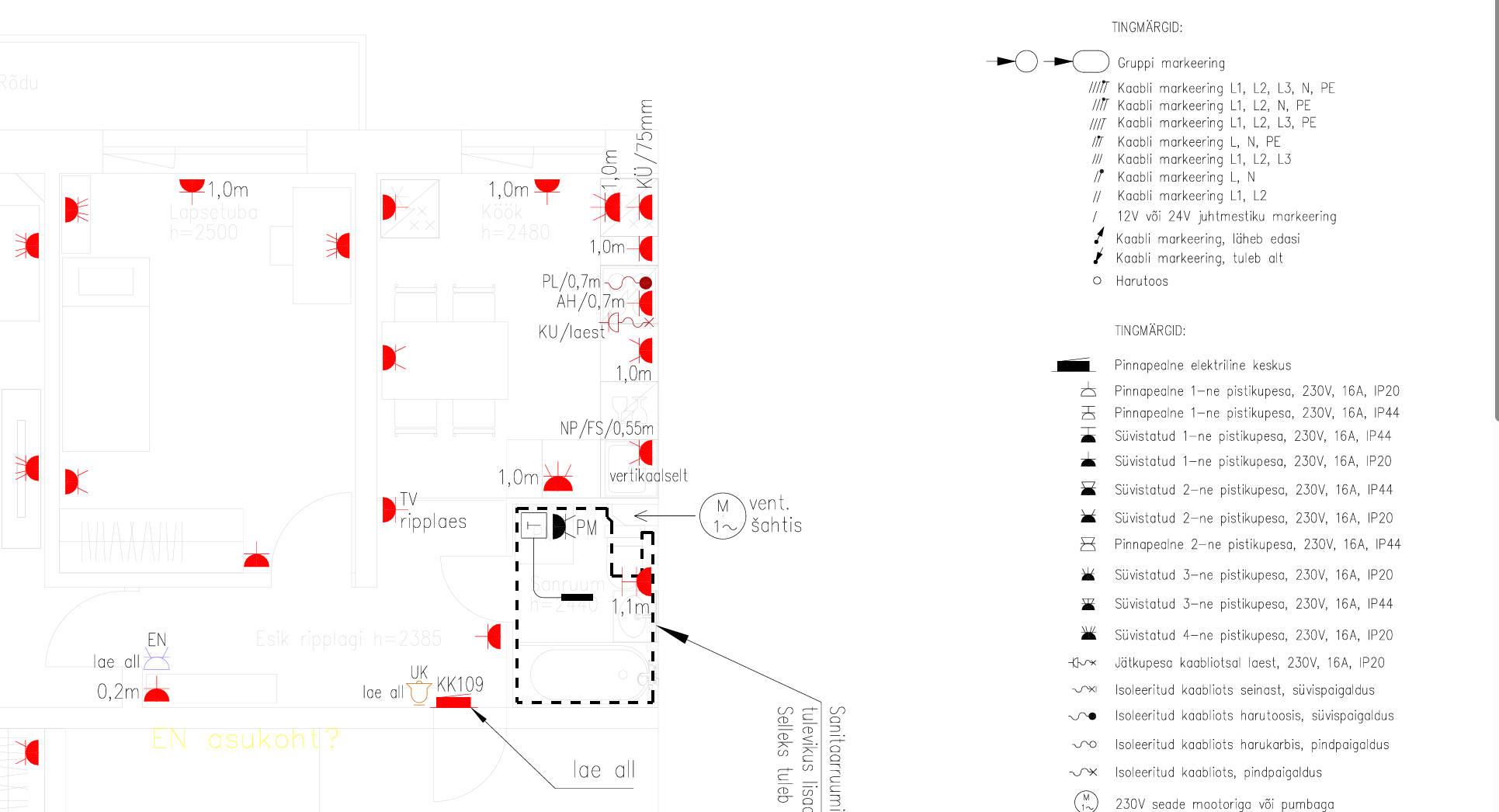 Indikatiivne pakkumine vastavalt olemasolevale infole. Olemasoleva info põhjal freesimist tuleks palju, ehk siis tuleb arvestada hilisema viimistluse taastamise jms. mis ei kuulu hinna sisse. Lae valgustite asukohta muuta oleks nt. keeruline (lae paneele ei tohi freesida). Pakkumises arvestatud kogu korteri elektrisüsteemi täisrenoveerimisega, poolikuid lahendusi tegema ei hakka. Tööde teostaja aitab kindlasti kaasa mõelda ning välja pakkuda tellija jaoks kõige parema ning optimaalsema lahenduse. Kuna nägemata on olukorda keerulise võitu hinnata siis seda nn. halli ala jääb, mida saab koha peal otsustada (eelkõige kaablite vedamise osas, võimaluste ja mahu mõttes). Hind on hetkel tehtud nn. tumedama stenaariumi põhiselt ning sellega peaks pigem hakkama saama (ei ole ka välistatud, et võimalik mõnevõrra alla tulla). KM. osa saame sobivalt kokku leppida. Kui täiendavaid lisaküsimusi, olen meeleldi valmis vastama. Hind sisaldab kõiki materjale va. lülitid, pistikud, valgustid. Paigaldamine hinnas. Edukat hanget soovides, HE. |