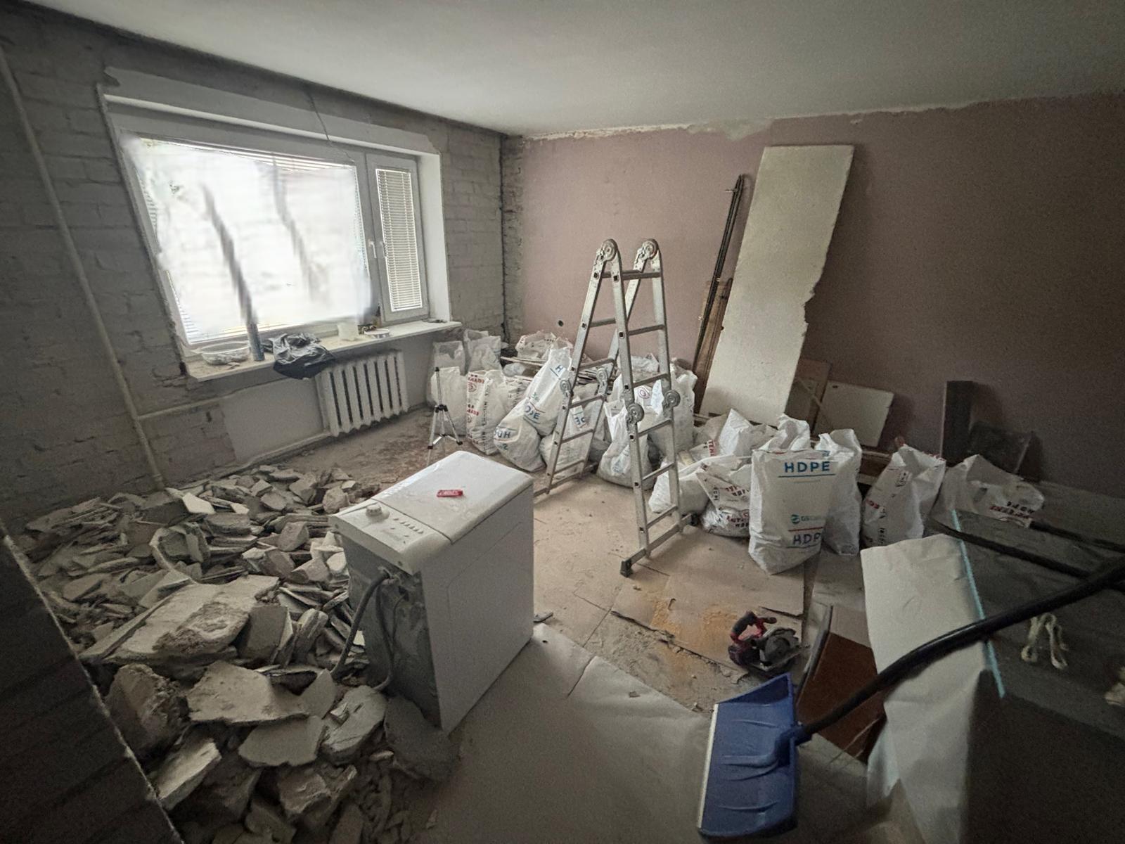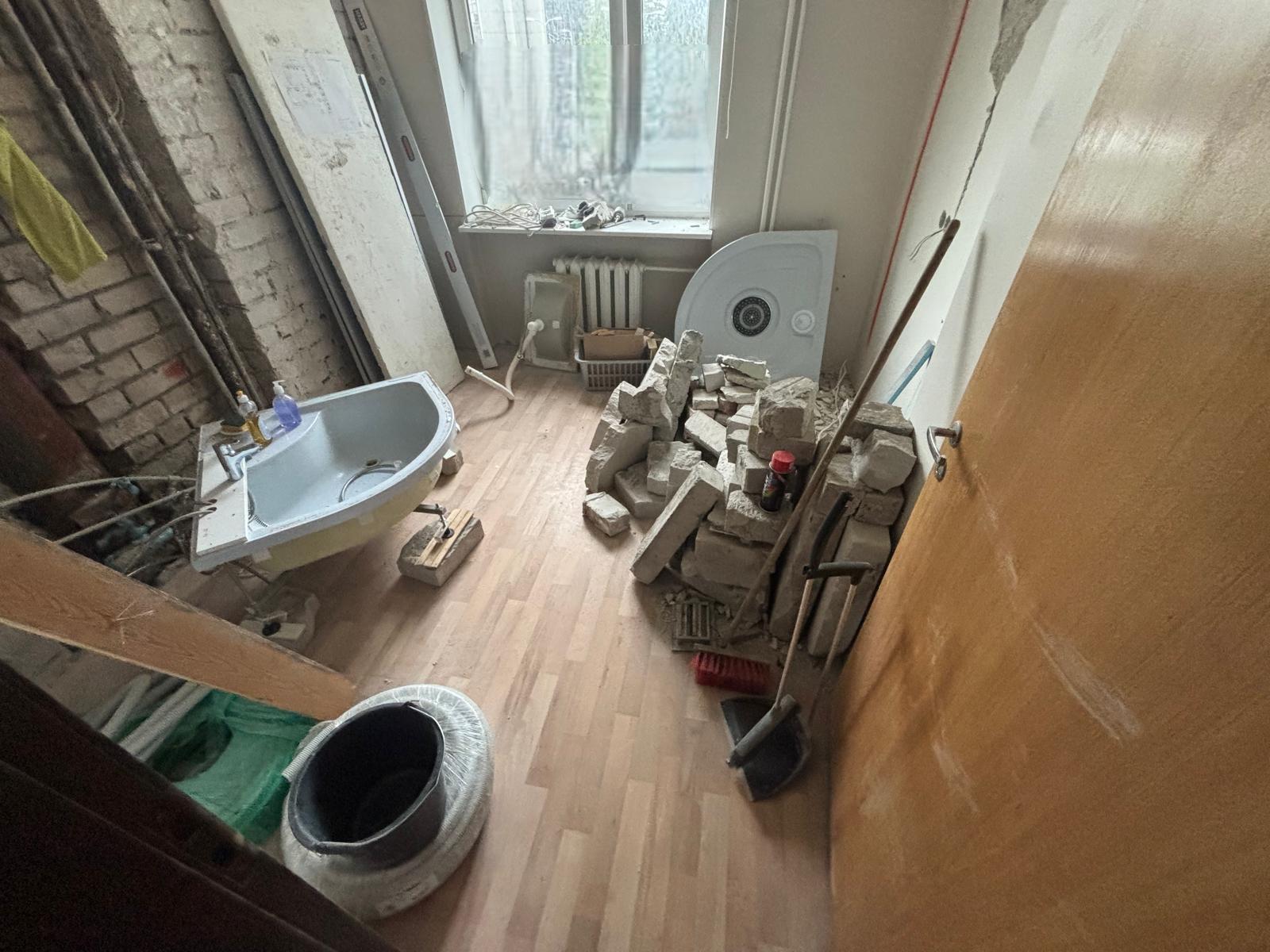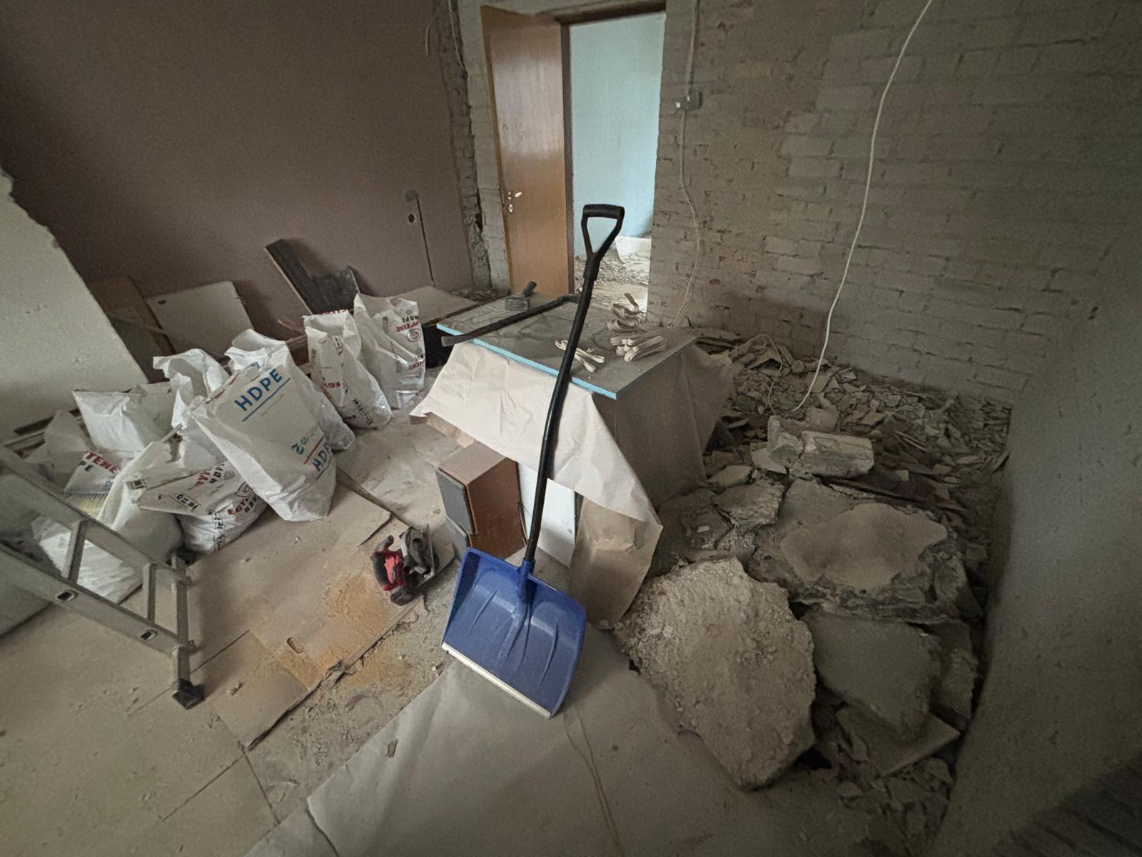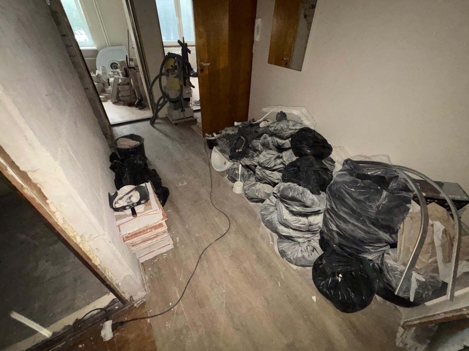 Tegemist on peamiselt krohvi ja kividega. Suurem osa jäätmeid on kottides. Asub kortermaja II korrusel, ilma liftita