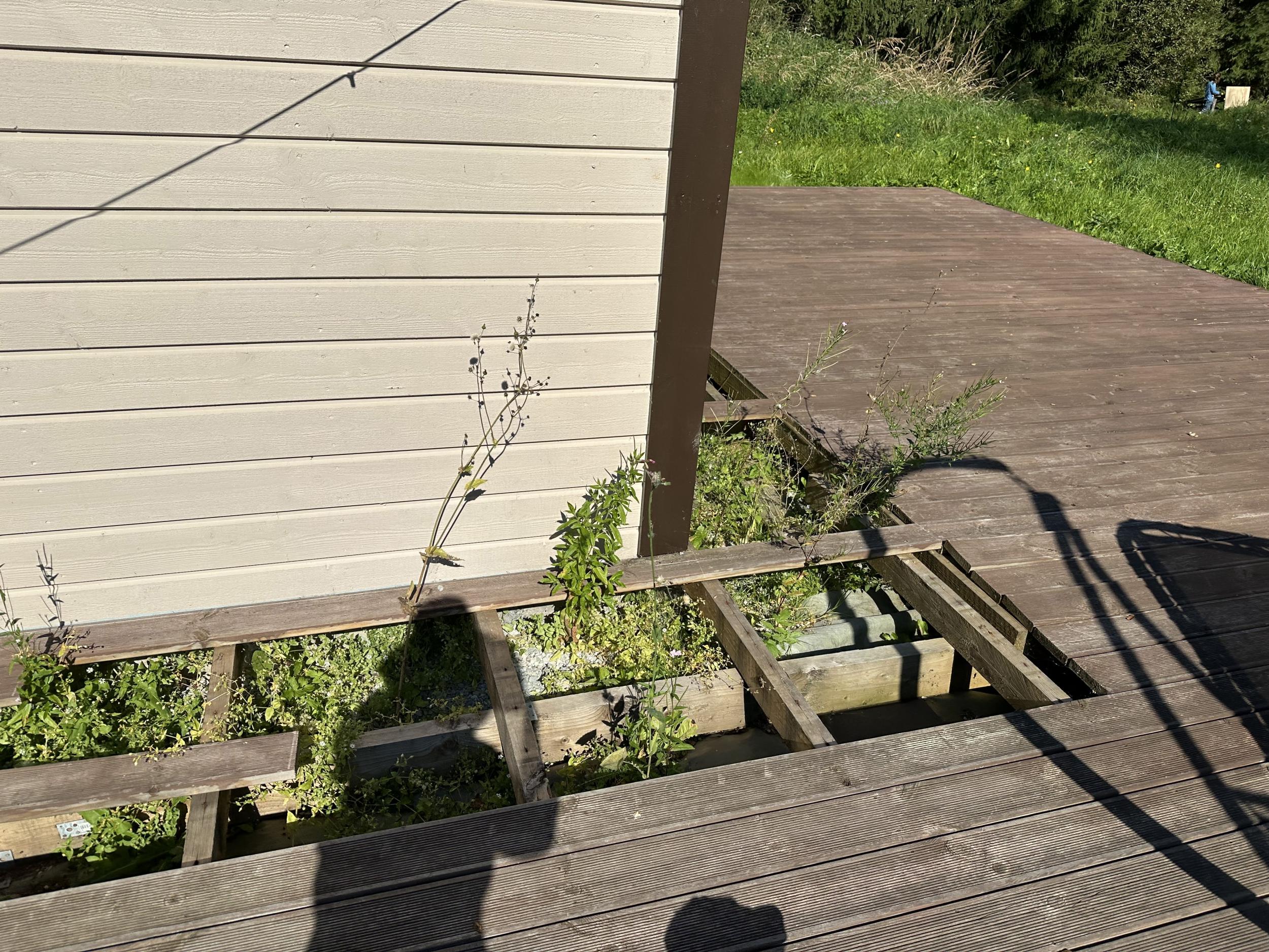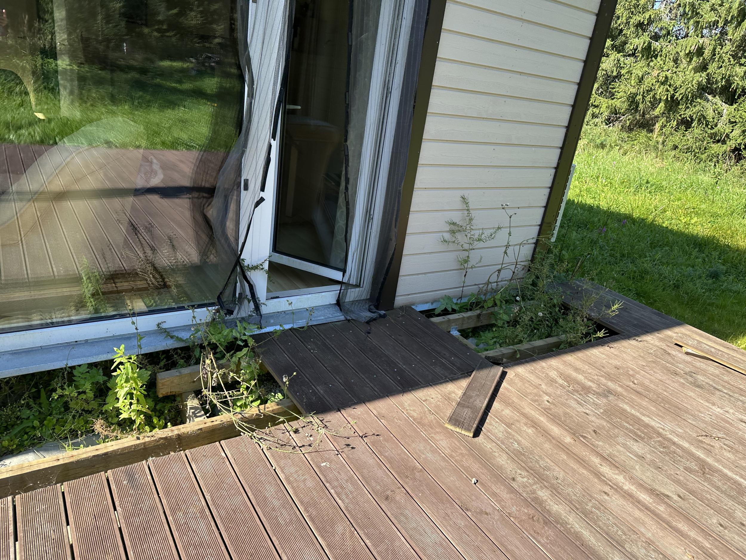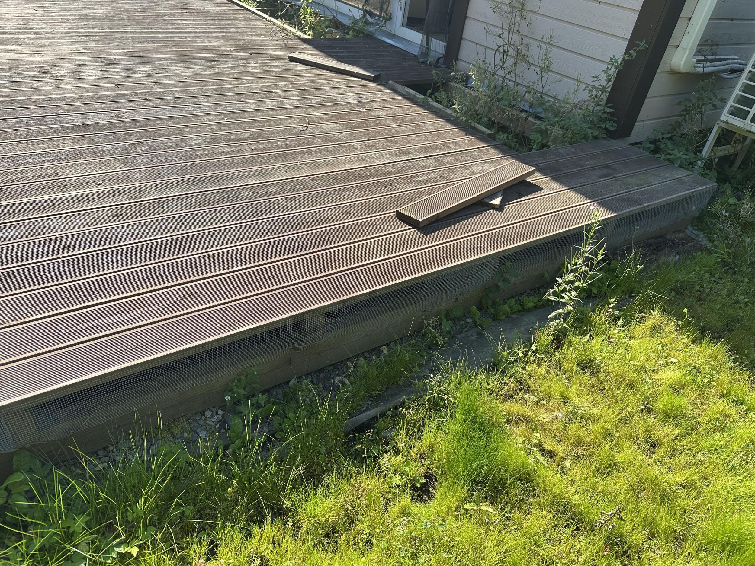 We needed to pull up the deck to protect mice from coming into the attic. Now we want it repaired and completed. Many boards need to be removed (see the video) and we need one side completed plus one step in front of the house. Would like it finished as well and protected from the winter.
