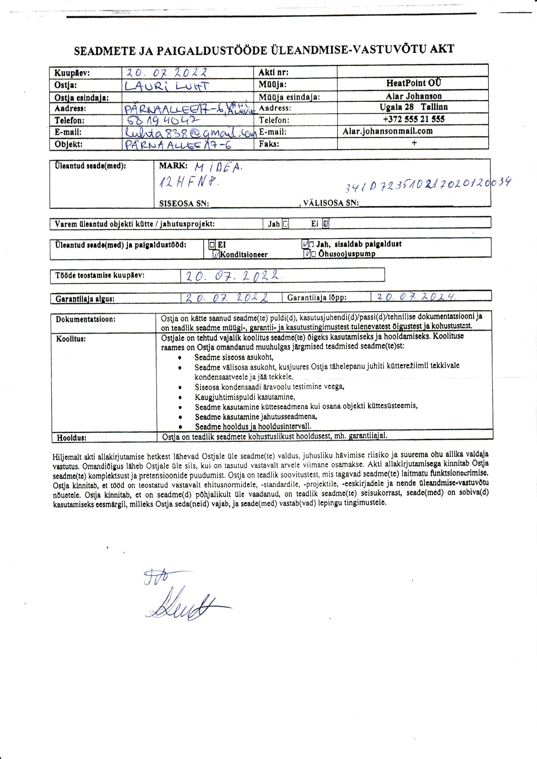 Tere. Tartus Pärna Allee sai paigaldatud 2022 aastal ridaelamu boksi jahutuse eesmärgil Midea konditsioneer ja oleks vaja nüüd see seadustada ehk teha projekt ja lisada/registreerida EHR-is.Paigaldusakt-ja mõned pildid lisatud paigaldatud seadmest ka ja elanike poolt saadud kirjalik nõusolek .