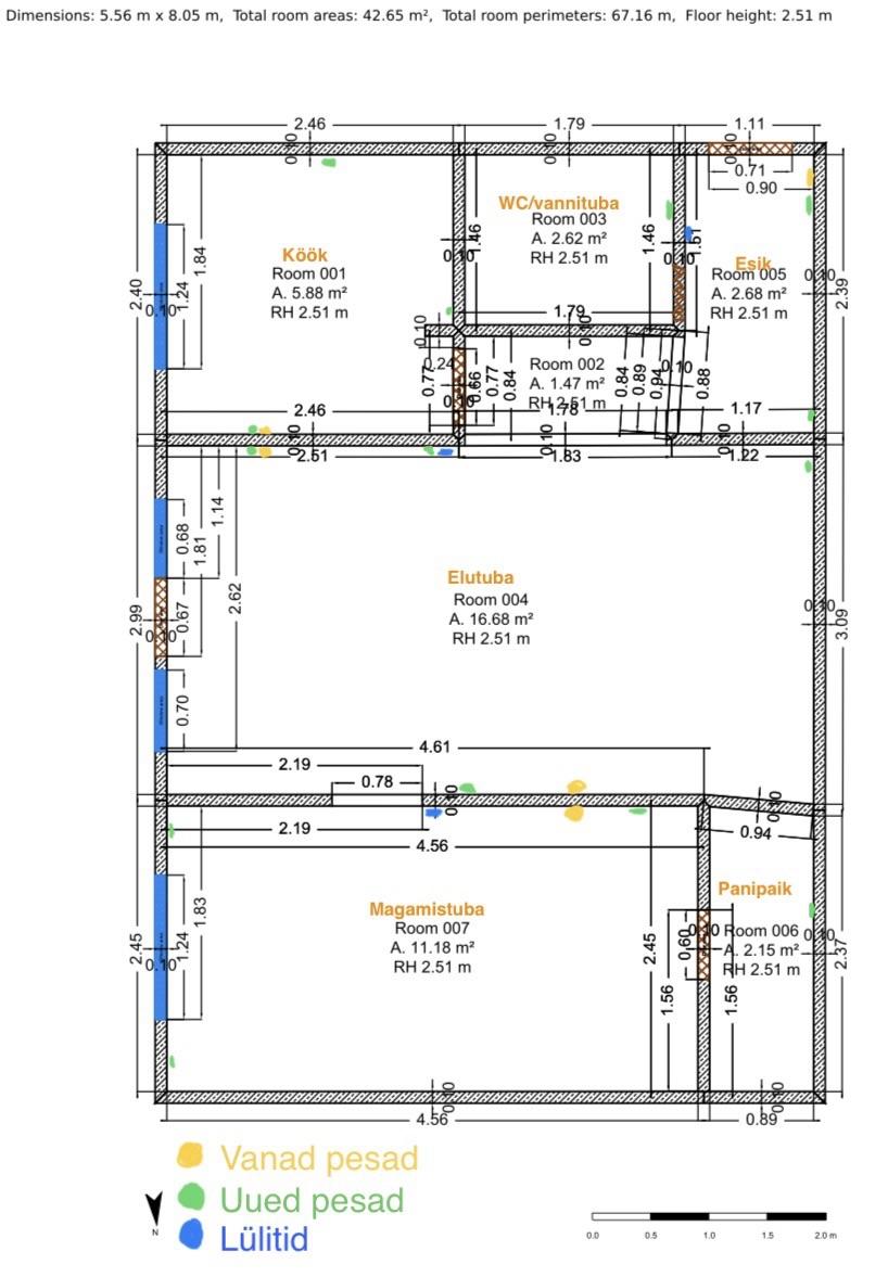 Lisan skeemi korteri plaanist, kus erinevate värvikoodidega märgitud ära praegused (vanad pesad), lülitid ja tulevaste pesade asukohad. Need pesad on nüüd umbmääraselt kirjas, kuid vähemalt on seinte mõõtkava enamvähem täpne..LIDAR skänneriga mõõdetud..
