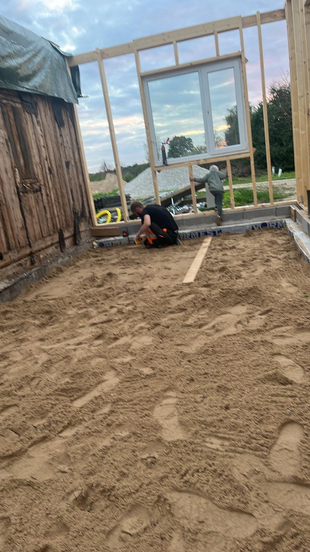 Enamus liiva sisse veetud, vaja oleks tasandada,natuke täita veel ja loodi. Pinna suurus u 85 ruutmeetrit. Edasi aluskile, EPS, kile, armatuur ja armatuuri peale põrandakütte torud. Kõik materjal ja ka vibraplaat meie poolt.