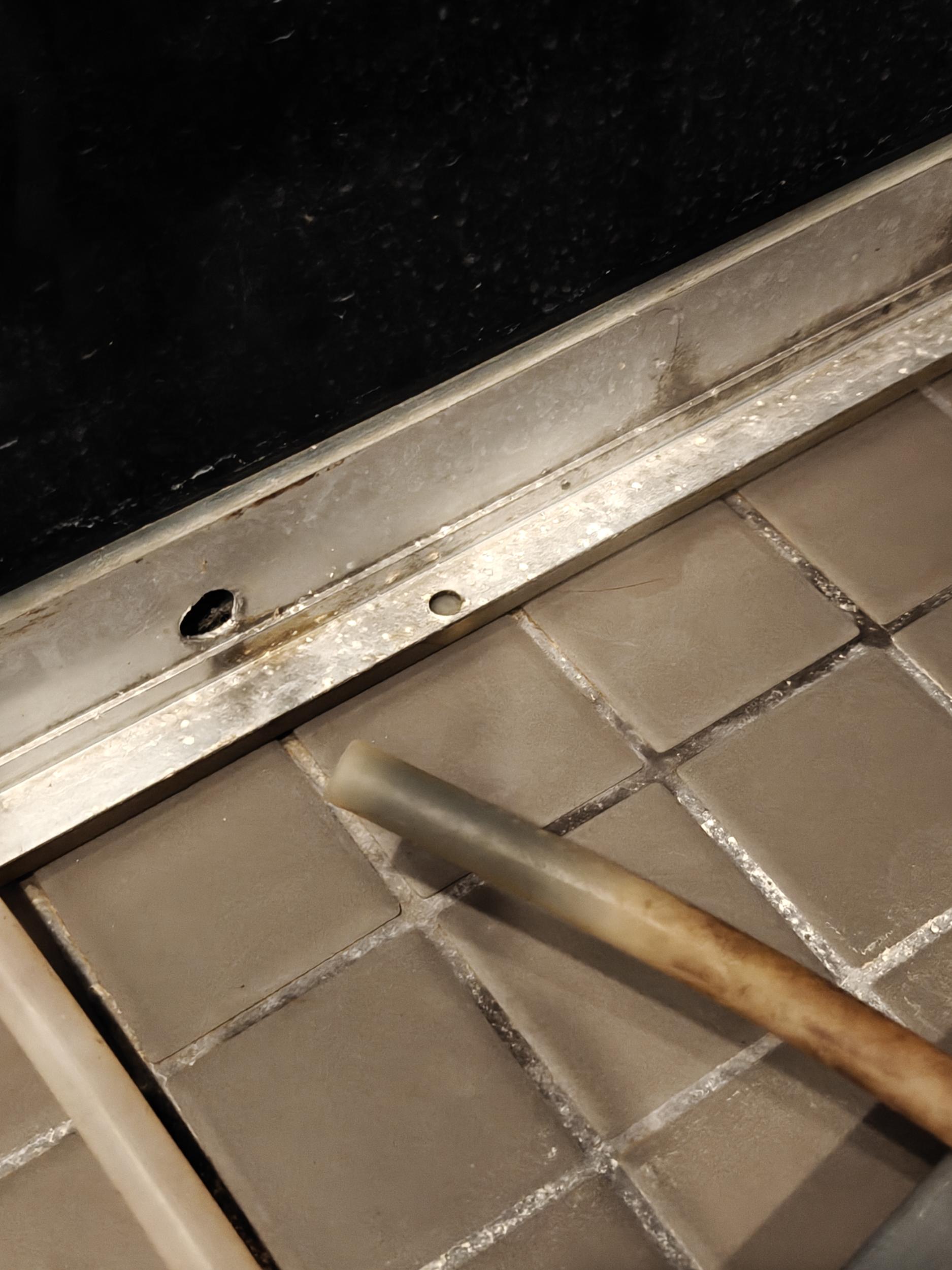 Sellel dušil on kaks plasttoru, mis on äravoolu sisse viidud ja juhivad vee ära, kuni see saavutab õige temperatuuri ja hakkab dušiotsikust välja voolama. Paar päeva tagasi märkasime, et ühest torust hakkas veidi vett lekkima, ja täna tuli see lahti ning hakkas vett igale poole pritsima. Lõpuks surus toru surve tõttu sissepoole. Toru teine ots peab olema dušiseadme juhtpaneeli taga, kuid sellele on raske ligi pääseda.