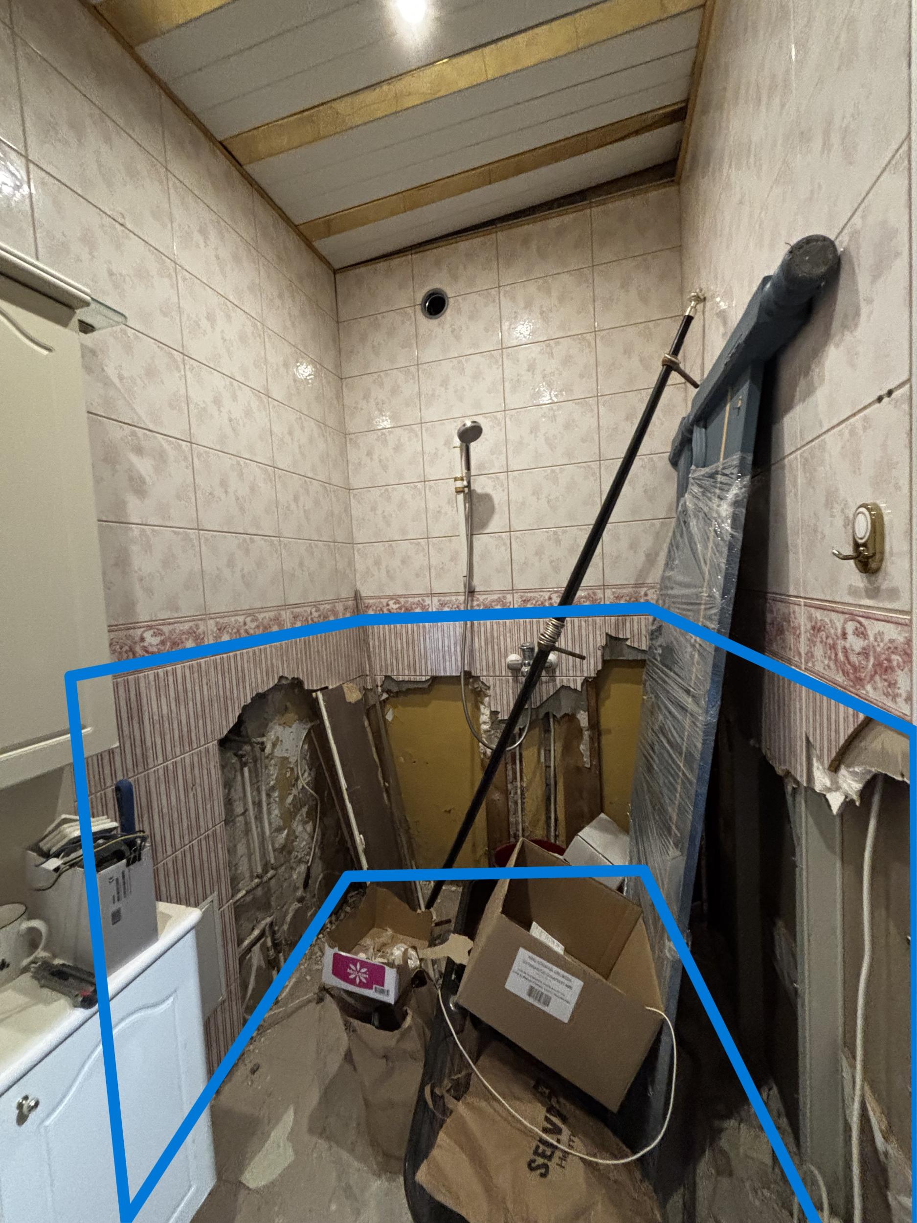 2. Kõikide vannitoa seinte uuendamine (joonisel markeeritud sinise joonega). Uuendatakse vaid seina alumine osa põrandast kuni kahhelkivi porteni, mis piltidel on näha tumedamat värvitooni seinaosa (põrandalt 150 cm kõrguseni). Portest ülespoole jäävad seinosad jääb praegusesse seisu.