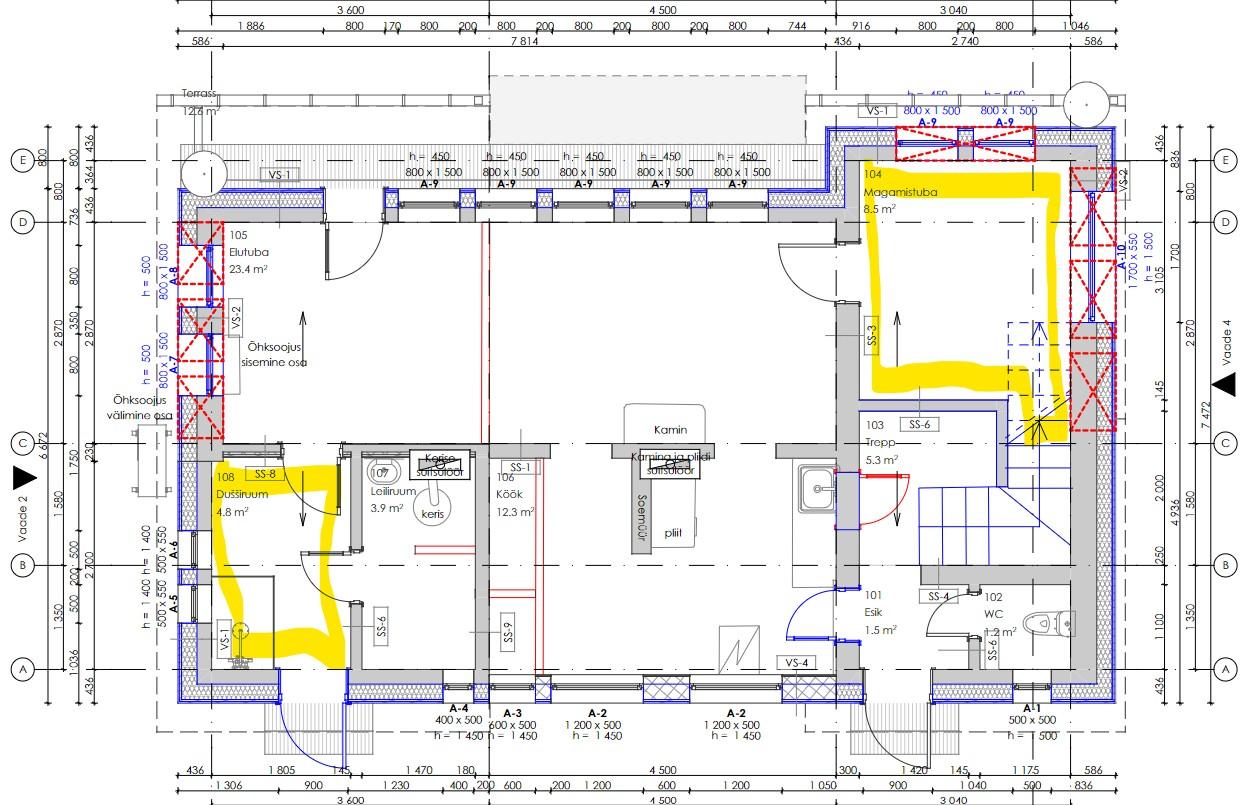 4. (kollasega märgitud suurem ruum projektil) OSB peale põrandasoojustuse valamine ja põranda plaatimine 9m2. Osb all on puitroovitus mille vahel PUR. Selle all betoonpõrand.