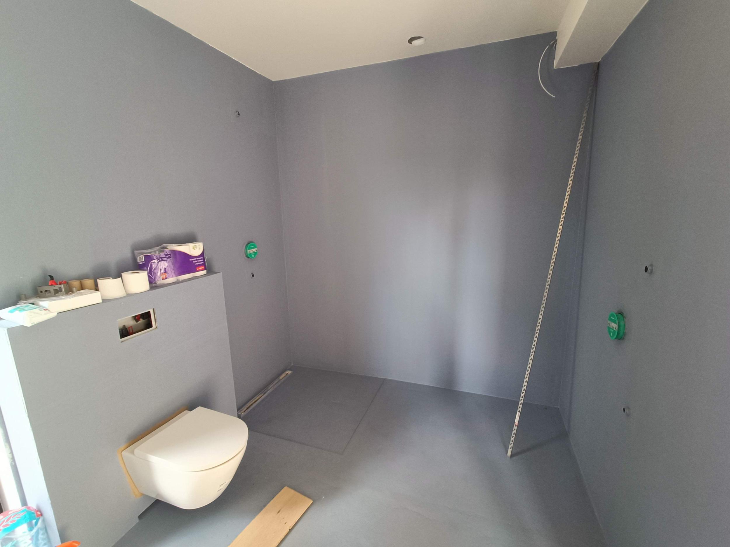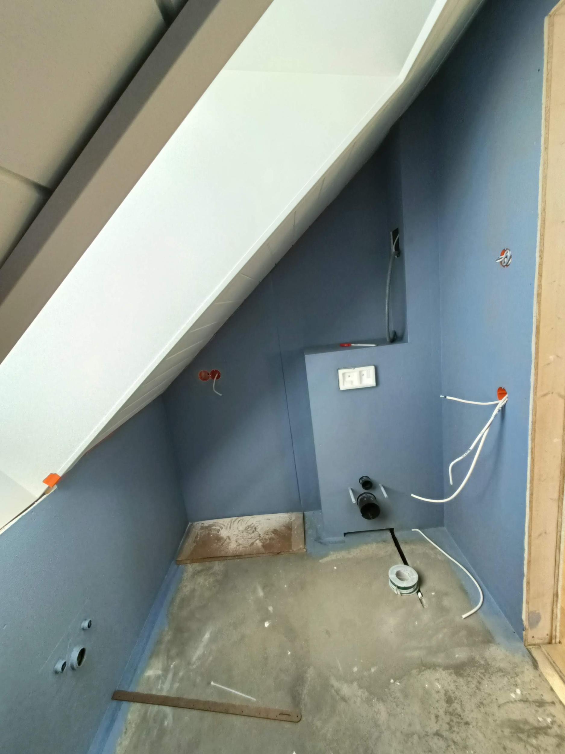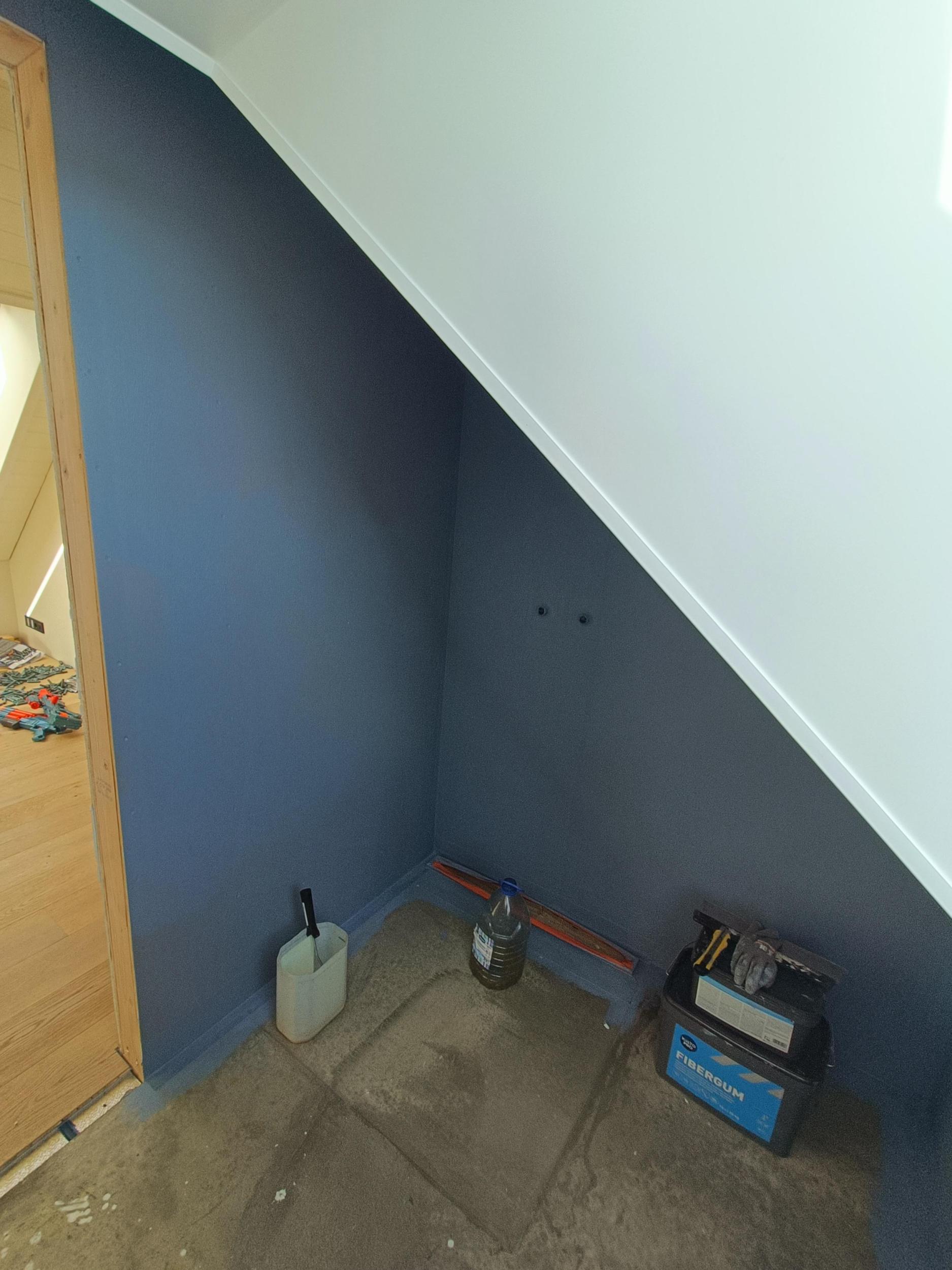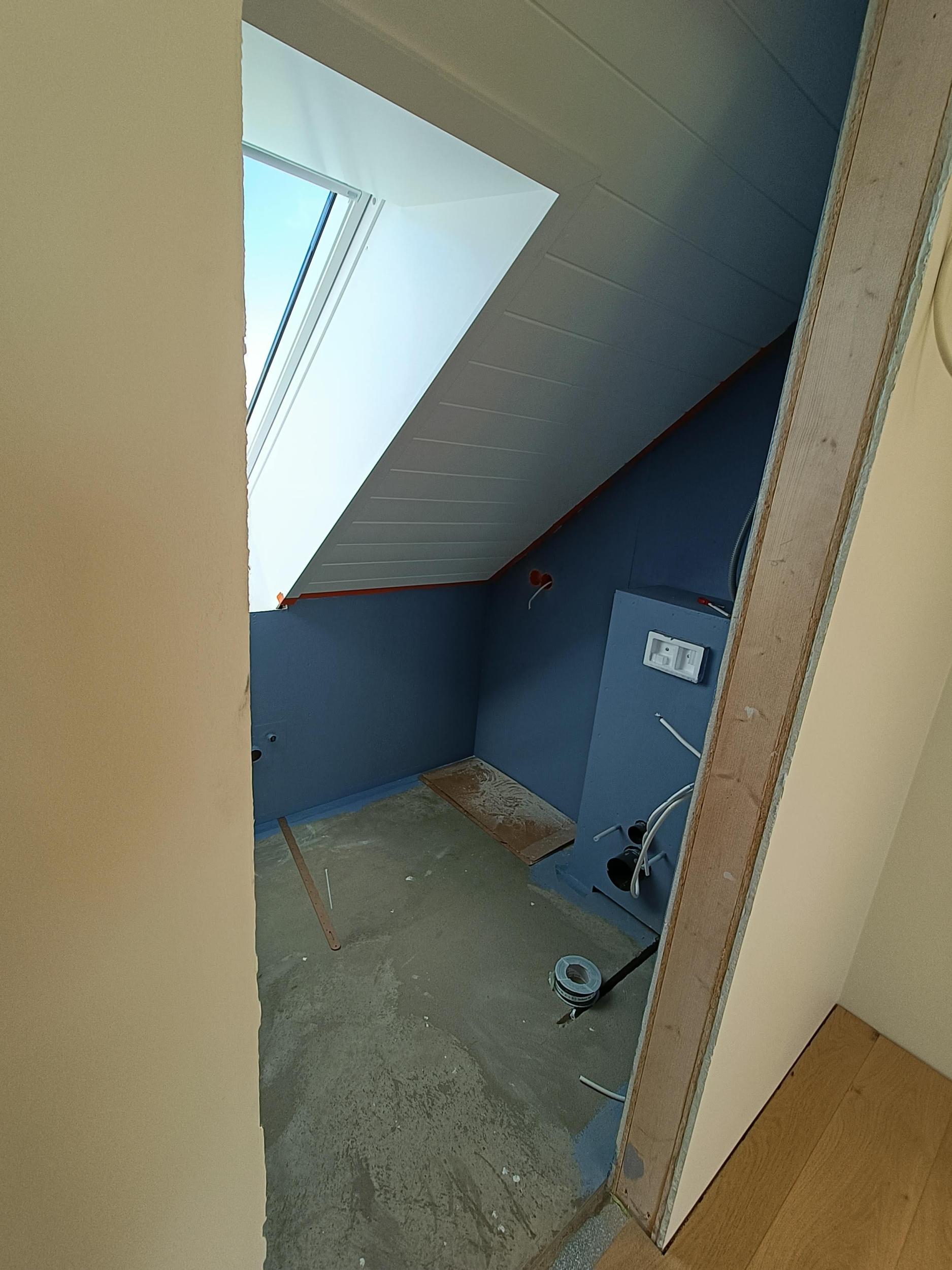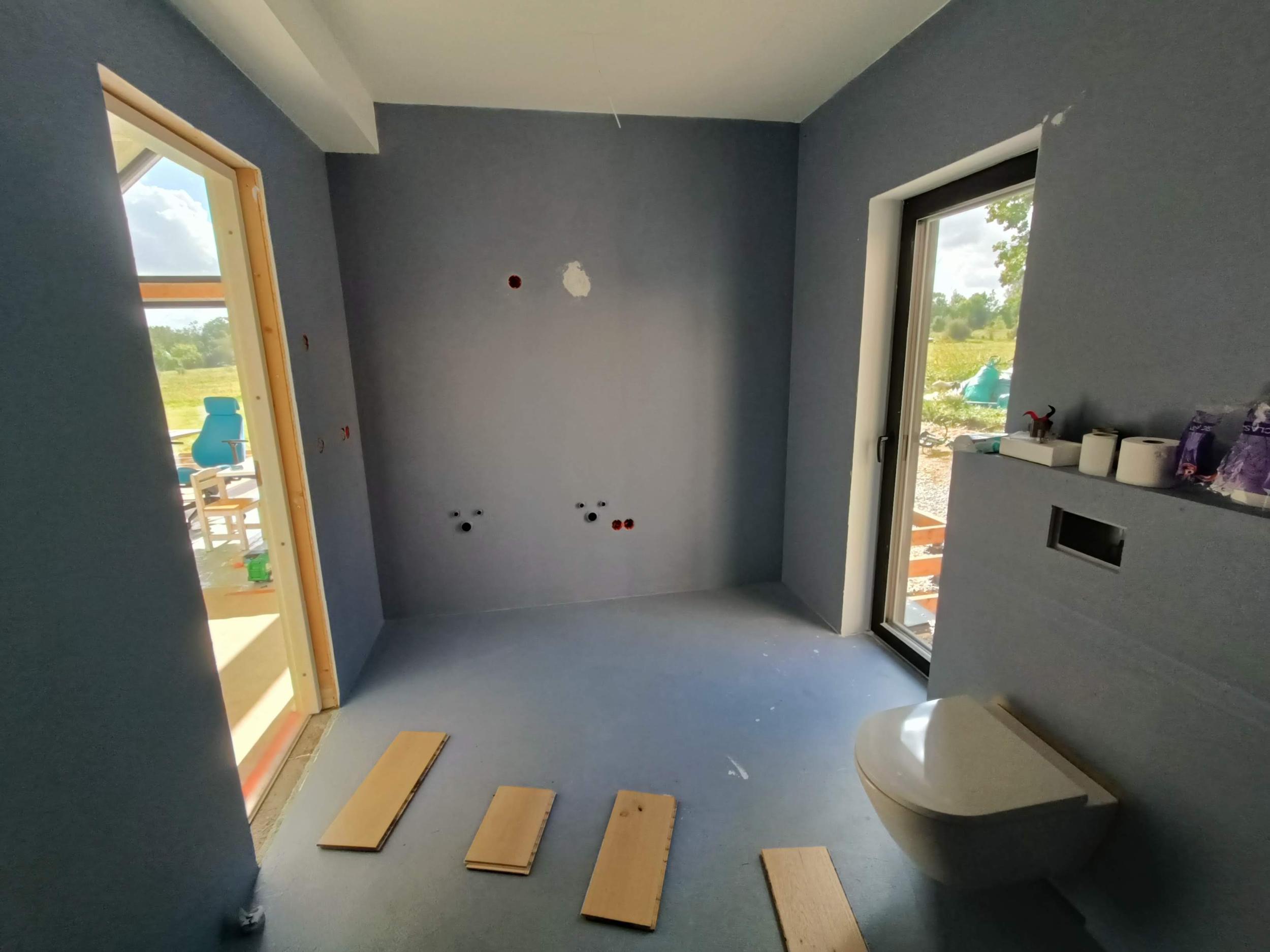 Ülemise korruse vannituba. Põrand ~ 4,7m2. Seinad ~11m2. Plaadi suurus 90x90cm. Piltidel veetõke veel põrandal tegemata, kuid see saab plaatimise ajaks tehtud.