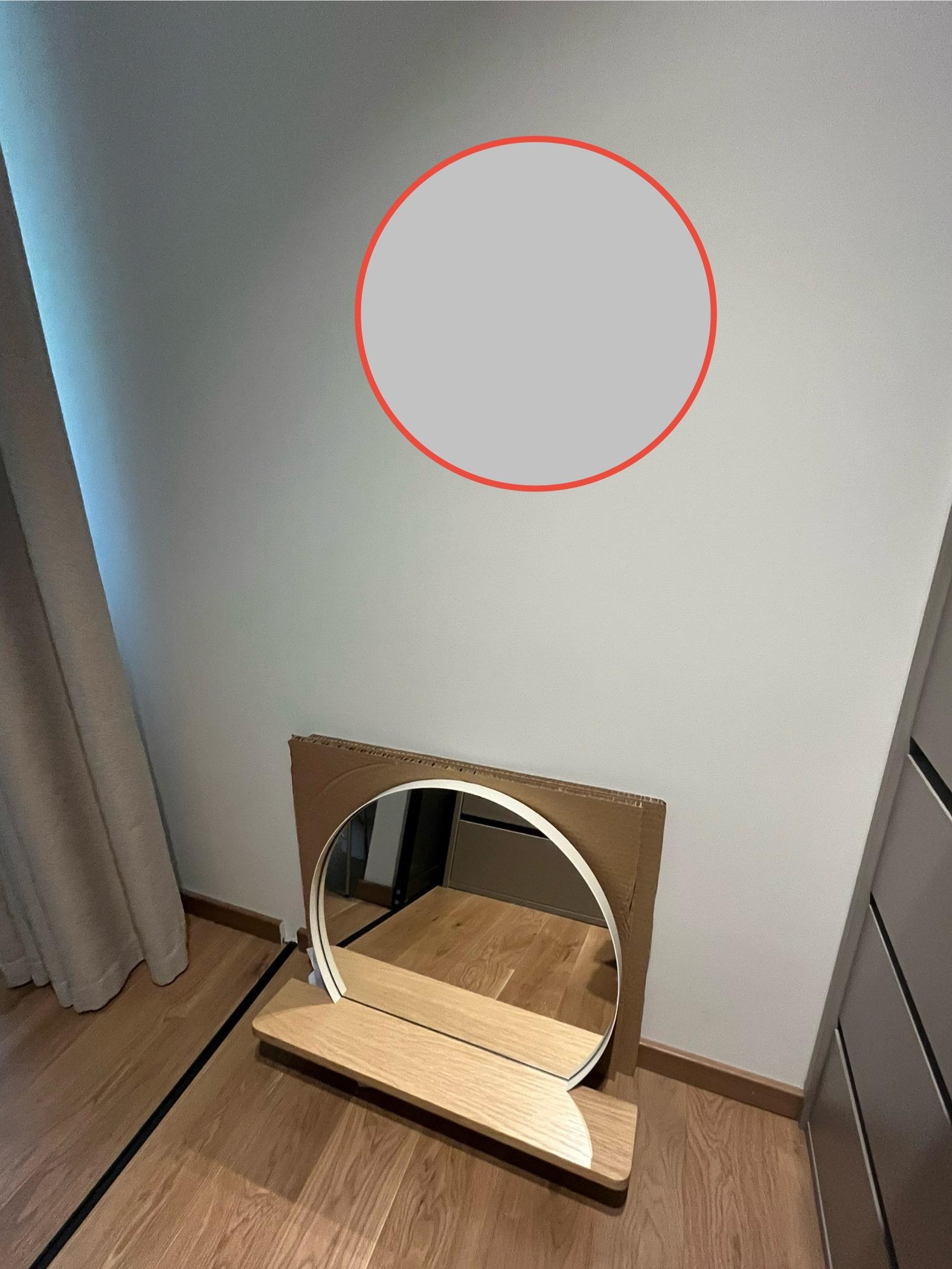 Pakkumine on tehtud vastavalt töö sisule. Puurin seina 2 ava tüüblite jaoks ja riputan peegli kruvide otsa. |