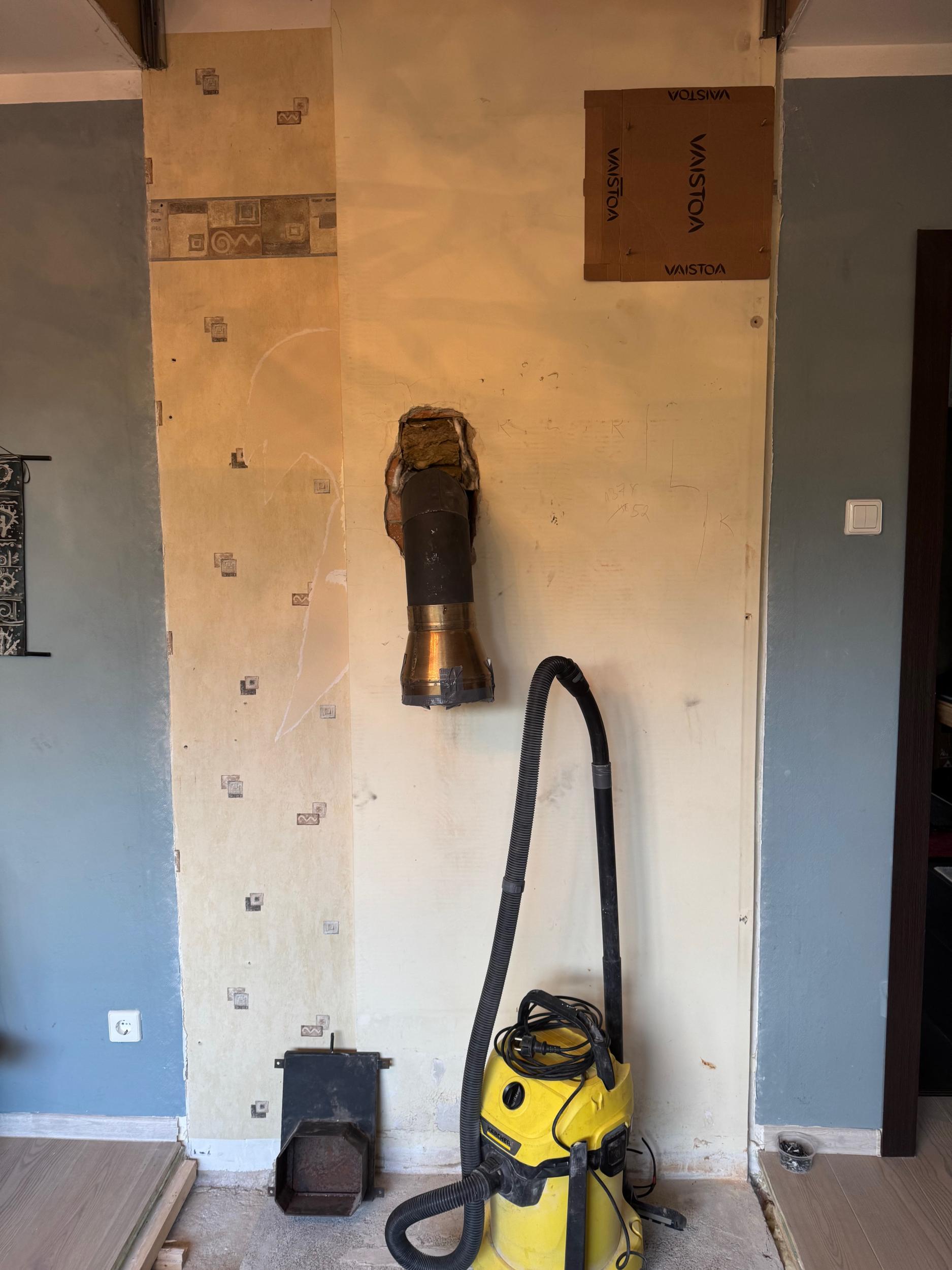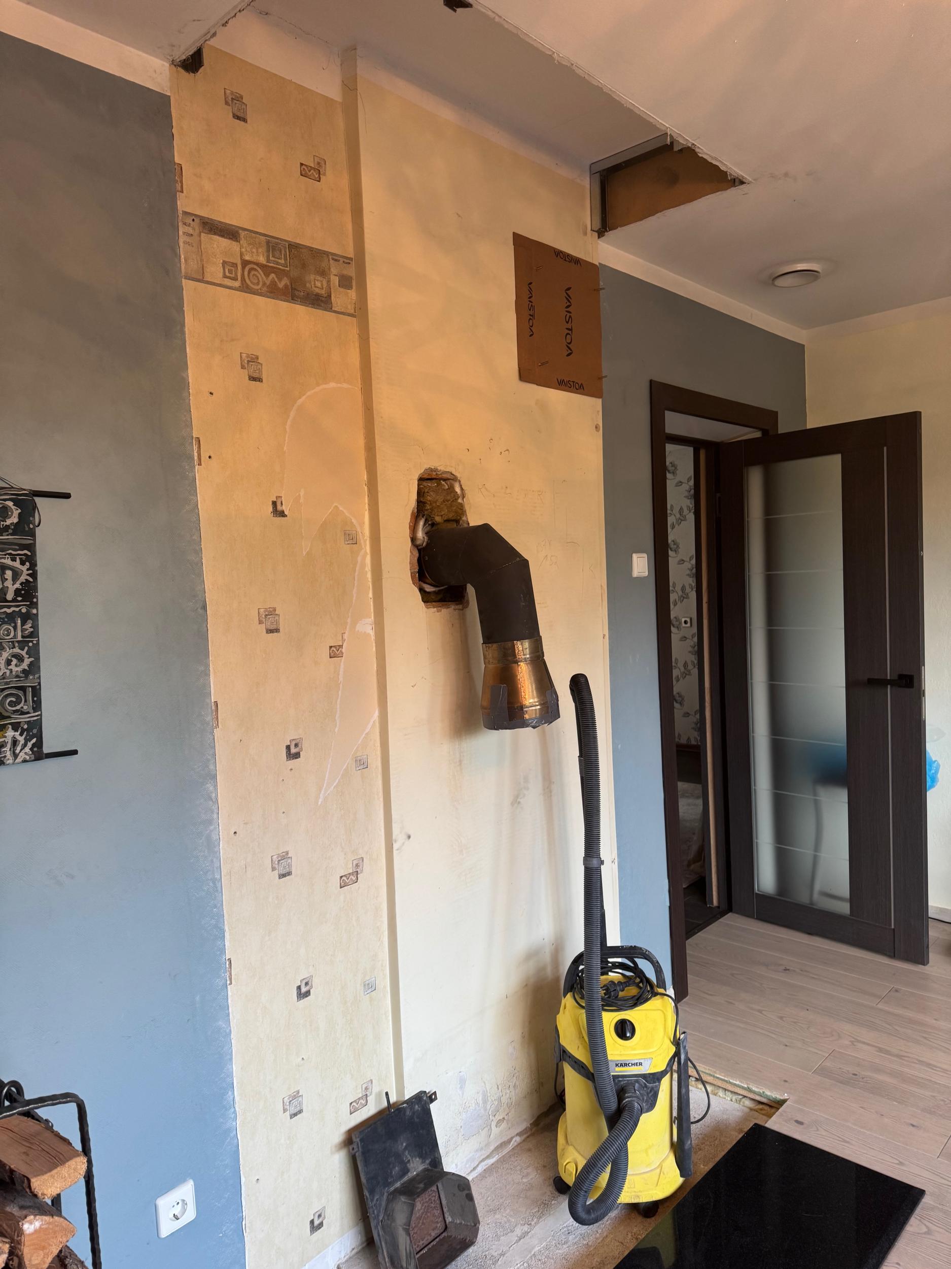Meile paigaldatakse moodulahi. Uue ahju laius on 91cm ja sügavus on 61 cm. Eeltöödest on vaja teha armeeritud betoonalus uue ahju paigaldamiseks. Aluse mõõdud on ligikaudu laius 130 cm x sügavus 72 cm ja paksus 11,5 cm ning see ulatub 5 cm ahju ette (pildil märgitud teibiga). Olemas on korralik vana ahju alus, kuid selle mõõdud ei ole uuele ahjule õiged . Olemasolev alus tõenäoliselt vähendab vajaliku betooni kogust.