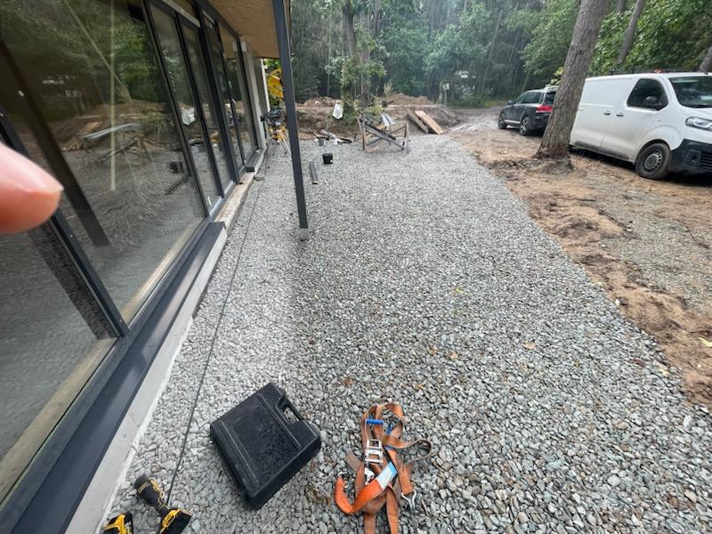 Tänavakivi paigaldus umbes 30-35m2. Aluspind on killustikuga tihendatud. Vaja oleks siis teha liiva/paekivituhaga aluspadi, kivide ladumine ning metallriba piire kolmest küljest - 20jm. Neljas külg oleks vastu maja vundamenti.