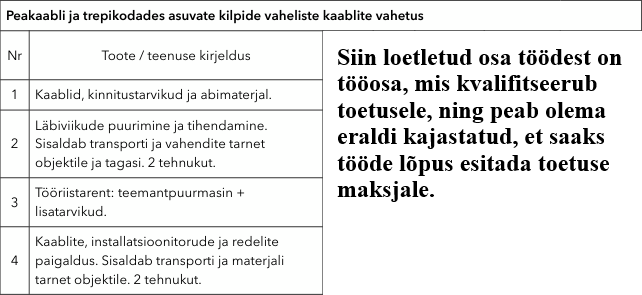 1. TOETUSE OSA eraldi. Pakkumises ja arvel näidata toetusele kvalifitseeruv töö eraldi plokina/alamsummana; arveread peavad peegeldama pakkumise ridu. Viide: pilt “Tööosa mis kvalifitseerub toetusele” manuses.