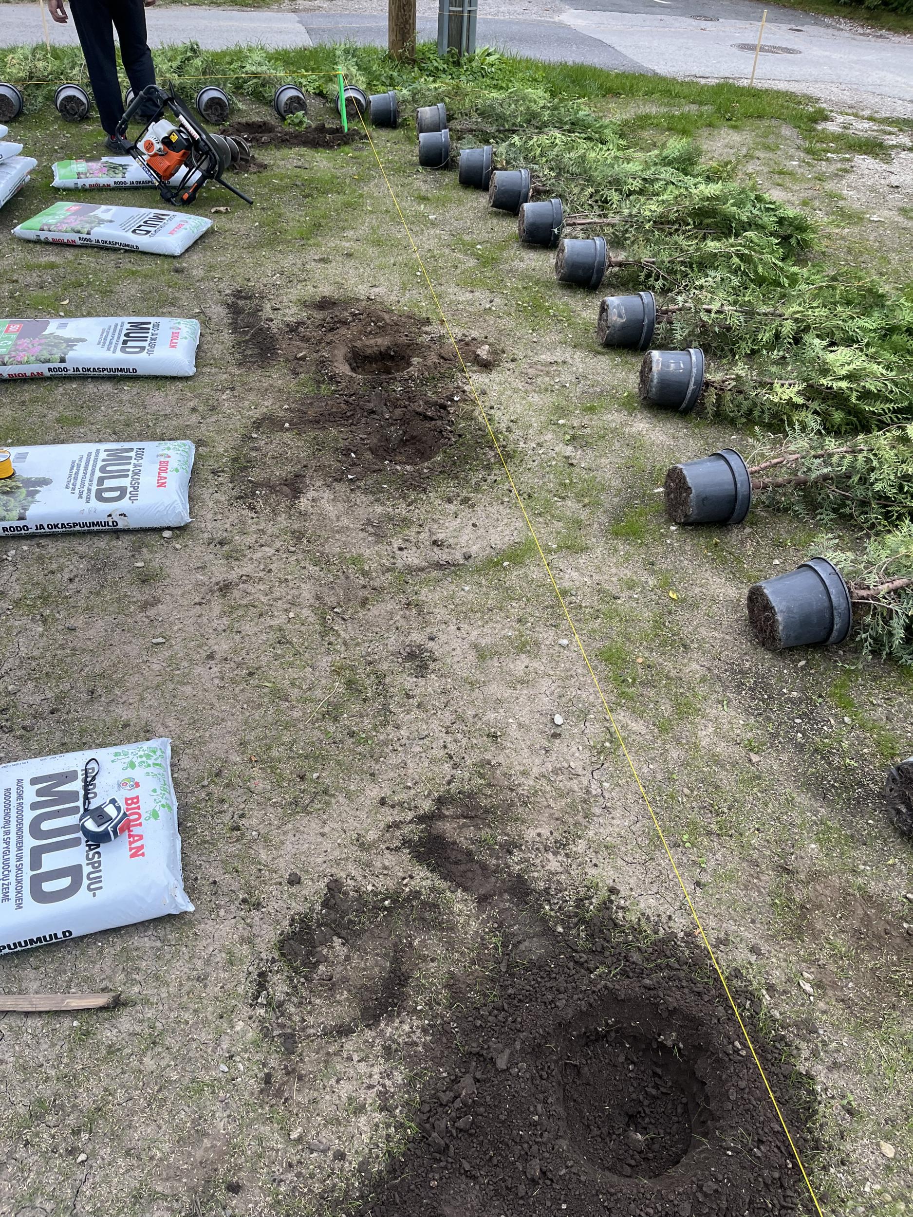 Tuleks kaevata/puurida 30-40cm laiune kraav elupuudele, mulla all olev pinnas on varem olnud kruusatee niiet suhteliselt sitke,pildil olev pinnasepuur läbi ei läinud.