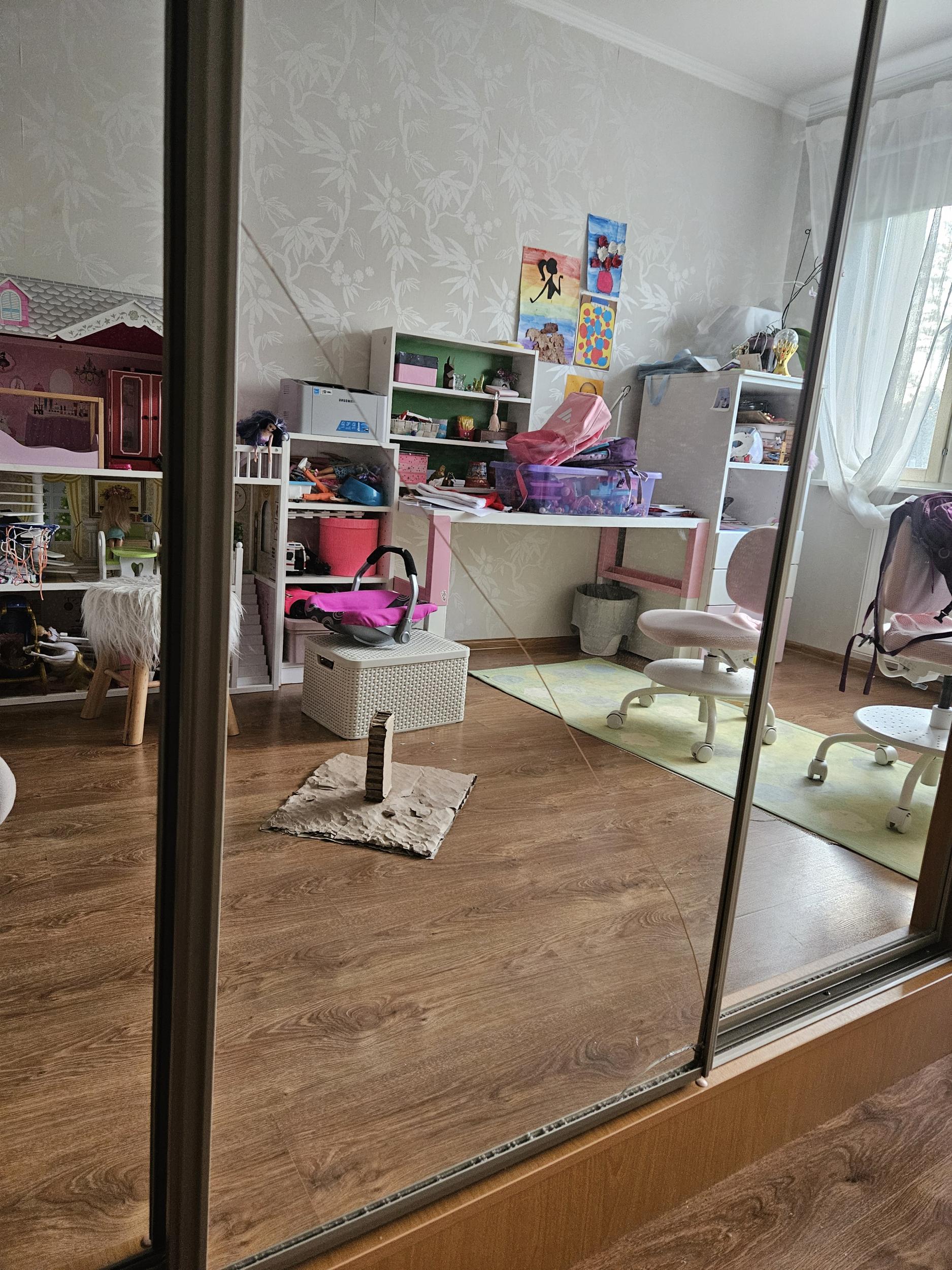 Üks peegelklaasi nurk on katki, keskelt jookseb joon läbi.
