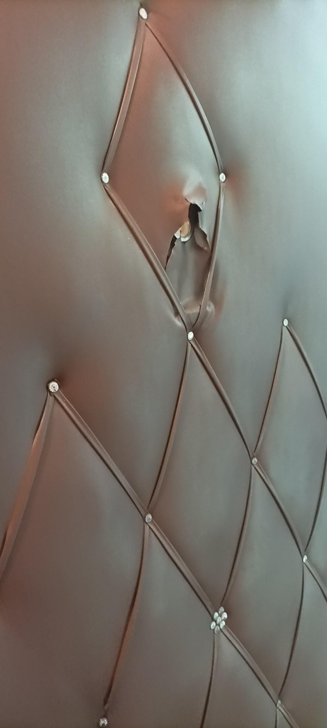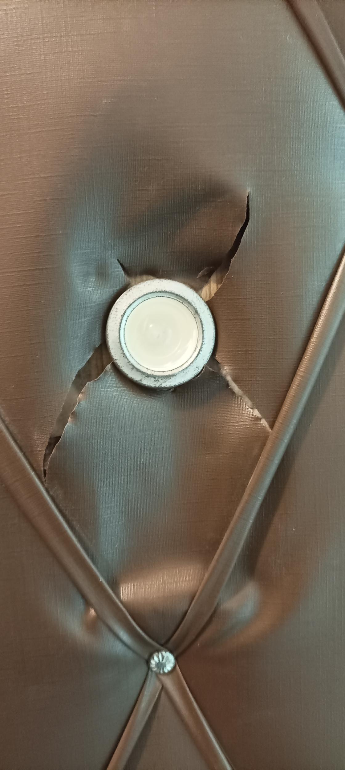Vaja oleks parandada välisukse nahkpolster. See on rebenenud uksesilma juurest, nagu fotol näha. Ehk siis vaja oleks samasugust pruuni vanaaegset välisukse kunstnahka ja veidi pehmest täidist sinna alla.
