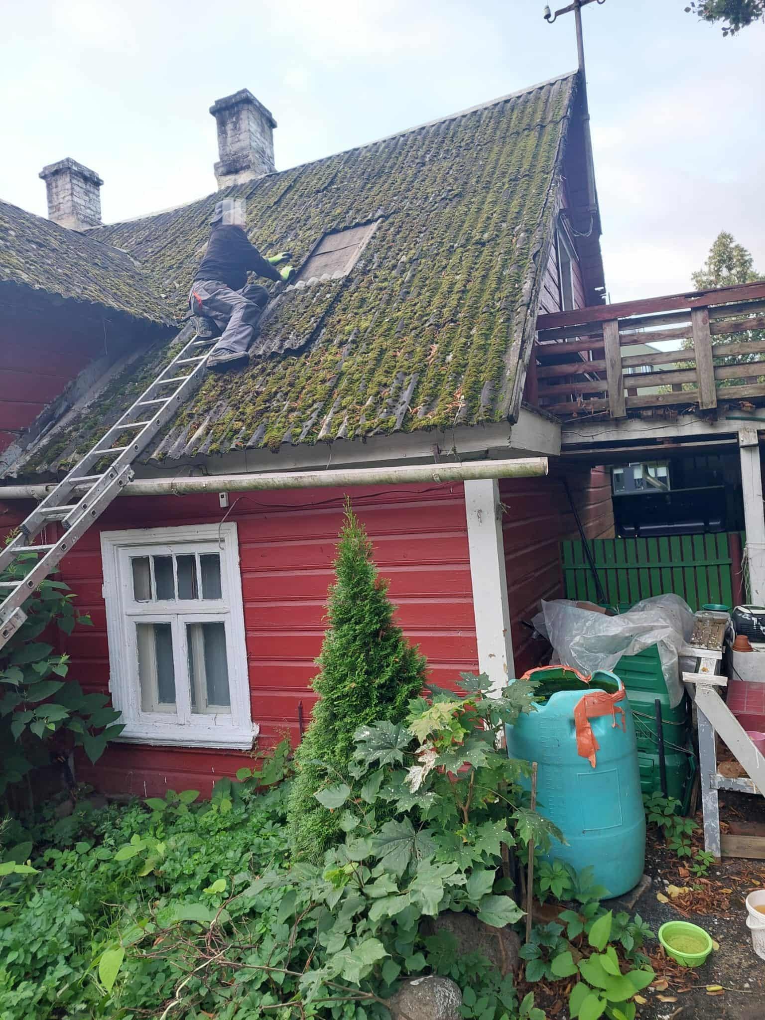 Katuse pinda u 170 m2 kokku. Vana eterniitkatuse eemaldamine, utiliseerimine. Katusel eterniidi all täislaudis millel on vana rõberoid peal see jääb alles. Uut tuleks sellele peale hakata tegema. Uue katuse paigaldamine eterniit helehall ( plaat võiks olla u 1000 x 1130 liiga väikest ei soovi ja liiga suurt ka mitte), ääre ja harjaplekid. Katuse paika rihtimine ,roov, aluskate jne. Vihmavee rennid (räästad esialgu ainult). Tuulekastid. Majal 2 korstent need sooviks ka värskendada- krohvimine vms. Katuseredel ja korstnate vahele käigutee. Ühesõnaga täiskomplekt. Ühel pildil olev aknaga väike vintskapi osa jääb alles see vajab ka värskendamist. Tööde algus kokkuleppel.